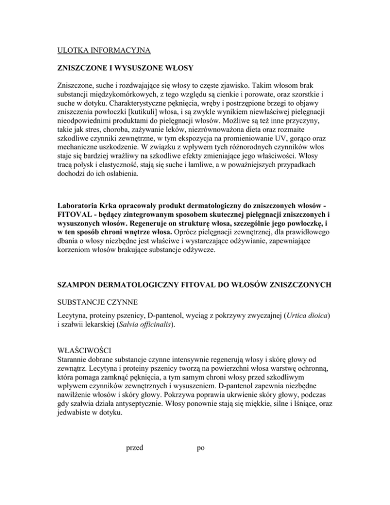 ULOTKA INFORMACYJNA ZNISZCZONE I WYSUSZONE WŁOSY Zniszczone, suche i rozdwajające się włosy to częste zjawisko. Takim włosom brak substancji międzykomórkowych, z tego względu są cienkie i porowate, oraz szorstkie i suche w dotyku. Charakterystyczne pęknięcia, wręby i postrzępione brzegi to objawy zniszczenia powłoczki [kutikuli] włosa, i są zwykle wynikiem niewłaściwej pielęgnacji nieodpowiednimi produktami do pielęgnacji włosów. Możliwe są też inne przyczyny, takie jak stres, choroba, zażywanie leków, niezrównoważona dieta oraz rozmaite szkodliwe czynniki zewnętrzne, w tym ekspozycja na promieniowanie UV, gorąco oraz mechaniczne uszkodzenie. W związku z wpływem tych różnorodnych czynników włos staje się bardziej wrażliwy na szkodliwe efekty zmieniające jego właściwości. Włosy tracą połysk i elastyczność, stają się suche i łamliwe, a w poważniejszych przypadkach dochodzi do ich osłabienia. Laboratoria Krka opracowały produkt dermatologiczny do zniszczonych włosów FITOVAL - będący zintegrowanym sposobem skutecznej pielęgnacji zniszczonych i wysuszonych włosów. Regeneruje on strukturę włosa, szczególnie jego powłoczkę, i w ten sposób chroni wnętrze włosa. Oprócz pielęgnacji zewnętrznej, dla prawidłowego dbania o włosy niezbędne jest właściwe i wystarczające odżywianie, zapewniające korzeniom włosów brakujące substancje odżywcze. SZAMPON DERMATOLOGICZNY FITOVAL DO WŁOSÓW ZNISZCZONYCH SUBSTANCJE CZYNNE Lecytyna, proteiny pszenicy, D-pantenol, wyciąg z pokrzywy zwyczajnej (Urtica dioica) i szałwii lekarskiej (Salvia officinalis). WŁAŚCIWOŚCI Starannie dobrane substancje czynne intensywnie regenerują włosy i skórę głowy od zewnątrz. Lecytyna i proteiny pszenicy tworzą na powierzchni włosa warstwę ochronną, która pomaga zamknąć pęknięcia, a tym samym chroni włosy przed szkodliwym wpływem czynników zewnętrznych i wysuszeniem. D-pantenol zapewnia niezbędne nawilżenie włosów i skóry głowy. Pokrzywa poprawia ukrwienie skóry głowy, podczas gdy szałwia działa antyseptycznie. Włosy ponownie stają się miękkie, silne i lśniące, oraz jedwabiste w dotyku. przed po PRZED: Lecytyna i proteiny pszenicy tworzą warstwę ochronną na powierzchni zniszczonego włosa, która, na skutek powstałych pęknięć i wystrzępionych brzegów, jest szorstka. PO: Włosy znowu gładkie i lśniące. SPOSÓB UŻYCIA Nałożyć na mokre włosy i wmasować w skórę głowy. Pozwolić szamponowi działać przez trzy minuty, następnie dokładnie spłukać. W razie potrzeby czynność powtórzyć. Używać do regularnego mycia włosów zniszczonych i suchych.