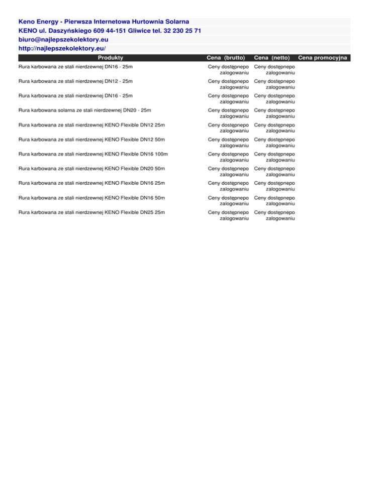 Keno Energy - Pierwsza Internetowa Hurtownia Solarna KENO ul. Daszyńskiego 609 44-151 Gliwice tel. 32 230 25 71 [email protected] http://najlepszekolektory.eu/ Cena (brutto) Cena (netto) Rura karbowana ze stali nierdzewnej DN16 - 25m Produkty Ceny dostępnepo zalogowaniu Ceny dostępnepo zalogowaniu Rura karbowana ze stali nierdzewnej DN12 - 25m Ceny dostępnepo zalogowaniu Ceny dostępnepo zalogowaniu Rura karbowana ze stali nierdzewnej DN16 - 25m Ceny dostępnepo zalogowaniu Ceny dostępnepo zalogowaniu Rura karbowana solarna ze stali nierdzewnej DN20 - 25m Ceny dostępnepo zalogowaniu Ceny dostępnepo zalogowaniu Rura karbowana ze stali nierdzewnej KENO Flexible DN12 25m Ceny dostępnepo zalogowaniu Ceny dostępnepo zalogowaniu Rura karbowana ze stali nierdzewnej KENO Flexible DN12 50m Ceny dostępnepo zalogowaniu Ceny dostępnepo zalogowaniu Rura karbowana ze stali nierdzewnej KENO Flexible DN16 100m Ceny dostępnepo zalogowaniu Ceny dostępnepo zalogowaniu Rura karbowana ze stali nierdzewnej KENO Flexible DN20 50m Ceny dostępnepo zalogowaniu Ceny dostępnepo zalogowaniu Rura karbowana ze stali nierdzewnej KENO Flexible DN16 25m Ceny dostępnepo zalogowaniu Ceny dostępnepo zalogowaniu Rura karbowana ze stali nierdzewnej KENO Flexible DN16 50m Ceny dostępnepo zalogowaniu Ceny dostępnepo zalogowaniu Rura karbowana ze stali nierdzewnej KENO Flexible DN25 25m Ceny dostępnepo zalogowaniu Ceny dostępnepo zalogowaniu Cena promocyjna