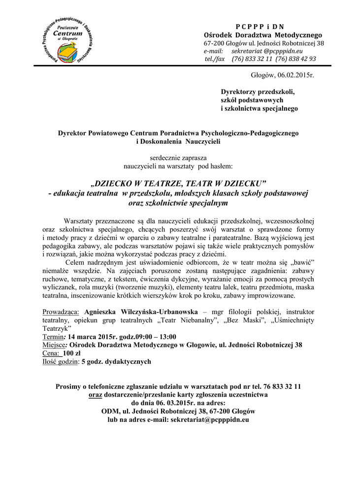 PCPPP i DN Ośrodek Doradztwa Metodycznego 67-200 Głogów ul. Jedności Robotniczej 38 e-mail: sekretariat @pcpppidn.eu tel./fax (76) 833 32 11 (76) 838 42 93 Głogów, 06.02.2015r. Dyrektorzy przedszkoli, szkół podstawowych i szkolnictwa specjalnego Dyrektor Powiatowego Centrum Poradnictwa Psychologiczno-Pedagogicznego i Doskonalenia Nauczycieli serdecznie zaprasza nauczycieli na warsztaty pod hasłem: „DZIECKO W TEATRZE, TEATR W DZIECKU” - edukacja teatralna w przedszkolu, młodszych klasach szkoły podstawowej oraz szkolnictwie specjalnym Warsztaty przeznaczone są dla nauczycieli edukacji przedszkolnej, wczesnoszkolnej oraz szkolnictwa specjalnego, chcących poszerzyć swój warsztat o sprawdzone formy i metody pracy z dziećmi w oparciu o zabawy teatralne i parateatralne. Bazą wyjściową jest pedagogika zabawy, ale podczas warsztatów pojawi się także wiele praktycznych pomysłów i rozwiązań, jakie można wykorzystać podczas pracy z dziećmi. Celem nadrzędnym jest uświadomienie odbiorcom, że w teatr można się „bawić” niemalże wszędzie. Na zajęciach poruszone zostaną następujące zagadnienia: zabawy ruchowe, tematyczne, z tekstem, ćwiczenia dykcyjne, wyrażanie emocji za pomocą prostych wyliczanek, rola muzyki (tworzenie muzyki), elementy teatru lalek, teatru przedmiotu, maska teatralna, inscenizowanie krótkich wierszyków krok po kroku, zabawy improwizowane. Prowadząca: Agnieszka Wilczyńska-Urbanowska – mgr filologii polskiej, instruktor teatralny, opiekun grup teatralnych „Teatr Niebanalny”, „Bez Maski”, „Uśmiechnięty Teatrzyk” Termin: 14 marca 2015r. godz.09:00 – 13:00 Miejsce: Ośrodek Doradztwa Metodycznego w Głogowie, ul. Jedności Robotniczej 38 Cena: 100 zł Ilość godzin: 5 godz. dydaktycznych Prosimy o telefoniczne zgłaszanie udziału w warsztatach pod nr tel. 76 833 32 11 oraz dostarczenie/przesłanie karty zgłoszenia uczestnictwa do dnia 06. 03.2015r. na adres: ODM, ul. Jedności Robotniczej 38, 67-200 Głogów lub na adres e-mail: [email protected]