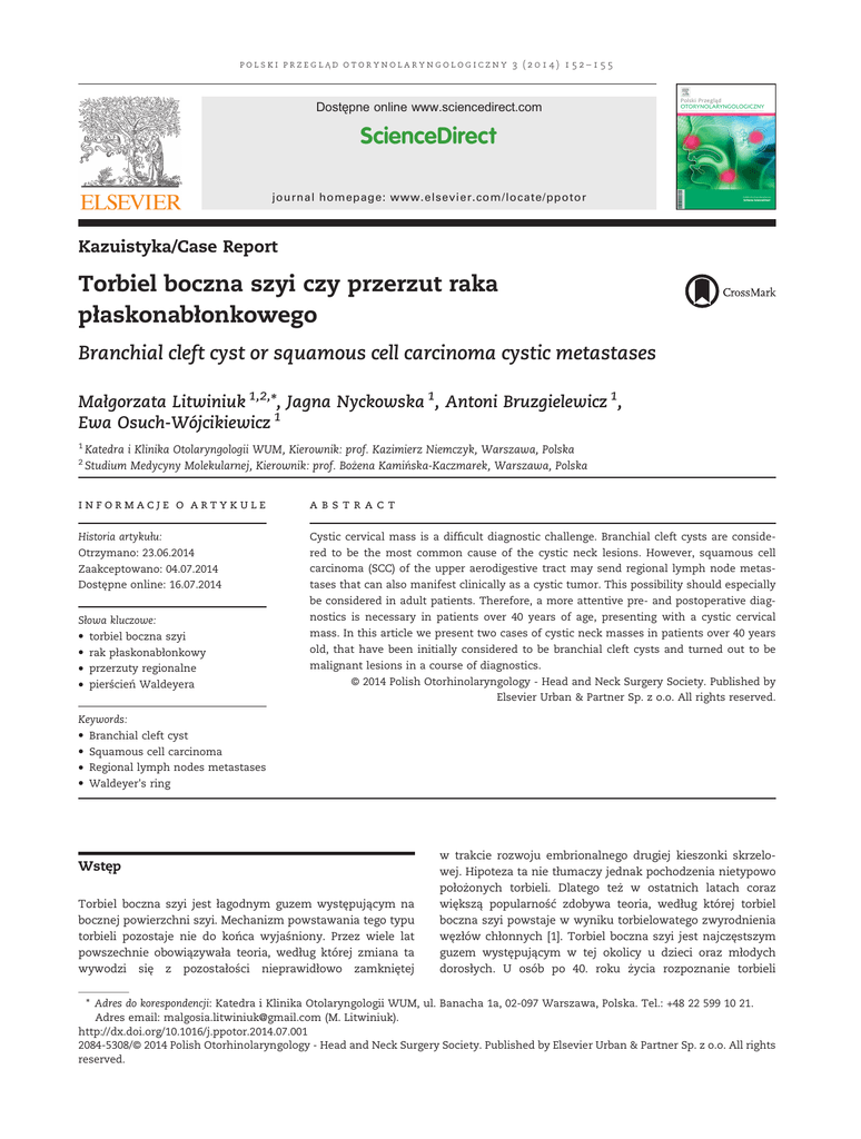 polski przeglĄd otorynolaryngologiczny 3 (2014) 152–155 Dostępne online www.sciencedirect.com ScienceDirect journal homepage: www.elsevier.com/locate/ppotor Kazuistyka/Case Report Torbiel boczna szyi czy przerzut raka płaskonabłonkowego Branchial cleft cyst or squamous cell carcinoma cystic metastases Małgorzata Litwiniuk 1,2,*, Jagna Nyckowska 1, Antoni Bruzgielewicz 1, Ewa Osuch-Wójcikiewicz 1 1 2 Katedra i Klinika Otolaryngologii WUM, Kierownik: prof. Kazimierz Niemczyk, Warszawa, Polska Studium Medycyny Molekularnej, Kierownik: prof. Bożena Kamińska-Kaczmarek, Warszawa, Polska informacje o artykule abstract Historia artykułu: Cystic cervical mass is a difficult diagnostic challenge. Branchial cleft cysts are conside- Otrzymano: 23.06.2014 red to be the most common cause of the cystic neck lesions. However, squamous cell Zaakceptowano: 04.07.2014 carcinoma (SCC) of the upper aerodigestive tract may send regional lymph node metas- Dostępne online: 16.07.2014 tases that can also manifest clinically as a cystic tumor. This possibility should especially be considered in adult patients. Therefore, a more attentive pre- and postoperative diag- Słowa kluczowe: torbiel boczna szyi rak płaskonabłonkowy nostics is necessary in patients over 40 years of age, presenting with a cystic cervical przerzuty regionalne pierścień Waldeyera malignant lesions in a course of diagnostics. mass. In this article we present two cases of cystic neck masses in patients over 40 years old, that have been initially considered to be branchial cleft cysts and turned out to be © 2014 Polish Otorhinolaryngology - Head and Neck Surgery Society. Published by Elsevier Urban & Partner Sp. z o.o. All rights reserved. Keywords: Branchial cleft cyst Squamous cell carcinoma Regional lymph nodes metastases Waldeyer's ring Wstęp Torbiel boczna szyi jest łagodnym guzem występującym na bocznej powierzchni szyi. Mechanizm powstawania tego typu torbieli pozostaje nie do końca wyjaśniony. Przez wiele lat powszechnie obowiązywała teoria, według której zmiana ta wywodzi się z pozostałości nieprawidłowo zamkniętej w trakcie rozwoju embrionalnego drugiej kieszonki skrzelowej. Hipoteza ta nie tłumaczy jednak pochodzenia nietypowo położonych torbieli. Dlatego też w ostatnich latach coraz większą popularność zdobywa teoria, według której torbiel boczna szyi powstaje w wyniku torbielowatego zwyrodnienia węzłów chłonnych [1]. Torbiel boczna szyi jest najczęstszym guzem występującym w tej okolicy u dzieci oraz młodych dorosłych. U osób po 40. roku życia rozpoznanie torbieli * Adres do korespondencji: Katedra i Klinika Otolaryngologii WUM, ul. Banacha 1a, 02-097 Warszawa, Polska. Tel.: +48 22 599 10 21. Adres email: [email protected] (M. Litwiniuk). http://dx.doi.org/10.1016/j.ppotor.2014.07.001 2084-5308/© 2014 Polish Otorhinolaryngology - Head and Neck Surgery Society. Published by Elsevier Urban & Partner Sp. z o.o. All rights reserved. polski przeglĄd otorynolaryngologiczny 3 (2014) 152–155 bocznej szyi powinno być ustalane ostrożne, bowiem w ostatecznym rozpoznaniu częściej jest to przerzut raka płaskonabłonkowego, który może współwystępować z torbielą. Ocenia się, że w grupie pacjentów powyżej 40. roku życia nawet 80% torbielowatych zmian w obrębie szyi może mieć złośliwy charakter [2]. W artykule prezentujemy dwa przypadki torbielowatych guzów szyi u pacjentek powyżej 40. roku życia, zdiagnozowanych początkowo jako torbiele boczne szyi, które okazały się ogniskami przerzutowymi raka płaskonabłonkowego. 153 badanie histopatologiczne ujawniło ognisko raka płaskonabłonkowego. Pacjentkę zakwalifikowano do radioterapii uzupełniającej. Przeprowadzono u niej napromienianie radykalne fotonami X o energii 6 Mv. Pacjentka otrzymała sumaryczną dawkę 7000 cGy/t na guz nasady języka oraz przerzutowo zajęte węzły chłonne szyi po stronie prawej, a także 6600 cGy/t na gardło po stronie prawej oraz 5400 cGy/t na węzły chłonne zagardłowe po stronie lewej. Obecnie pozostaje pod kontrolą Ambulatorium Kliniki. Omówienie Przypadek pierwszy 56-letnia pacjentka została przyjęta do Kliniki z powodu bezbolesnej, szybko powiększającej się zmiany po lewej stronie szyi, którą zauważyła po raz pierwszy przed trzema miesiącami. Ponadto pacjentka podała w wywiadzie nawracające od kilku lat zapalenia migdałków podniebiennych. Badanie przedmiotowe ujawniło obecność na bocznej powierzchni szyi, w okolicy kąta żuchwy, okrągłego, przesuwalnego, niebolesnego guza, o średnicy około 4 cm. W wykonanej tomografii komputerowej opisana została dobrze odgraniczona torbielowata zmiana, położona do tyłu od ślinianki podżuchwowej i bocznie od żyły szyjnej wewnętrznej. Obraz TK przemawiał w pierwszej kolejności za torbielą wywodzącą się z drugiej kieszonki skrzelowej. Pacjentka przeszła zabieg chirurgicznego usunięcia torbieli. W badaniu histopatologicznym wyciętej zmiany stwierdzono obecność atypowego nabłonka wielowarstwowego płaskiego z drobnymi ogniskami naciekania – rak w torbieli. Pacjentka została ponownie przyjęta do Kliniki i poddana panendoskopii, która nie ujawniła żadnych nieprawidłowości, poza dyskretną asymetrią migdałków podniebiennych. Z tego powodu u pacjentki wykonano tonsillektomię, a w lewym migdałku podniebiennym badanie histopatologiczne ujawniło obecność ogniska raka płaskonabłonkowego. Pacjentka została zakwalifikowana do radioterapii uzupełniającej. Otrzymała dawkę całkowitą 6000 cGy/t na lewy migdałek podniebienny oraz zmienione przerzutowo węzły chłonne po stronie lewej. Przypadek drugi 81-letnia pacjentka zgłosiła się do Kliniki z powodu obserwowanego od 4 miesięcy guza po prawej stronie szyi. Pacjentka negowała jakiekolwiek inne dolegliwości. W badaniu USG została opisana zmiana o wym. 4 1 1 cm, położona na wysokości rozwidlenia tętnicy szyjnej wspólnej, o morf