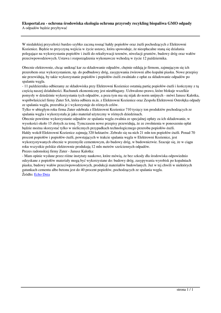 Ekoportal.eu - ochrona środowiska ekologia ochrona przyrody recykling biopaliwa GMO odpady A odpadów będzie przybywać W niedalekiej przyszłości bardzo szybko zaczną rosnąć hałdy popiołów oraz żużli pochodzących z Elektrowni Kozienice. Będzie to przyczyną wejścia w życie ustawy, która spowoduje, że nieopłacalne staną się działania polegające na wykorzystaniu popiołów i żużli do rekultywacji terenów, niwelacji gruntów, budowy dróg oraz wałów przeciwpowodziowych. Ustawa i rozporządzenia wykonawcze wchodzą w życie 12 października. Obecnie elektrownie, chcąc uniknąć kar za składowanie odpadów, chętnie oddają je firmom, zajmującym się ich przerobem oraz wykorzystaniem, np. do podbudowy dróg, zasypywania żwirowni albo kopalni piasku. Nowe przepisy nie przewidują, by takie wykorzystanie popiołów i popiołów-żużli zwalniało z opłat za składowanie odpadów po spalaniu węgla. - 11 października odbieramy ze składowiska przy Elektrowni Kozienice ostatnią partię popiołów-żużli i kończymy z tą częścią naszej działalności. Rachunek ekonomiczny jest nieubłagany. Uchwalono prawo, które blokuje wszelkie pomysły w dziedzinie wykorzystania tych odpadów, a poza tym ma się nijak do norm unijnych - mówi Janusz Kalotka, współwłaściciel firmy Zuter SA, która odbiera m.in. z Elektrowni Kozienice oraz Zespołu Elektrowni Ostrołęka odpady ze spalania węgla, przerabia je i wykorzystuje do różnych celów. Tylko w ubiegłym roku firma Zuter odebrała z Elektrowni Kozienice 710 tysięcy ton produktów pochodzących ze spalania węgla i wykorzystała je jako materiał użyteczny w różnych dziedzinach. Obecnie powtórne wykorzystanie odpadów ze spalania węgla zwalnia ze specjalnej opłaty za ich składowanie, w wysokości około 15 złotych za tonę. Tymczasem nowe przepisy przewidują, że ze zwolnienia w ponoszeniu opłat będzie można skorzystać tylko w nielicznych przypadkach technologicznego przerobu popiołów-żużli. Hałdy wokół Elektrowni Kozienice zajmują 320 hektarów. Zebrało się na nich 21 mln ton popiołów-żużli. Ponad 70 procent popiołów i popiołów-żużli, powstających w trakcie spalania węgla w Elektrowni Kozienice, jest wykorzystywanych obecnie w przemyśle cementowym, do budowy dróg, w budownictwie. Szacuje się, że w ciągu roku wszystkie polskie elektrownie produkują 12 mln metrów sześciennych odpadów. Prezes radomskiej firmy Zuter - Janusz Kalotka: - Mam opinie wydane przez różne instytuty naukowe, które mówią, że bez szkody dla środowiska odpowiednio odzyskane z popiołów materiały mogą być wykorzystane do: budowy dróg, zasypywania wyrobisk po kopalniach piasku, budowy wałów przeciwpowodziowych, produkcji materiałów budowlanych. Już w tej chwili w niektórych gatunkach cementu albo betonu jest do 40 procent popiołów, pochodzących ze spalania węgla. Źródło: Echo Dnia strona 1 / 1