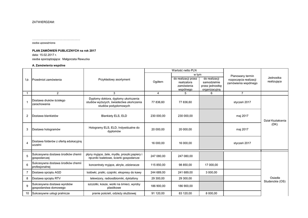ZATWIERDZAM: …………………………………………. osoba upoważniona PLAN ZAMÓWIEŃ PUBLICZNYCH na rok 2017 data: 15.02.2017 r. osoba sporządzająca: Małgorzata Rewucka A. Zamówienia wspólne l.p. 1 Przedmiot zamówienia 2 1 Dostawa druków ścisłego zarachowania 2 Dostawa blankietów Przykładowy asortyment Ogółem Wartość netto PLN w tym do realizacji przez do realizacji realizatora samodzielnie zamówienia przez jednostkę wspólnego organizacyjną 5 6 Planowany termin rozpoczęcia realizacji zamówienia wspólnego 3 4 Dyplomy doktora, dyplomy ukończenia studiów wyższych, świadectwa ukończenia studiów podyplomowych 77 836,60 77 836,60 styczeń 2017 Blankiety ELS, ELD 230 000,00 230 000,00 maj 2017 Jednostka realizująca 7 Dział Kształcenia (DK) 3 Dostawa hologramów 4 Dostawa folderów z ofertą edukacyjną uczelni 5 Sukcesywna dostawa środków chemii gospodarczej 6 Sukcesywna dostawa środków chemii profesjonalnej 7 Hologramy ELS, ELD, Indywidualne do dyplomów 20 000,00 20 000,00 maj 2017 16 000,00 16 000,00 styczeń 2017 płyny myjące, żele, mydła, proszki,papiery i ręczniki toaletowe, ścierki gospodarcze 247 080,00 247 080,00 koncentraty myjące, akryle, zdzieracze 115 850,00 98 850,00 17 000,00 Dostawa sprzętu AGD lodówki, pralki, czajniki, ekspresy do kawy 244 689,00 241 689,00 3 000,00 8 Dostawa sprzętu RTV telewizory, radioodbiorniki, dyktafony 29 300,00 29 300,00 9 Sukcesywna dostawa wyrobów gospodarstwa domowego szczotki, kosze, worki na śmieci, wyroby plastikowe 186 900,00 186 900,00 10 Sukcesywne usługi pralnicze pranie pościeli, odzieży służbowej 91 120,00 83 120,00 Osiedle Studenckie (OS) 8 000,00 Osiedle Studenckie (OS) 11 Sukcesywna dostawa bielizny pościelowej, koców, kołder 12 CCTV – system TV przemysłowej bielizna pościelowa, koce, kołdry, ręczniki, obrusy 46 550,00 41 550,00 5 000,00 Wykonanie i dostawa urządzeń 103 600,00 13 600,00 90 000,00 13 CCTV – system TV przemysłowej Konserwacja i naprawa systemów 25 000,00 25 000,00 14 System sygnalizacji alarmu pożarowego i dźwiękowych systemów ostrzegawczych Wykonanie i dostawa urządzeń 130 000,00 130 000,00 15 System sygnalizacji alarmu pożarowego i dźwiękowych systemów ostrzegawczych Konserwacja i naprawa systemów 200 000,00 175 000,00 25 000,00 16 System sygnalizacji alarmu włamania i napadu Wykonanie i dostawa urządzeń 92 000,00 7 000,00 85 000,00 17 System sygnalizacji alarmu włamania i napadu Konserwacja i naprawa systemów 6 000,00 6 000,00 18 Monitoring systemów alarmu pożarowego monitoring systemów alarmu pożarowego do straży pożarnej 5 000,00 5 000,00 19 Ubezpieczenie jednostek pływających Ubezpieczenie OC armatora, jacht casco, NNW załogi 230 000,00 230 000,00 Styczeń/luty 20 Ubezpieczenie kosztów leczenia poza granicami Polski Ubezpieczenie kosztów leczenia poza granicami Polski, NNW i bagaż podróżny 75 600,00 75 600,00 Maj/czerwiec 21 Ubezpieczenie NNW studentów i Ubezpieczenie następstw pracowników Politechniki Gdańskiej nieszczęśliwych wypadków studentów wyjeżdżających na praktyki oraz służbowo na na praktykach terenie Polski 26 000,00 26 000,00 Październik/listopad Kwiecień/maj Dział Ochrony Mienia (DOM) Marzec/kwiecień 22 Ubezpieczenie floty pojazdów Ubezpieczenie OC, AC, Assistance, NNW 136 000,00 136 000,00 Październik/listopad 23 Ubezpieczenie odpowiedzialności cywilnej kontraktowe Ubezpieczenie OC kontraktów 75 000,00 75 000,00 Kwiecień/maj 109 620,00 106 720,00 2 900,00 I-IV kwartał 78 200,00 76 200,00 2 000,00 I-IV kwartał 24 Dostawa czasopism krajowych 25 Dostawa czasopism zagranincznych Dzienniki, czasopisma techniczne, czasopisma naukowe Czasopisma drukowane, czasopism w dostępie wyłącznie online Bibliotek Główna 26 Dostawa książek krajowych Podręczniki, słowniki, książki naukowe, encyklopedie 247 500,00 241 200,00 6 300,00 I-IV kwartał Bibliotek Główna (BG) Podręczniki, słowniki, książki naukowe, encyklopedie 203 800,00 192 650,00 11 150,00 I-IV kwartał Bazy specjalistyczne zagraniczne i krajowe 1 233 136,00 1 203 136,00 30 000,00 I kwartał Normy polskie i zagraniczne 17 800,00 16 600,00 1 200,00 I-IV kwartał Dostawa narzędzi ręcznych i elektrycznych (wiertarki, szlifierki, pilniki, młotki itp.) 180 000,00 163 000,00 17 000,00 sierpień2017 31 Dostawa wyrobów metalowych (gwoździe, śruby, kształtki, wkrętaki) 48 800,00 19 950,00 28 850,00 Poniżej 30.000 EURO art. 4.8 Pzp 32 Dostawa aparatów telefonicznych i faksów aparaty telefoniczne, faksy 30 000,00 27 700,00 2 300,00 Poniżej 30.000 EURO art. 4.8 Pzp 33 Usługi telefonii komórkowej 420 000,00 420 000,00 800,00 Umowa do 31.01.2018 grudzień 2017 34 Usługi telefonii stacjonarnej 62 000,00 62 000,00 Umowa do 31.10.2017 czerwiec 2017 35 Dostawa i przegląd sprzętu p-poż. 87 800,00 87 800,00 Poniżej 30.000 EURO art. 4.8 Pzp 36 Usługi okresowych przeglądów przewodów kominowych i wentylacyjnych 48 000,00 48 000,00 Poniżej 30.000 EURO art. 4.8 Pzp 37 Dostawa gazów 422 000,00 325 000,00 38 Usługa konserwacji dźwigów 285 500,00 285 500,00 styczeń 2017 39 Usługa wykonania przeglądów/ pomiarów instalacji odgromowych 40 000,00 40 000,00 Poniżej 30.000 EURO art. 4.8 Pzp 40 Usługa przeglądów instalacji gazowych 25 000,00 25 000,00 Poniżej 30.000 EURO art. 4.8 Pzp 41 Dostawa materiałów elektrycznych 800 000,00 800 000,00 marzec 2017 42 Usługa konserwacji klimatyzacji i wentylacji 455 000,00 455 000,00 styczeń 2017 27 Dostawa książek importowanych 28 Dostawa baz danych 29 Dostawa norm 30 Gaśnice, prądownice, węże żarówki, świetlówki, baterie, oprawy, przedłużacze 97 000,00 sierpień 2017 Dział Eksploatacji (DE) 43 Usługa konserwacji kuchenek gazowych 45 000,00 45 000,00 Poniżej 30.000 EURO art. 4.8 Pzp 44 Serwis systemów telekomunikacyjnych (TDM + VoIP) 72 000,00 72 000,00 Poniżej 30.000 EURO art. 4.8 Pzp 45 Łącze internetowe do OW PG Czarlina 12 000,00 12 000,00 Umowa