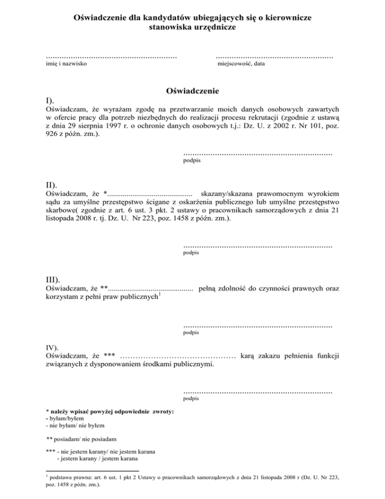 Oświadczenie dla kandydatów ubiegających się o kierownicze stanowiska urzędnicze .......................................................... .................................................... imię i nazwisko miejscowość, data Oświadczenie I). Oświadczam, Ŝe wyraŜam zgodę na przetwarzanie moich danych osobowych zawartych w ofercie pracy dla potrzeb niezbędnych do realizacji procesu rekrutacji (zgodnie z ustawą z dnia 29 sierpnia 1997 r. o ochronie danych osobowych t.j.: Dz. U. z 2002 r. Nr 101, poz. 926 z późn. zm.). .................................................................. podpis II). Oświadczam, Ŝe *............................................ skazany/skazana prawomocnym wyrokiem sądu za umyślne przestępstwo ścigane z oskarŜenia publicznego lub umyślne przestępstwo skarbowe( zgodnie z art. 6 ust. 3 pkt. 2 ustawy o pracownikach samorządowych z dnia 21 listopada 2008 r. tj. Dz. U. Nr 223, poz. 1458 z późn. zm.). .................................................................. podpis III). Oświadczam, Ŝe **............................................ pełną zdolność do czynności prawnych oraz korzystam z pełni praw publicznych1 .................................................................. podpis IV). Oświadczam, Ŝe *** ……………………………………… karą zakazu pełnienia funkcji związanych z dysponowaniem środkami publicznymi. .................................................................. podpis * naleŜy wpisać powyŜej odpowiednie zwroty: - byłam/byłem - nie byłam/ nie byłem ** posiadam/ nie posiadam *** - nie jestem karany/ nie jestem karana - jestem karany / jestem karana 1 podstawa prawna: art. 6 ust. 1 pkt 2 Ustawy o pracownikach samorządowych z dnia 21 listopada 2008 r (Dz. U. Nr 223, poz. 1458 z późn. zm.).
