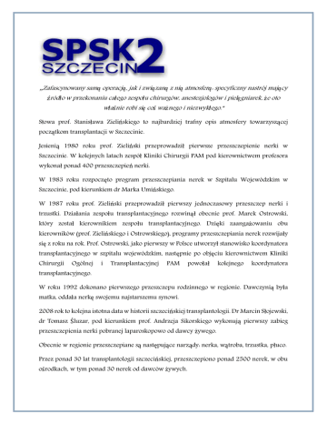 „Zafascynowany samą operacją, jak i związaną z nią atmosferą: specyficzny nastrój mający źródło w przekonaniu całego zespołu chirurgów, anestezjologów i pielęgniarek, że oto właśnie robi się coś ważnego i niezwykłego.” Słowa prof. Stanisława Zielińskiego to najbardziej trafny opis atmosfery towarzyszącej początkom transplantacji w Szczecinie. Jesienią 1980 roku prof. Zieliński przeprowadził pierwsze przeszczepienie nerki w Szczecinie. W kolejnych latach zespół Kliniki Chirurgii PAM pod kierownictwem profesora wykonał ponad 400 przeszczepień nerki. W 1983 roku rozpoczęto program przeszczepiania nerek w Szpitalu Wojewódzkim w Szczecinie, pod kierunkiem dr Marka Umińskiego. W 1987 roku prof. Zieliński przeprowadził pierwszy jednoczasowy przeszczep nerki i trzustki. Działania zespołu transplantacyjnego rozwinął obecnie prof. Marek Ostrowski, który został kierownikiem zespołu transplantacyjnego. Dzięki zaangażowaniu obu kierowników (prof. Zielińskiego i Ostrowskiego), programy przeszczepiania nerek rozwijały się z roku na rok. Prof. Ostrowski, jako pierwszy w Polsce utworzył stanowisko koordynatora transplantacyjnego w szpitalu wojewódzkim, następnie po objęciu kierownictwem Kliniki Chirurgii Ogólnej i Transplantacyjnej PAM powołał kolejnego koordynatora transplantacyjnego. W roku 1992 dokonano pierwszego przeszczepu rodzinnego w regionie. Dawczynią była matka, oddała nerkę swojemu najstarszemu synowi. 2008 rok to kolejna istotna data w historii szczecińskiej transplantologii. Dr Marcin Słojewski, dr Tomasz Śluzar, pod kierunkiem prof. Andrzeja Sikorskiego wykonują pierwszy zabieg przeszczepienia nerki pobranej laparoskopowo od dawcy żywego. Obecnie w regionie przeszczepiane są następujące narządy: nerka, wątroba, trzustka, płuco. Przez ponad 30 lat transplantologii szczecińskiej, przeszczepiono ponad 2500 nerek, w obu ośrodkach, w tym ponad 30 nerek od dawców żywych. Zespół Żywego Dawcy Nerki – Szczecin/ Kontakt: tel.697 806 380, mail: [email protected] Kierownik regionalny programu Żywy Dawca Nerki Dr hab. n. med. Marek Myślak – specjalista nefrologii i transplantologii klinicznej, kierownik regionalnego ośrodka kwalifikacyjnego. Zajmuje się medyczną kwalifikacją Żywych Dawców nerki oraz Biorców, jak również biorców z całego województwa. Zajmuje się przygotowaniem medycznym par Dawca – Biorca do zabiegu bezpiecznego pobrania i transplantacji nerki. Po zakończonym procesie kwalifikacji sprawuje opiekę po przeszczepieniu nerki nad Biorcą w przyklinicznej Poradni Transplantacyjnej oraz w przyklinicznej Poradni Nefrologicznej nad Dawcą nerki. Koordynator regionalny programu Żywy Dawca Nerki Dorota Semczyszyn – specjalista pielęgniarstwa nefrologicznego, główne zadania to: promowanie idei transplantacji nerek od osób żyjących. Organizacja spotkań par dawca- biorca z zespołem konsultacyjnym. Organizacja spotkań, konferencji w stacjach dializ i szpitalach dla chorych ze schyłkową niewydolnością nerek i ich rodzin, dla personelu stacji dializ i poradni nefrologicznych. Sprawowanie opieki nad potencjalną parą dawca - biorca, która pojawia się w punkcie konsultacyjnym. Wspieranie pary przez cały okres kwalifikacji, w okresie przed i pooperacyjnym, a także po wyjściu ze szpitala. Psycholog kliniczny SPSK-2 Mgr Ewa Cichocka – głównym zadaniem psychologa w kontakcie z potencjalnym Dawcą i Biorcą jest wspomaganie procesu podejmowania świadomej decyzji przy uwzględnieniu zasad minimalizacji ryzyka i maksymalizacji korzyści z dawstwa nerki, ze szczególnym uwzględnieniem dbałości o obopólną, jakość życia. Po pomyślnie zakończonym procesie kwalifikacji, opieka psychologiczna dostępna jest również w okresie pooperacyjnym na oddziale szpitalnym, a także w razie potrzeby w późniejszym okresie- ambulatoryjnie w przyklinicznej Poradni Nefrologicznej/ Transplantacyjnej. Kontakt: tel. 91 466 12 02 Prof. dr hab. n. med. Marek Ostrowski – kierownik Kliniki Chirurgii Ogólnej i Transplantologii PUM, specjalista transplantologii klinicznej (również europejskiej), wojewódzki konsultant w zakresie transplantologii klinicznej, siedmiokrotnie zasiadał w zarządzie gł ównym Polskiego Towarzystwa Transplantacyjnego. Przeszczepia nerki od ponad 30 lat, w tym czasie brał udział w ponad 1500 zabiegów. Od ponad 20 lat przeszczepia nerki od dawców spokrewnionych (przeprowadzonych ok. 40 przeszczepień). Wykonuje wszystkie zabiegi naprawcze po przeszczepieniu nerki. Dr hab. n. med. profesor nadzw. - Marcin Słojewski, lekarz kierujący Kliniką Urologii i Onkologii Urologicznej od 2013 roku jest uznanym krajowym autorytetem w zakresie laparoskopii urologicznej. Jest autorem i współautorem licznych publikacji i doniesień kongresowych z tego zakresu w polskich i zagranicznych czasopismach naukowych. Od 2008 roku przeprowadza laparoskopowe pobrania nerek do przeszczepienia o dawcy żywego z dostępu pozaotrzewnowego. Jest autorem i współautorem licznych publikacji i doniesień kongresowych z tego zakresu w polskich i zagranicznych czasopismach naukowych. Do tej pory wykonaliśmy 13 pobrań nerki metodą laparoskopową dzięki ścisłej współpracy pomiędzy Kliniką Urologii i Onkologii Urologicznej z Kliniką Chirurgii Ogólnej i Transplantacyjnej oraz Kliniką Transplantologii i Nefrologii PUM. Wszystkie dotychczas wykonane operacje zakończyły się powodzeniem, nie odnotowaliśmy żadnych poważnych powikłań u Dawców. Klinika Urologii i Onkologii Urologicznej, jako jedna z niewielu w kraju otrzymała certyfikat, jakości szkolenia przyznany przez Europejską Radę Urologii (European Board of Urology) potwierdzający m. in., że wytyczne europejskich towarzystw naukowych są również podstawą naukową postępowania lekarskiego stosowanego w Klinice. Jakość organizacji pracy oddziałów potwierdza także certyfikat ISO. Świadczymy usługi medyczne i
