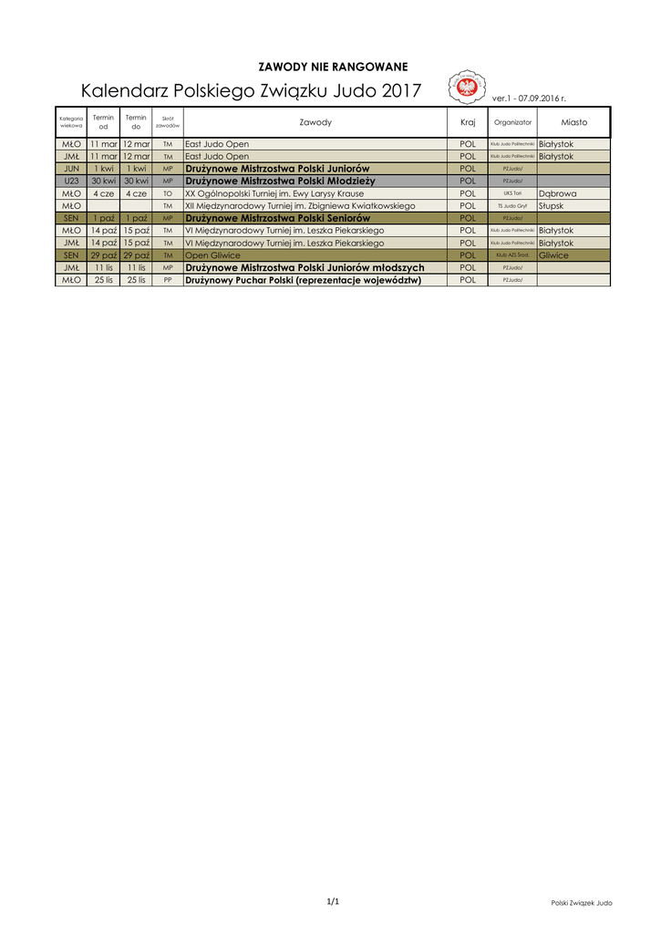 ZAWODY NIE RANGOWANE Kalendarz Polskiego Związku Judo 2017 Kategoria wiekowa Termin od Termin do Skrót zawodów Zawody MŁO JMŁ 11 mar 12 mar 11 mar 12 mar TM JUN U23 1 kwi 30 kwi 1 kwi 30 kwi MP MP Drużynowe Mistrzostwa Polski Juniorów Drużynowe Mistrzostwa Polski Młodzieży MŁO 4 cze 4 cze TO MŁO SEN MŁO JMŁ 1 paź 1 paź 14 paź 15 paź 14 paź 15 paź SEN 29 paź 29 paź JMŁ MŁO 11 lis 25 lis 11 lis 25 lis TM East Judo Open East Judo Open ver.1 - 07.09.2016 r. Kraj POL POL POL Organizator Klub Judo Politechniki Klub Judo Politechniki PZJudo/ XX Ogólnopolski Turniej im. Ewy Larysy Krause TM XII Międzynarodowy Turniej im. Zbigniewa Kwiatkowskiego POL TS Judo Gryf MP Drużynowe Mistrzostwa Polski Seniorów PZJudo/ TM VI Międzynarodowy Turniej im. Leszka Piekarskiego VI Międzynarodowy Turniej im. Leszka Piekarskiego Open Gliwice POL POL POL POL MP Drużynowe Mistrzostwa Polski Juniorów młodszych POL PZJudo/ PP Drużynowy Puchar Polski (reprezentacje województw) POL PZJudo/ TM 1/1 Białystok Białystok PZJudo/ POL POL TM Miasto UKS Tori Klub Judo Politechniki Klub Judo Politechniki Klub AZS Środ. Dąbrowa Słupsk Białystok Białystok Gliwice Polski Związek Judo