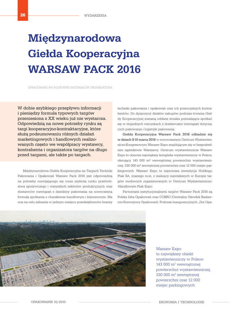 26 WYDARZENIA Międzynarodowa Giełda Kooperacyjna WARSAW PACK 2016 OPRACOWANO NA PODSTAWIE MATERIAŁÓW ORGANIZATORA W dobie szybkiego przepływu informacji i pieniędzy formuła typowych targów przeniesiona z XX wieku już nie wystarcza. Odpowiedzią na nowe potrzeby rynku są targi kooperacyjno-kontraktacyjne, które służą podsumowaniu różnych działań marketingowych i handlowych realizowanych często we współpracy wystawcy, kontrahenta i organizatora targów na długo przed targami, ale także po targach. techniki pakowania i opakowań oraz ich potencjalnych kontrahentów. Do dyspozycji działów zakupów podczas trwania Giełdy Kooperacyjnej zostaną oddane stoiska pozwalające spotkać się w dogodnych warunkach z dostawcami rozwiązań dotyczących pakowania i logistyki pakowania. Giełda Kooperacyjna Warsaw Pack 2016 odbędzie się w dniach 8-10 marca 2016 w nowoczesnym Centrum Wystawienniczo-Kongresowym Warsaw Expo znajdującym się w bezpośrednim sąsiedztwie Warszawy. Centrum wystawiennicze Warsaw Expo to obecnie największy kompleks wystawienniczy w Polsce, oferujący 143 000 m2 wewnętrznej powierzchni wystawienniczej, 330 000 m2 zewnętrznej powierzchni oraz 12 000 miejsc par- Międzynarodowa Giełda Kooperacyjna na Targach Techniki kingowych. Warsaw Expo to najnowsza inwestycja Holdingu Pakowania i Opakowań Warsaw Pack 2016 jest odpowiedzią Ptak SA, znanego m.in. z realizacji największych w Europie tar- na potrzeby rozwijającego się coraz szybciej rynku przetwór- gów modowych organizowanych w Centrum Wystawienniczo- stwa spożywczego i wszystkich sektorów produkcyjnych oraz -Handlowym Ptak Expo. dostawców rozwiązań z dziedziny pakowania na nowoczesną Partnerami instytucjonalnymi targów Warsaw Pack 2016 są formułę spotkania o charakterze handlowym i biznesowym. Ma Polska Izba Opakowań oraz COBRO (Centralny Ośrodek Badaw- ona na celu zebranie w jednym miejscu przedsiębiorców branży czo-Rozwojowy Opakowań). Podczas inauguracyjnych „Dni Opa- Warsaw Expo to największy obiekt wystawienniczy w Polsce: 143 000 m2 wewnętrznej powierzchni wystawienniczej, 330 000 m2 zewnętrznej powierzchni oraz 12 000 miejsc parkingowych OPAKOWANIE 10/2015 EKONOMIA I TECHNOLOGIE 27 WYDARZENIA kowań” certyfikat członkostwa w Polskiej Izbie Opakowań dla Warsaw Expo odebrał Tomasz Raczyński, dyrektor zarządzający w Warsaw Expo. Certyfikat od Polskiej Izby Opakowań jest bardzo ważnym wyróżnieniem, nie tylko z uwagi na rangę, jaką reprezentuje, ale także na misję, jaką niesie Izba. Ma ona na celu skupianie przedsiębiorców z branży opakowań, reprezentowanie interesów tego środowiska oraz wspieranie działania na rzecz promocji i marketingu – mówi Tomasz Raczyński. – Ponadto Izba pośredniczy również w nawiązywaniu kontaktów handlowych i kooperacyjnych. Dlatego cieszymy się, że mogliśmy dołączyć do tak zasłużonego grona członków Polskiej Izby Opakowań. Targi kooperacyjne to świetna okazja do spotkania ludzi z branży, zapoznania się z najnowszymi trendami, spotkania z konkurencją na neutralnym gruncie, a często jedyna szansa nawiązania relacji z partnerami biznesowymi niedostępnymi na co dzień. To także czas na pogłębienie relacji biznesowych w mniej oficjalnej atmosferze, która jest istotnym elementem utrzymania dobrego wizerunku w biznesie. EKONOMIA I TECHNOLOGIE I Podczas inauguracyjnych „Dni Opakowań” certyfikat członkostwa w Polskiej Izbie Opakowań dla Warsaw Expo odebrał Tomasz Raczyński, dyrektor zarządzający w Warsaw Expo OPAKOWANIE 10/2015