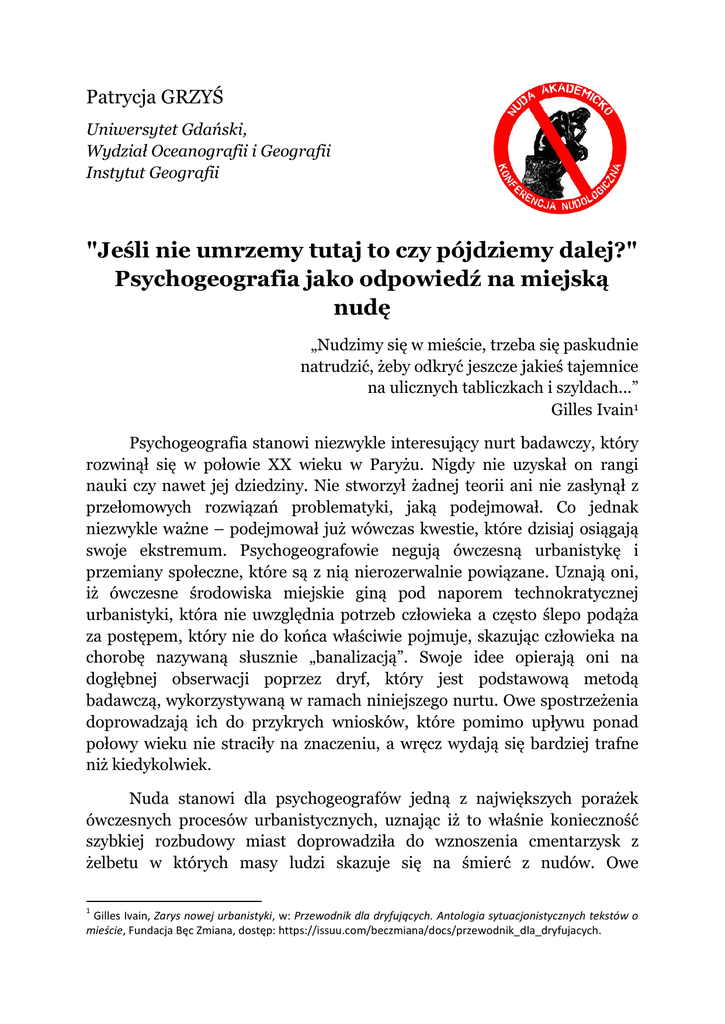 Patrycja GRZYŚ Uniwersytet Gdański, Wydział Oceanografii i Geografii Geo Instytut Geografii "Jeśli nie umrzemy tutaj to czy pójdziemy dalej?" Psychogeografia jako odpowiedź na miejską nudę „Nudzimy się w mieście, trzeba się paskudnie natrudzić, żeby odkryć jeszcze jakieś tajemnice na ulicznych ch tabliczkach i szyldach...” Gilles Ivain1 Psychogeografia stanowi niezwykle interesujący nurt badawczy, który rozwinął się w połowie XX wieku w Paryżu. Nigdy nie uzyskał on rangi nauki czy nawet jej dziedziny. Nie stworzył żadnej teorii ani nie zasłynął z przełomowych rozwiązań problematyki, problematyki jaką podejmował. Co jednak niezwykle ważne – podejmował już wówczas kwestie, które dzisiaj osiągają swoje ekstremum. Psychogeografowie negują ówczesną urbanis urbanistykę i przemiany społeczne, które są z nią nierozerwalnie powiązane. Uznają oni, iż ówczesne środowiska miejskie giną pod naporem technokratycznej urbanistyki, która nie uwzględnia zględnia potrzeb człowieka a często ślepo podąża za postępem, który nie do końca właściwie wła pojmuje, skazując człowieka na chorobę nazywaną słusznie „banalizacją”. Swoje idee opierają oni na dogłębnej obserwacji poprzez dryf, który jest podstawową metodą badawczą, wykorzystywaną w ramach niniejszego nurtu. Owe spostrzeżenia doprowadzają ich h do przykrych wniosków, które pomimo upływu ponad połowy wieku nie straciły na znaczeniu, a wręcz wydają się bardziej trafne niż kiedykolwiek. Nuda stanowi dla psychogeografów jedną z największych porażek ówczesnych procesów urbanistycznych, uznając iż to to właśnie konieczność szybkiej rozbudowy miast doprowadziła do wznoszenia cmentarzysk z żelbetu w których masy ludzi skazuje się na śmierć z nudów. Owe 1 Gilles Ivain, Zarys nowej urbanistyki, urbanistyki w: Przewodnik dla dryfujących. Antologia sytuacjonistycznych tekstów o mieście,, Fundacja Bęc Zmiana, dostęp: https://issuu.com/beczmiana/docs/przewodnik_dla_dryfujacych https://issuu.com/beczmiana/docs/przewodnik_dla_dryfujacych. spostrzeżenia konstatują z przekonaniem, iż prawdziwą rolą architektury powinno być służenie ludzkim namiętnościom, a nie społeczeństwu spektaklu, o którym pisał główny prekursor nurtu – Guy Debord.
