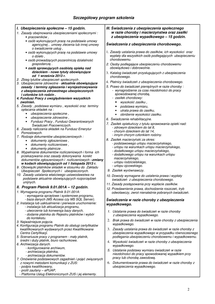 Szczegółowy program szkolenia I. Ubezpieczenia społeczne – 15 godzin. 1. Zasady obejmowania ubezpieczeniami społecznymi : • pracowników , • osób wykonujących pracę na podstawie umowy agencyjnej , umowy zlecenia lub innej umowy o świadczenie usług , • osób wykonujących pracę na podstawie umowy o dzieło , • osób prowadzących pozarolniczą działalność gospodarczą . • osób sprawujących osobistą opiekę nad dzieckiem - nowe tytuły obowiązujące od 1 września 2013 r. 2. Zbieg tytułów ubezpieczeń społecznych . 3. Ubezpieczenie zdrowotne - aktualnie obowiązujące zasady i terminy zgłaszania i wyrejestrowywania z ubezpieczenia zdrowotnego ubezpieczonych i członków ich rodzin . 4. Fundusz Pracy z uwzględnieniem wszystkich zwolnień. 5. Zasady , podstawa wymiaru , wysokość oraz terminy opłacania składek na : • ubezpieczenia społeczne , • ubezpieczenie zdrowotne , • Fundusz Pracy , Fundusz Gwarantowanych Świadczeń Pracowniczych. 6. Zasady naliczania składek na Fundusz Emerytur Pomostowych. 7. Rodzaje dokumentów ubezpieczeniowych : • dokumenty zgłoszeniowe , • dokumenty rozliczeniowe , • dokumenty płatnicze . 8. Wypełnianie dokumentów rozliczeniowych i forma ich przekazywania oraz zasady dokonywania korekt dokumentów zgłoszeniowych i rozliczeniowych –zmiany w kodach obowiązujących od 1 listopada 2013 r. 9. Obowiązki płatników składek w stosunku do Zakładu Ubezpieczeń Społecznych i ubezpieczonych. 10. Zasady ustalania właściwego ustawodawstwa na podstawie aktualnie obowiązujących rozporządzeń unijnych. II. Program Płatnik 9.01.001A – 12 godzin. 1. Wymagania programu Płatnik 9.01.001A: - wymagania sprzętowe i systemowe programu, - baza danych (MS Access czy MS SQL Server). 2. Instalacja lub uaktualnienie i pierwsze uruchomienie: - instalacja lub aktualizacja programu, - utworzenie lub konwersja bazy danych, - dodanie płatnika do Rejestru płatników i wybór do kontekstu. 3. Najważniejsze pojęcia. 4. Konfiguracja programu Płatnik do obsługi certyfikatów kwalifikowanych wydawanych przez Kwalifikowane Centra Certyfikacji. 5. Scenariusze pracy z programem - mały płatnik, średni i duży płatnik, biuro rachunkowe. 6. Archiwizacja danych. - konfigurowanie archiwum, - archiwizacja płatnika, - archiwizacja dokumentów. 7. Omówienie podstawowych zagadnień i pojęć związanych z nowymi metodami komunikacji z ZUS: - podpis kwalifikowany, - profil zaufany – ePUAP, - Platforma Usług Elektronicznych ZUS i jej elementy. III. Świadczenia z ubezpieczenia społecznego w razie choroby i macierzyństwa oraz zasiłki z ubezpieczenia wypadkowego – 15 godzin. Świadczenia z ubezpieczenia chorobowego. 1. Zasady ustalania prawa do zasiłków, ich wysokości oraz wypłaty dla wszystkich osób podlegających ubezpieczeniu chorobowemu. 2. Osoby podlegające ubezpieczeniu chorobowemu obowiązkowo i dobrowolnie. 3. Katalog świadczeń przysługujących z ubezpieczenia chorobowego. 4. Płatnicy świadczeń z ubezpieczenia chorobowego. 5. Prawo do świadczeń pieniężnych w razie choroby : - wynagrodzenie za czas niezdolności do pracy spowodowanej chorobą, - zasiłek chorobowy: • wysokość zasiłku , • podstawa wymiaru, • utrata prawa do zasiłku, • obniżenie wysokości zasiłku. 6. Świadczenie rehabilitacyjne. 7. Zasiłek opiekuńczy z tytułu sprawowania opieki nad: - zdrowym dzieckiem do lat 8, - chorym dzieckiem do lat 14, - innym chorym członkiem rodziny. 8. Zasiłek macierzyński za okres: - podstawowego urlopu macierzyńskiego, - urlopu na warunkach urlopu macierzyńskiego, - dodatkowego urlopu macierzyńskiego, - dodatkowego urlopu na warunkach urlopu macierzyńskiego, - urlopu rodzicielskiego, - urlopu ojcowskiego. 9. Zasiłek wyrównawczy. 10. Dowody wymagane do ustalenia prawa i wypłaty świadczeń z ubezpieczenia chorobowego. 11. Zasady postępowania przy wypłacie zasiłków. 12. Przedawnienie prawa, dochodzenie roszczeń, tryb odwoławczy, zwrot nienależnie pobranych świadczeń. Świadczenia w razie choroby z ubezpieczenia wypadkowego. 1. Ustalanie prawa do świadczeń w razie choroby z ubezpieczenia wypadkowego. 2. Brak prawa do świadczeń w razie choroby z ubezpieczenia wypadkowego. 3. Zasady ustalania prawa do świadczeń w razie choroby z ubezpieczenia wypadkowego w przypadku równoczesnego podlegania ubezpieczeniu chorobowemu i wypadkowemu. 4. Wysokość świadczeń w razie choroby z ubezpieczenia wypadkowego. 5. Ustalanie podstawy wymiaru świadczeń w razie niezdolności do pracy spowodowanej wypadkiem przy pracy lub chorobą zawodową. 6. Dokumentowanie prawa do świadczeń w razie choroby z ubezpieczenia wypadkowego. 2