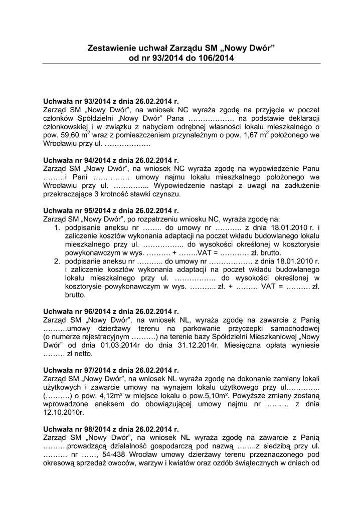 Zestawienie uchwał Zarządu SM „Nowy Dwór” od nr 93/2014 do 106/2014 Uchwała nr 93/2014 z dnia 26.02.2014 r. Zarząd SM „Nowy Dwór”, na wniosek NC wyraża zgodę na przyjęcie w poczet członków Spółdzielni „Nowy Dwór” Pana ………………. na podstawie deklaracji członkowskiej i w związku z nabyciem odrębnej własności lokalu mieszkalnego o pow. 59,60 m2 wraz z pomieszczeniem przynależnym o pow. 1,67 m2 położonego we Wrocławiu przy ul. ………………. Uchwała nr 94/2014 z dnia 26.02.2014 r. Zarząd SM „Nowy Dwór”, na wniosek NC wyraża zgodę na wypowiedzenie Panu ………i Pani …………… umowy najmu lokalu mieszkalnego położonego we Wrocławiu przy ul. …………... Wypowiedzenie nastąpi z uwagi na zadłużenie przekraczające 3 krotność stawki czynszu. Uchwała nr 95/2014 z dnia 26.02.2014 r. Zarząd SM „Nowy Dwór”, po rozpatrzeniu wniosku NC, wyraża zgodę na: 1. podpisanie aneksu nr …….. do umowy nr ……….. z dnia 18.01.2010 r. i zaliczenie kosztów wykonania adaptacji na poczet wkładu budowlanego lokalu mieszkalnego przy ul. …………….. do wysokości określonej w kosztorysie powykonawczym w wys. ………. + ……..VAT = ………… zł. brutto. 2. podpisanie aneksu nr ……….. do umowy nr ……………… z dnia 18.01.2010 r. i zaliczenie kosztów wykonania adaptacji na poczet wkładu budowlanego lokalu mieszkalnego przy ul. …………….. do wysokości określonej w kosztorysie powykonawczym w wys. ……….. zł. + ……… VAT = ………. zł. brutto. Uchwała nr 96/2014 z dnia 26.02.2014 r. Zarząd SM „Nowy Dwór”, na wniosek NL, wyraża zgodę na zawarcie z Panią ……….umowy dzierżawy terenu na parkowanie przyczepki samochodowej (o numerze rejestracyjnym ……….) na terenie bazy Spółdzielni Mieszkaniowej „Nowy Dwór” od dnia 01.03.2014r do dnia 31.12.2014r. Miesięczna opłata wyniesie ……… zł netto. Uchwała nr 97/2014 z dnia 26.02.2014 r. Zarząd SM „Nowy Dwór”, na wniosek NL wyraża zgodę na dokonanie zamiany lokali użytkowych i zawarcie umowy na wynajem lokalu użytkowego przy ul………….. (……….) o pow. 4,12m² w miejsce lokalu o pow.5,10m². Powyższe zmiany zostaną wprowadzone aneksem do obowiązującej umowy najmu nr ……… z dnia 12.10.2010r. Uchwała nr 98/2014 z dnia 26.02.2014 r. Zarząd SM „Nowy Dwór”, na wniosek NL wyraża zgodę na zawarcie z Panią ……….prowadzącą działalność gospodarczą pod nazwą ……..z siedzibą przy ul. ………. nr ……, 54-438 Wrocław umowy dzierżawy terenu przeznaczonego pod okresową sprzedaż owoców, warzyw i kwiatów oraz ozdób świątecznych w dniach od 01.03.2014 r do 30.11.2014 r. Stanowisko handlowe (stoły), ustawione będzie przy gazonach od strony ul. …………………. – zajmowana powierzchnia terenu to ok. 9,0m². Ustala się opłatę za sprzedaż owoców, warzyw i kwiatów oraz ozdób świątecznych w wys. ………….. zł. netto/miesiąc. Uchwała nr 99/2014 z dnia 26.02.2014 r. Zarząd SM „Nowy Dwór”, po rozpatrzeniu wniosku KE i w wyniku przeprowadzonego referendum, wyraża zgodę na utrzymanie dotychczasowego sposobu rozliczenia kosztów ciepła w systemie podzielnikowym dla węzła cieplnego przy ul. ………….. Uchwała nr 100/2014 z dnia 20.02.2014 r. Zarząd SM „Nowy Dwór”, na wniosek TA wyraża zgodę na podpisanie umowy najmu na ½ zabudowanej części korytarza przylegającego do lokalu mieszkalnego nr ………przy ul………. (nieruchomość nr ……….), pod warunkiem uzyskania zgody mieszkańców budynku przy ul. ……………… Uchwała nr 101/2014 z dnia 20.02.2014 r. Zarząd SM „Nowy Dwór”, na wniosek NZ, wyraża zgodę na ogłoszenie i przeprowadzenie przetargu nieograniczonego ofert pisemnych na wykonanie robót remontowych na instalacji elektrycznej w zasobach Spółdzielni, z terminem realizacji robót do dnia 31.10.2014 r. wg warunków określonych w dokumentacji przetargowej. Ustala się: 1. termin przetargu na dzień 19.03.2014 r. o godz. 1000; 2. ogłoszenie w prasie lokalnej, na stronie internetowej i tablicy ogłoszeń przed siedzibą Spółdzielni; 3. cenę 1 kpl. dokumentacji przetargowej (S.I.W.Z.) na 24,60 zł. brutto; 4. wadium w kwocie 10.000,00 zł. Powyższe prace płatne z funduszy remontowych nieruchomości ujętych w „ Rzeczowych Planach Remontowych Spółdzielni na 2014r.” Jednocześnie Zarząd zatwierdza Specyfikację Istotnych Warunków Zamówienia. Uchwała nr 102/2014 z dnia 20.02.2014 r. Zarząd SM „Nowy Dwór”, na wniosek NZ, wyraża zgodę na ogłoszenie i przeprowadzenie przetargu nieograniczonego ofert pisemnych na wykonanie remontu głównego 2-ch dźwigów towarowo – osobowych na dźwigi osobowe o zwiększonym udźwigu w budynkach mieszkalnych przy ul. Nowodworskiej 97 oraz ul. Rogowskiej 172 wg warunków określonych w dokumentacji przetargowej. Ustala się: 1. termin przetargu na dzień 25.03.2014 r. o godz. 1000; 2. ogłoszenie w prasie lokalnej, na stronie internetowej i tablicy ogłoszeń przed siedzibą Spółdzielni; 3. cenę 1 kpl. dokumentacji przetargowej (S.I.W.Z.) na 24,60 zł. brutto; 4. wadium w kwocie 14.000,00 zł. Powyższe prace płatne z funduszu remontowego nieruchomości nr 11 i 21, ujętych w „ Rzeczowych Planach Remontowych Spółdzielni na 2014r.” Jednocześnie Zarząd zatwierdza Specyfikację Istotnych Warunków Zamówienia. Uchwała nr 103/2014 z dnia 20.02.2014 r. Zarząd SM „Nowy Dwór”, po rozpatrzeniu wniosku NZ i na podstawie opinii resortowego członka Zarządu, wyraża zgodę na wybór najkorzystniejszej Oferty nr 1 złożonej przez firmę ………………., …………, ul. ………. we Wrocławiu na wykonanie dokumentacji projektowo-kosztorysowej dotyczącej rozbiórki „podcieni” znajdujących się pod tarasem na poziomie wejścia głównego do budynku mieszkalnego przy ul. ………… Oferowany koszt za wykonanie dokumenta