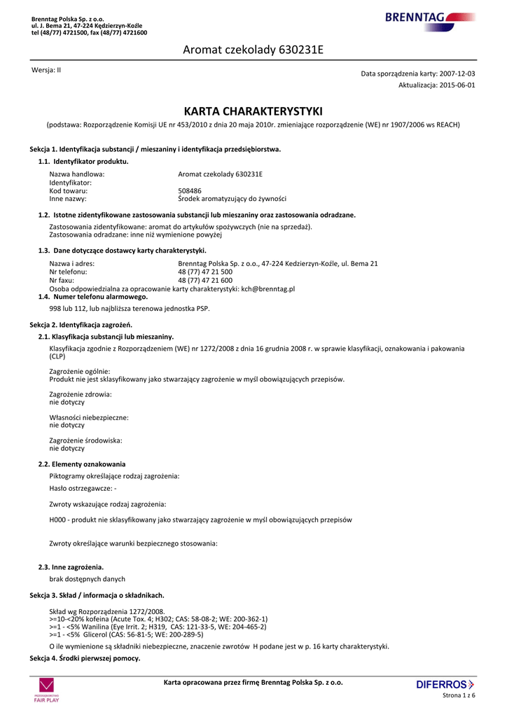 Brenntag Polska Sp. z o.o. ul. J. Bema 21, 47-224 Kędzierzyn-Koźle tel (48/77) 4721500, fax (48/77) 4721600 Aromat czekolady 630231E Wersja: II Data sporządzenia karty: 2007-12-03 Aktualizacja: 2015-06-01 KARTA CHARAKTERYSTYKI (podstawa: Rozporządzenie Komisji UE nr 453/2010 z dnia 20 maja 2010r. zmieniające rozporządzenie (WE) nr 1907/2006 ws REACH) Sekcja 1. Identyfikacja substancji / mieszaniny i identyfikacja przedsiębiorstwa. 1.1. Identyfikator produktu. Nazwa handlowa: Identyfikator: Kod towaru: Inne nazwy: Aromat czekolady 630231E 508486 Środek aromatyzujący do żywności 1.2. Istotne zidentyfikowane zastosowania substancji lub mieszaniny oraz zastosowania odradzane. Zastosowania zidentyfikowane: aromat do artykułów spożywczych (nie na sprzedaż). Zastosowania odradzane: inne niż wymienione powyżej 1.3. Dane dotyczące dostawcy karty charakterystyki. Nazwa i adres: Brenntag Polska Sp. z o.o., 47-224 Kedzierzyn-Koźle, ul. Bema 21 Nr telefonu: 48 (77) 47 21 500 Nr faxu: 48 (77) 47 21 600 Osoba odpowiedzialna za opracowanie karty charakterystyki: [email protected] 1.4. Numer telefonu alarmowego. 998 lub 112, lub najbliższa terenowa jednostka PSP. Sekcja 2. Identyfikacja zagrożeń. 2.1. Klasyfikacja substancji lub mieszaniny. Klasyfikacja zgodnie z Rozporządzeniem (WE) nr 1272/2008 z dnia 16 grudnia 2008 r. w sprawie klasyfikacji, oznakowania i pakowania (CLP) Zagrożenie ogólnie: Produkt nie jest sklasyfikowany jako stwarzający zagrożenie w myśl obowiązujących przepisów. Zagrożenie zdrowia: nie dotyczy Własności niebezpieczne: nie dotyczy Zagrożenie środowiska: nie dotyczy 2.2. Elementy oznakowania Piktogramy określające rodzaj zagrożenia: Hasło ostrzegawcze: Zwroty wskazujące rodzaj zagrożenia: H000 - produkt nie sklasyfikowany jako stwarzający zagrożenie w myśl obowiązujących przepisów Zwroty określające warunki bezpiecznego stosowania: 2.3. Inne zagrożenia. brak dostępnych danych Sekcja 3. Skład / informacja o składnikach. Skład wg Rozporządzenia 1272/2008. >=10-<20% kofeina (Acute Tox. 4; H302; CAS: 58-08-2; WE: 200-362-1) >=1 - <5% Wanilina (Eye Irrit. 2; H319, CAS: 121-33-5, WE: 204-465-2) >=1 - <5% Glicerol (CAS: 56-81-5; WE: 200-289-5) O ile wymienione są składniki niebezpieczne, znaczenie zwrotów H podane jest w p. 16 karty charakterystyki. Sekcja 4. Środki pierwszej pomocy. Karta opracowana przez firmę Brenntag Polska Sp. z o.o. Strona 1 z 6 Brenntag Polska Sp. z o.o. ul. J. Bema 21, 47-224 Kędzierzyn-Koźle tel (48/77) 4721500, fax (48/77) 4721600 Aromat czekolady 630231E 4.1. Opis środków pierwszej pomocy. Wdychanie: W razie narażenia inhalacyjnego zapewnić dostęp świeżego powietrza. Jeśli objawy utrzymują się, wezwać lekarza. Jeżeli poszkodowany jest nieprzytomny ułożyć go w bezpiecznej pozycji bocznej. Kontakt ze skórą: brak dostępnych danych Kontakt z oczami: Usunąć szkła kontaktowe. Zabezpieczyć nieuszkodzone oko. Jeśli podraznienie utrzymuje się, skonsultować się z lekarzem specjalistą. Spożycie: W razie połknięcia zachowac drożność dróg oddechowych. Nie podawać mleka ani napojów alkoholowych. Osobie nieprzytomnej nie podawać niczego do ust. Jeśli objawy utrzymują się, wezwać lekarza. 4.2. Najważniejsze ostre i opóźnione objawy oraz skutki narażenia. brak dostępnych danych 4.3. Wskazania dotyczące wszelkiej natychmiastowej pomocy lekarskiej i szczególnego postępowania z poszkodowanym. brak dostępnych danych Sekcja 5. Postępowanie w przypadku pożaru. 5.1. Środki gaśnicze. proszki gaśnicze, piany odporne na działanie alkoholu, dwutlenek węgla, rozpylona woda 5.2. Szczególne zagrożenia związane z substancją lub mieszaniną. brak dostępnych danych 5.3. Informacje dla straży pożarnej. Stosować niezależny aparat oddechowy. Sekcja 6. Postępowanie w przypadku niezamierzonego uwolnienia do środowiska. 6.1. Indywidualne środki ostrożności, wyposażenie ochronne i procedury w sytuacjach awaryjnych. Unikać tworzenia pyłu. 6.2. Środki ostrożności w zakresie ochrony środowiska. W przypadku zanieczyszczenia produktem rzek, jezior lub ścieków powiadomić odpowiednie władze. 6.3. Metody i materiały zapobiegające rozprzestrzenianiu się skażenia i służące do usuwania skażenia. Rozsypany produkt zebrać do zamykanego pojemnika i przekazać do zniszczenia. 6.4. Odniesienia do innych sekcji. Informacje dotyczące odpowiedniego sprzętu ochrony osobistej podano w sekcji 8. Usuwać zgodnie z zaleceniami przedstawionymi w sekcji 13 Sekcja 7. Postępowanie z substancjami i mieszaninami oraz ich magazynowanie. 7.1. Środki ostrożności dotyczące bezpiecznego postępowania. Nie jeśc, nie pić i nie palić tytoniu w miejscu stosowania. Zapewnić odpowiednią wentylację. Unikać tworzenia się pyłu. 7.2. Warunki bezpiecznego magazynowania, łącznie z informacjami dotyczącymi wszelkich wzajemnych niezgodności. Przechowywać w szczelnie zamkniętych, orginalnych opakowaniach w suchym pomieszczeniu o dobrej wentylacji w temperaturze 1030°C. 7.3. Szczególne zastosowania końcowe. brak dostępnych danych Sekcja 8. Kontrola narażenia / środki ochrony indywidualnej. 8.1. Parametry dotyczące kontroli. Najwyższe dopuszczalne stężenia: -glicerol (aerozole) - NSD 10 mg/m3 (wg Rozporządzenia MIPS z dn. 6 czerwca 2014, Dz.U. 2014, poz.817) Zalecenia dotyczące procedury monitoringu zawartości składników niebezpiecznych w powietrzu – metodyka pomiarów: -Rozporządzenie Ministra Zdrowia z dnia 20 kwietnia 2005 r. w sprawie badań i pomiarów czynników szkodliwych dla zdrowia w środowisku pracy (Dz.U. Nr 73, poz.645) -PN-89/Z-01001/06. Ochrona czystości powietrza. Nazwy, określenia i jednostki. Terminologia dotycząca badań jakości powietrza na Karta opracowana przez firmę Brenntag Polska Sp. z o.o. Strona 2 z 6 Brenntag Polska Sp. z o.o. ul. J. Bema 21, 47-224 Kędzierzyn-Koźle tel (48/77) 4721500, fax (48/77) 4721600 Aromat czekolady 6302