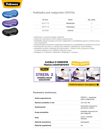 Podkładka pod nadgarstek CRYSTAL ● ● ● ● ● ● ● Nr kat. Kolor Op. jedn. 91177-72 Niebieska 1 91477-72 Fioletowa 1 9112301 Czarna 1 Wykonana z przezroczystego materiału Łatwa do czyszczenia, miła w dotyku powierzchnia Podkładka żelowa pomaga utrzymać nadgarstek w prawidłowej pozycji w trakcie pracy przy komputerze Antypoślizgowa podstawa zapobiega przesuwaniu się podkładek po powierzchni biurka Przeznaczona do pracy z myszką, przy tablecie, kalkulatorze, kasie fiskalnej Niewielkie wymiary ułatwiają jej przenoszenie - możesz mieć ją zawsze ze sobą w trakcie podróży czy w różnych miejscach pracy Dostępna w 3 kolorach: niebieskim, fioletowym i czarnym Parametry techniczne: Strefa ergonomiczna STREFA 2 - zapobiegaj bólom nadgarstków Wymiary produktu w mm 122 x18 x 88 Zastosowanie stanowisko stacjonarne, pracownicy mobilni Grupy produktów podkładki ergonomiczne pod nadgartek Kolor czarny, niebieski, fioletowy Materiał zewnętrzny polipropylen Materiał wypełnienia żel
