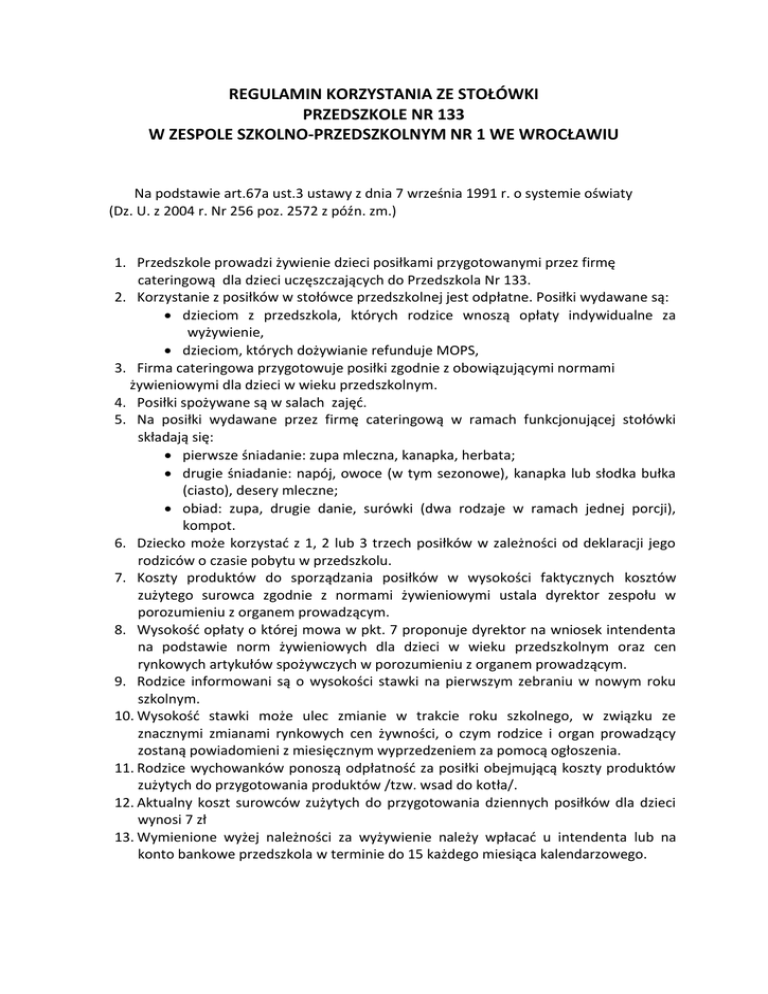 regulamin korzystania ze stołówki przedszkole nr 133 w zespole