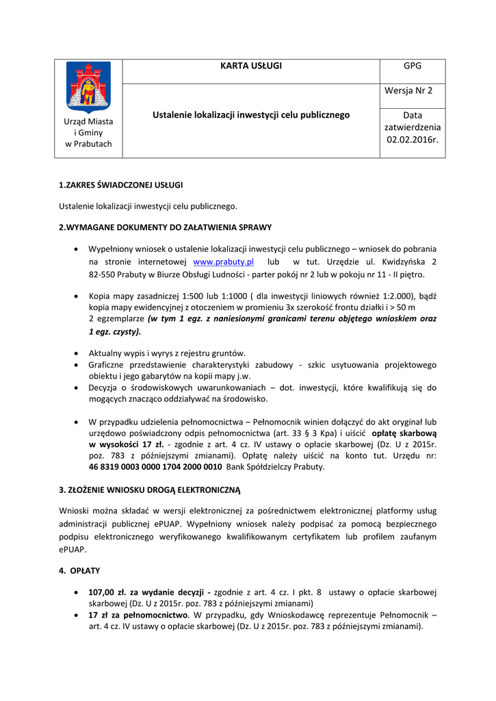 KARTA USŁUGI GPG Wersja Nr 2 Urząd Miasta i Gminy w Prabutach Ustalenie lokalizacji inwestycji celu publicznego Data zatwierdzenia 02.02.2016r. 1.ZAKRES ŚWIADCZONEJ USŁUGI Ustalenie lokalizacji inwestycji celu publicznego. 2.WYMAGANE DOKUMENTY DO ZAŁATWIENIA SPRAWY • Wypełniony wniosek o ustalenie lokalizacji inwestycji celu publicznego – wniosek do pobrania na stronie internetowej www.prabuty.pl lub w tut. Urzędzie ul. Kwidzyńska 2 82-550 Prabuty w Biurze Obsługi Ludności - parter pokój nr 2 lub w pokoju nr 11 - II piętro. • Kopia mapy zasadniczej 1:500 lub 1:1000 ( dla inwestycji liniowych również 1:2.000), bądź kopia mapy ewidencyjnej z otoczeniem w promieniu 3x szerokość frontu działki i > 50 m 2 egzemplarze (w tym 1 egz. z naniesionymi granicami terenu objętego wnioskiem oraz 1 egz. czysty). • • Aktualny wypis i wyrys z rejestru gruntów. Graficzne przedstawienie charakterystyki zabudowy - szkic usytuowania projektowego obiektu i jego gabarytów na kopii mapy j.w. Decyzja o środowiskowych uwarunkowaniach – dot. inwestycji, które kwalifikują się do mogących znacząco oddziaływać na środowisko. • • W przypadku udzielenia pełnomocnictwa – Pełnomocnik winien dołączyć do akt oryginał lub urzędowo poświadczony odpis pełnomocnictwa (art. 33 § 3 Kpa) i uiścić opłatę skarbową w wysokości 17 zł. - zgodnie z art. 4 cz. IV ustawy o opłacie skarbowej (Dz. U z 2015r. poz. 783 z późniejszymi zmianami). Opłatę należy uiścić na konto tut. Urzędu nr: 46 8319 0003 0000 1704 2000 0010 Bank Spółdzielczy Prabuty. 3. ZŁOŻENIE WNIOSKU DROGĄ ELEKTRONICZNĄ Wnioski można składać w wersji elektronicznej za pośrednictwem elektronicznej platformy usług administracji publicznej ePUAP. Wypełniony wniosek należy podpisać za pomocą bezpiecznego podpisu elektronicznego weryfikowanego kwalifikowanym certyfikatem lub profilem zaufanym ePUAP. 4. OPŁATY • • 107,00 zł. za wydanie decyzji - zgodnie z art. 4 cz. I pkt. 8 ustawy o opłacie skarbowej skarbowej (Dz. U z 2015r. poz. 783 z późniejszymi zmianami) 17 zł za pełnomocnictwo. W przypadku, gdy Wnioskodawcę reprezentuje Pełnomocnik – art. 4 cz. IV ustawy o opłacie skarbowej (Dz. U z 2015r. poz. 783 z późniejszymi zmianami). Nie pobiera się opłaty za pełnomocnictwo, jeżeli : -udzielane ono jest małżonkowi, wstępnemu, zstępnemu lub rodzeństwu - upoważnia ono do odbioru dokumentów - jeżeli mocodawcą jest podmiot określony w art. 7 pkt 1-5 ustawy o opłacie skarbowej • • • Nie pobiera się opłaty w sprawach budownictwa mieszkaniowego, nauki, szkolnictwa i oświaty pozaszkolnej oraz ochrony zdrowia. Od opłaty skarbowej zwalnia się także podmioty wykazane w art. 7 ustawy o opłacie skarbowej. Obowiązek dokonania opłaty skarbowej powstaje z chwilą złożenia wniosku. Opłatę należy uiścić na konto tut. Urzędu nr: 46 8319 0003 0000 1704 2000 0010 Bank Spółdzielczy Prabuty. 5. MIEJSCE ZŁOŻENIA DOKUMENTÓW Wniosek należy składać w Biurze Obsługi Ludności ul. Kwidzyńska 2 82-550 Prabuty, parter pokój nr 2 (w dniach pracy Urzędu 730 – 1300 w piątki , 730- 1800 w środy oraz 730- 1530 w pozostałe dni tygodnia) lub przesłać pocztą na adres: Urząd Miasta i Gminy Prabuty ul. Kwidzyńska 2 82-550 Prabuty. 6. OSOBY DO KONTAKTU Aleksandra Wlazło – Inspektor ds. planowania przestrzennego. Tel: 55-262-41-47 e-mail: [email protected] 7. SPOSÓB I TERMIN ZAŁATWIENIA Organ wydaje decyzję w terminie do 65 dni – art. 51 ust. 2 ustawy z dnia 27 marca 2003r. o planowaniu i zagospodarowaniu przestrzennym (Dz. U. 2015 poz. 199 t.j. z późniejszymi zmianami). Termin może zostać przedłużony w przypadku: konieczności uzgodnienia projektu decyzji z określonymi w przepisach instytucjami lub prowadzenia postępowania wyjaśniającego lub z innych przyczyn niezależnych od organu. Zgodnie z art. 36 Kpa (Dz. U 2016 poz. 23 t.j.) o każdym przypadku niezałatwienia sprawy w terminie określonym w art. 35 Kpa, organ administracji publicznej jest obowiązany zawiadomić strony, podając przyczyny zwłoki i wskazując nowy termin załatwienia sprawy. 8. TRYB ODWOŁAWCZY Odwołanie od decyzji wnosi się do Samorządowego Kolegium Odwoławczego w Gdańsku za pośrednictwem Burmistrza Miasta i Gminy Prabuty w terminie 14 dni od dnia doręczenia decyzji. 9. PODSTAWA PRAWNA art. 4 ust.2 pkt. 1, art. 50 ust. 1 i 4, art. 51 - 56 ustawy z dnia 27 marca 2003r. o planowaniu i zagospodarowaniu przestrzennym (Dz. U. 2015 poz. 199 t.j. z późniejszymi zmianami); art.6 ustawy z dnia 21 sierpnia 1997r. o gospodarce nieruchomościami (Dz.U. z 2015r, poz.1744 t.j. z późniejszymi zmianami) oraz art. 104 ustawy z dnia 14 czerwca 1960r. Kodeks postępowania administracyjnego (Dz. U 2016 poz. 23 t.j.) 10. UWAGI • W przypadku stwierdzenia, iż wniosek jest niekompletny, tut. organ wzywa wnioskodawcę do uzupełnienia braków w terminie 7 dni od daty otrzymania pisma - art. 64 § 2 Kpa. Nie uzupełnienie braków w terminie spowoduje pozostawienie sprawy bez rozpoznania, a ponowne wszczęcie może nastąpić po złożeniu nowego wniosku wraz z kompletem dokumentów. • W przypadku braku opłaty skarbowej tut. organ wzywa, zgodnie z art. 261 § 1 i 2 Kodeksu postępowania administracyjnego, do dostarczenia dowodu opłaty skarbowej w terminie 7 dni od daty otrzymania pisma. Nie dostarczenie w/w dowodu spowoduje zaniechanie czynności, a podanie zostanie zwrócone wnioskodawcy. Zgodnie z 3 § ust.1 Rozporządzenia Ministra Finansów z dnia 28 września 2007r. w sprawie zapłaty opłaty skarbowej (Dz.U. z 2007r. nr 187 poz. 1330) składający wniosek zobowiązany jest dołączyć oryginalny dowód zapłaty należnej opłaty skarbowej albo uwierzytelnioną kopię dowodu zapłaty opłaty skarbowej. Dowód zapłaty może mieć formę wydruku potwierdzającego dokonanie operacji bankowej. Jednocześnie informuje się, iż zgodnie z w/w rozporządzeniem za uwierzytelnion