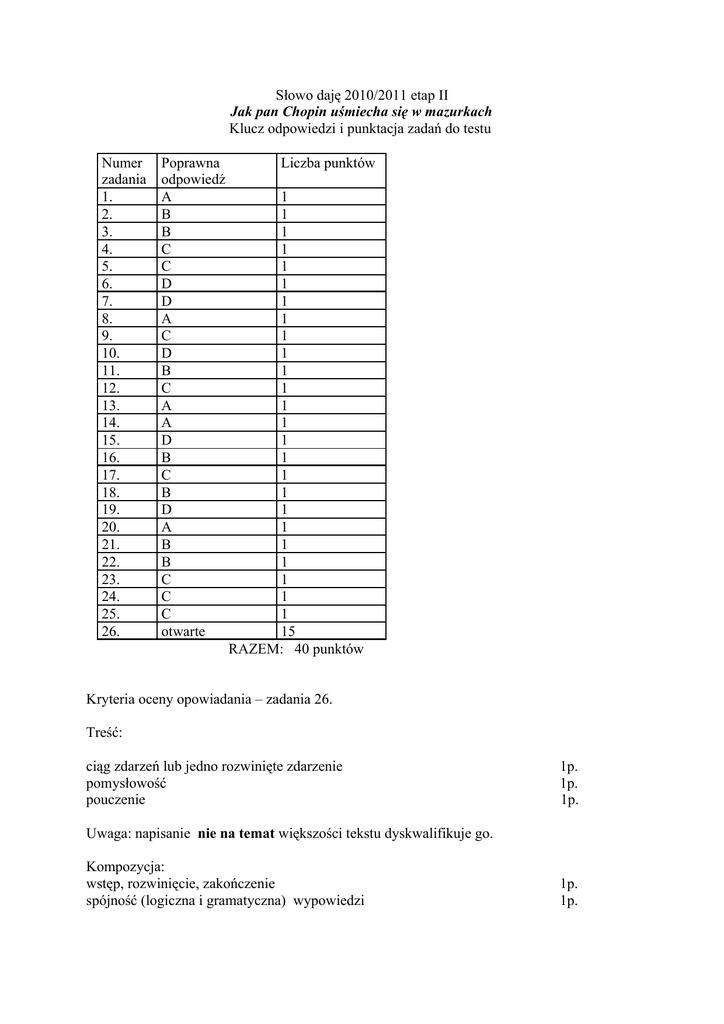 Słowo daję 2010/2011 etap II Jak pan Chopin uśmiecha się w mazurkach Klucz odpowiedzi i punktacja zadań do testu Numer zadania 1. 2. 3. 4. 5. 6. 7. 8. 9. 10. 11. 12. 13. 14. 15. 16. 17. 18. 19. 20. 21. 22. 23. 24. 25. 26. Poprawna odpowiedź A B B C C D D A C D B C A A D B C B D A B B C C C otwarte Liczba punktów 1 1 1 1 1 1 1 1 1 1 1 1 1 1 1 1 1 1 1 1 1 1 1 1 1 15 RAZEM: 40 punktów Kryteria oceny opowiadania – zadania 26. Treść: ciąg zdarzeń lub jedno rozwinięte zdarzenie pomysłowość pouczenie 1p. 1p. 1p. Uwaga: napisanie nie na temat większości tekstu dyskwalifikuje go. Kompozycja: wstęp, rozwinięcie, zakończenie spójność (logiczna i gramatyczna) wypowiedzi 1p. 1p. Język: bogate słownictwo urozmaicona składnia poprawność językowa (dopuszczalne dwa błędy) Ortografia: (0 – 1bł. = 2p; 2 –3 bł. = 1p; 4 bł. i więcej = 0p.) Interpunkcja: (0 – 3bł. = 1p; 4 bł. i więcej = 0p.) 1p. 1p. 1p. 0 – 2p. 1p. Zapis: akapity czytelność i estetyka zapisu 1p. 1p. Nagroda: za oryginalne rozwinięcie tematu za szczególne walory językowe 1p. 1p. RAZEM: 15p.