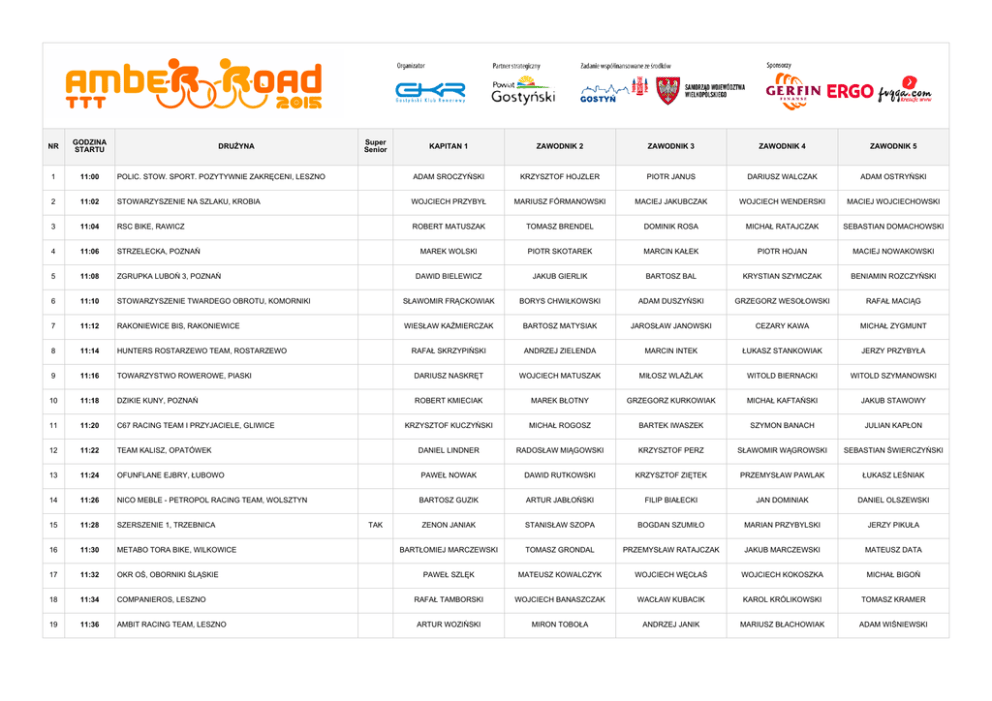 NR GODZINA STARTU 1 11:00 2 DRUŻYNA Super Senior KAPITAN 1 ZAWODNIK 2 ZAWODNIK 3 ZAWODNIK 4 ZAWODNIK 5 POLIC. STOW. SPORT. POZYTYWNIE ZAKRĘCENI, LESZNO ADAM SROCZYŃSKI KRZYSZTOF HOJZLER PIOTR JANUS DARIUSZ WALCZAK ADAM OSTRYŃSKI 11:02 STOWARZYSZENIE NA SZLAKU, KROBIA WOJCIECH PRZYBYŁ MARIUSZ FÓRMANOWSKI MACIEJ JAKUBCZAK WOJCIECH WENDERSKI MACIEJ WOJCIECHOWSKI 3 11:04 RSC BIKE, RAWICZ ROBERT MATUSZAK TOMASZ BRENDEL DOMINIK ROSA MICHAŁ RATAJCZAK SEBASTIAN DOMACHOWSKI 4 11:06 STRZELECKA, POZNAŃ MAREK WOLSKI PIOTR SKOTAREK MARCIN KAŁEK PIOTR HOJAN MACIEJ NOWAKOWSKI 5 11:08 ZGRUPKA LUBOŃ 3, POZNAŃ DAWID BIELEWICZ JAKUB GIERLIK BARTOSZ BAL KRYSTIAN SZYMCZAK BENIAMIN ROZCZYŃSKI 6 11:10 STOWARZYSZENIE TWARDEGO OBROTU, KOMORNIKI SŁAWOMIR FRĄCKOWIAK BORYS CHWIŁKOWSKI ADAM DUSZYŃSKI GRZEGORZ WESOŁOWSKI RAFAŁ MACIĄG 7 11:12 RAKONIEWICE BIS, RAKONIEWICE WIESŁAW KAŹMIERCZAK BARTOSZ MATYSIAK JAROSŁAW JANOWSKI CEZARY KAWA MICHAŁ ZYGMUNT 8 11:14 HUNTERS ROSTARZEWO TEAM, ROSTARZEWO RAFAŁ SKRZYPIŃSKI ANDRZEJ ZIELENDA MARCIN INTEK ŁUKASZ STANKOWIAK JERZY PRZYBYŁA 9 11:16 TOWARZYSTWO ROWEROWE, PIASKI DARIUSZ NASKRĘT WOJCIECH MATUSZAK MIŁOSZ WLAŹLAK WITOLD BIERNACKI WITOLD SZYMANOWSKI 10 11:18 DZIKIE KUNY, POZNAŃ ROBERT KMIECIAK MAREK BŁOTNY GRZEGORZ KURKOWIAK MICHAŁ KAFTAŃSKI JAKUB STAWOWY 11 11:20 C67 RACING TEAM I PRZYJACIELE, GLIWICE KRZYSZTOF KUCZYŃSKI MICHAŁ ROGOSZ BARTEK IWASZEK SZYMON BANACH JULIAN KAPŁON 12 11:22 TEAM KALISZ, OPATÓWEK DANIEL LINDNER RADOSŁAW MIĄGOWSKI KRZYSZTOF PERZ SŁAWOMIR WĄGROWSKI SEBASTIAN ŚWIERCZYŃSKI 13 11:24 OFUNFLANE EJBRY, ŁUBOWO PAWEŁ NOWAK DAWID RUTKOWSKI KRZYSZTOF ZIĘTEK PRZEMYSŁAW PAWLAK ŁUKASZ LEŚNIAK 14 11:26 NICO MEBLE - PETROPOL RACING TEAM, WOLSZTYN BARTOSZ GUZIK ARTUR JABŁOŃSKI FILIP BIAŁECKI JAN DOMINIAK DANIEL OLSZEWSKI 15 11:28 SZERSZENIE 1, TRZEBNICA ZENON JANIAK STANISŁAW SZOPA BOGDAN SZUMIŁO MARIAN PRZYBYLSKI JERZY PIKUŁA 16 11:30 METABO TORA BIKE, WILKOWICE BARTŁOMIEJ MARCZEWSKI TOMASZ GRONDAL PRZEMYSŁAW RATAJCZAK JAKUB MARCZEWSKI MATEUSZ DATA 17 11:32 OKR OŚ, OBORNIKI ŚLĄSKIE PAWEŁ SZLĘK MATEUSZ KOWALCZYK WOJCIECH WĘCŁAŚ WOJCIECH KOKOSZKA MICHAŁ BIGOŃ 18 11:34 COMPANIEROS, LESZNO RAFAŁ TAMBORSKI WOJCIECH BANASZCZAK WACŁAW KUBACIK KAROL KRÓLIKOWSKI TOMASZ KRAMER 19 11:36 AMBIT RACING TEAM, LESZNO ARTUR WOZIŃSKI MIRON TOBOŁA ANDRZEJ JANIK MARIUSZ BŁACHOWIAK ADAM WIŚNIEWSKI TAK NR GODZINA STARTU 20 11:38 EURO-ROWER.PL 2, LESZNO 21 11:40 FOGT BIKES 2, ZALASEWO 22 11:42 GALIBIER - BIKEFUN TEAM 2, LESZNO 23 11:44 24 DRUŻYNA Super Senior KAPITAN 1 ZAWODNIK 2 ZAWODNIK 3 ZAWODNIK 4 ZAWODNIK 5 KONRAD ANTKOWIAK DOMINIK ZEH MATEUSZ KUŚNIEREK ANDRZEJ SKIBA ADAM ŁUCARZ WOJTEK WIKA-CZARNOWSKI TOMASZ KWIATKOWSKI RAFAŁ MERMELA WOJTEK JAŁOWSKI ARTUR KACZMAREK PIOTR KUKLA DANIEL ROZWALKA MICHAŁ WOŹNY MIROSŁAW MIAŁKOWSKI WIESŁAW JÓZEFOWIAK SILESIAN RIDERS, KATOWICE JAKUB GRANEK BARTŁOMIEJ GRANEK ŁUKASZ CISZEK PATRYK MAZUREK TOMASZ JAKUBCZAK 11:46 ZGRUPKA LUBOŃ 2, POZNAŃ JAROSŁAW JAKUBCZAK PAWEŁ WILIŃSKI KRZYSZTOF SOBOK ANDRZEJ MIECHKOTKA MATEUSZ WASIELEWSKI 25 11:48 JF DUET, GOLENIÓW FRANCISZEK HARBACEWICZ ARTUR SPŁAWSKI TADEUSZ JASIONEK WOJCIECH BARTOLEWSKI ZBIGNIEW KACZAŁA 26 11:50 FTI RACING TEAM 3, POZNAŃ PIOTR NAPIERAŁA PIOTR SIEBERT MACIEJ NOWACZYK MICHAŁ CZEPIŻAK KRYSTIAN KWIDZYŃSKI 27 11:52 ORZEŁ, LIPNO PIOTR RATAJCZAK PAWEŁ CZECHOLIŃSKI MIKOŁAJ ADAMSKI MARCIN BANASZKIEWICZ MIROSŁAW MIKOŁAJCZAK 28 11:54 KLUB KOLARSKI FALA PARK 2, WOLSZTYN GRZEGORZ ŚNITA PAWEŁ FRANZ DARIUSZ STĘSIK BARTOSZ MIKOŁAJCZAK ADRIAN NOWAK 29 11:56 AMATORSKA GRUPA KOLARSKA IKS SPARTAKUS, KOŹMIN ARKADIUSZ ZMYŚLONY RAFAŁ DYKCIK MIKOŁAJ KORDUS MICHAŁ MIELCAREK LESZEK ZMYŚLONY 30 11:58 OTR INTERKOL 3, OSTRÓW WLKP. JAKUB LATAJKA RADOSŁAW RAŚ DAMIAN MICHALSKI KRZYSZTOF JUST MATEUSZ BARAŃSKI 31 12:00 GVT GIRLS + FRIENDS, WROCŁAW CECYLIA CZARTORYSKA OKSANA KRYSIUK JOANNA WOŁODŹKO BARBARA SOBCZYK AGNIESZKA JASTRZĘBSKA 32 12:02 FOGT BIKES 1, ZALASEWO RAFAŁ JACKOWSKI MACIEJ SOCHA SZYMON BRZOZOWSKI PIOTR ZAJĄC DAWID KSIĄŻKIEWICZ 33 12:04 BPRACING TEAM, KÓRNIK-BNIN PAWEŁ WALERCZYK MACIEJ KĘDZIORA KRZYSZTOF PIESIAK ALEKSANDER DZIEDZIC MACIEJ CHRUSZCZ 34 12:06 SZERSZENIE 2, TRZEBNICA PRZEMYSŁAW KOMOROWSKI PAWEŁ BUCZAK ZBIGNIEW ZARADNIEWICZ GERARD SKALSKI RAFAŁ WIATRAK 35 12:08 STREFASPORTU.PL 2, LESZNO DARIUSZ DROBNIAK RAFAŁ GŁUSZAK ARTUR JANIK JÓZEF SZEIBE ADAM BAKSALARY 36 12:10 GVT 8, WROCŁAW SŁAWOMIR KŁOS KONRAD KUNICKI PAWEŁ GRYSZKIEWICZ DANIEL DUŚKO JACEK JĘDRZEJCZYK 37 12:12 OSTRE KOŁO STELMASZYŃSKI GERFIN TEAM, GOSTYŃ MICHAŁ GRZEŚKOWIAK TOMASZ STELMASZYŃSKI SZYMON MAJCHRZAK MAREK KARKOS BARTEK ZYGMUNT 38 12:14 DINOZAURY KAMELEON TEAM, PIŁA LESZEK SADOWSKI MAREK TACIAK ANDRZEJ ROSZCZYK RADOSŁAW DROGOSZ JERZY MACIOSZEK TAK TAK NR GODZINA STARTU 39 12:16 40 DRUŻYNA Super Senior KAPITAN 1 ZAWODNIK 2 ZAWODNIK 3 ZAWODNIK 4 ZAWODNIK 5 35 PLUS, LESZNO ANDRZEJ NAWROCKI FILIP BAGIŃSKI MACIEJ MICHNOWSKI KRZYSZTOF DĄBKOWSKI MICHAŁ CIEKAŃSKI 12:18 EURO-ROWER.PL 1, LESZNO RAFAŁ WIATROWSKI ROBERT FURMAŃCZAK PIOTR KRYSMAN MATEUSZ MRÓZ ROBERT MENCFELDOWSKI 41 12:20 GVT 7, WROCŁAW BŁAŻEJ PIETRZAK ŁUKASZ PAWŁOWSKI PAWEŁ FILIPCZAK GRZEGORZ KALINOWSKI JANUSZ GARBERA 42 12:22 GATTA BIKE TEAM, ZDUŃSKA WOLA GRZEGORZ TURKIEWICZ DARIUSZ MALINOWSKI ADAM OSTOJSKI PRZEMYSŁAW JUSZKIEWICZ DOMINIK KAPUSTA 43 12:24 GALIBIER - BIKEFUN TEAM 1, LESZNO MIROSŁAW KAJOCH WALDEMAR KAJOCH ADAM DUDZIAK MICHAŁ ZAWORSKI BARTOSZ MIKLER 44 12:26 MW INVEST GROUP, WARSZAWA PRZEMYSŁAW ROZWALKA MIKOŁAJ KONIECZNY DARIUSZ MARKIEWICZ ADRIAN KAŹMIERCZAK ADAM KĘDZIA 45 12:28 KLUB KOLARSKI FALA PARK 1, WOLSZTYN MACIEJ ROŚCISZEWSKI MARCIN ROBAKOWSKI JAKUB KOMCZYŃSKI SŁAWOMIR KUCZ MAREK MICHALSKI 46 12:30 GVT 2, WROCŁAW SEBASTIAN BIRUTA MARIUSZ ANDREJÓW ROBERT CHYLARECKI RADOSŁAW KUDŁA DARIUSZ WIZNER 47 12:32 REAL 64-STO 2, LESZNO PRZEMYSŁAW NALEWAJ JAKUB KAZUBSKI OSKAR SKRZYCZAK T