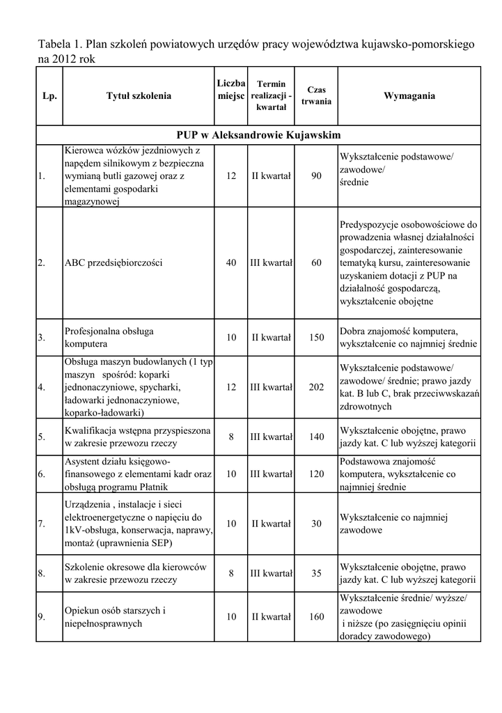 Tabela 1. Plan szkoleń powiatowych urzędów pracy województwa kujawsko-pomorskiego na 2012 rok Lp. Liczba Termin miejsc realizacji - Tytuł szkolenia kwartał Czas trwania Wymagania PUP w Aleksandrowie Kujawskim 1. Kierowca wózków jezdniowych z napędem silnikowym z bezpieczna wymianą butli gazowej oraz z elementami gospodarki magazynowej 12 II kwartał 90 Wykształcenie podstawowe/ zawodowe/ średnie 2. ABC przedsiębiorczości 40 III kwartał 60 Predyspozycje osobowościowe do prowadzenia własnej działalności gospodarczej, zainteresowanie tematyką kursu, zainteresowanie uzyskaniem dotacji z PUP na działalność gospodarczą, wykształcenie obojętne 3. Profesjonalna obsługa komputera 10 II kwartał 150 Dobra znajomość komputera, wykształcenie co najmniej średnie 4. Obsługa maszyn budowlanych (1 typ maszyn spośród: koparki jednonaczyniowe, spycharki, ładowarki jednonaczyniowe, koparko-ładowarki) 12 III kwartał 202 Wykształcenie podstawowe/ zawodowe/ średnie; prawo jazdy kat. B lub C, brak przeciwwskazań zdrowotnych 5. Kwalifikacja wstępna przyspieszona w zakresie przewozu rzeczy 8 III kwartał 140 Wykształcenie obojętne, prawo jazdy kat. C lub wyższej kategorii 6. Asystent działu księgowofinansowego z elementami kadr oraz obsługą programu Płatnik 10 III kwartał 120 Podstawowa znajomość komputera, wykształcenie co najmniej średnie 7. Urządzenia , instalacje i sieci elektroenergetyczne o napięciu do 1kV-obsługa, konserwacja, naprawy, montaż (uprawnienia SEP) 10 II kwartał 30 Wykształcenie co najmniej zawodowe 8. Szkolenie okresowe dla kierowców w zakresie przewozu rzeczy 8 III kwartał 35 Wykształcenie obojętne, prawo jazdy kat. C lub wyższej kategorii 9. Opiekun osób starszych i niepełnosprawnych 160 Wykształcenie średnie/ wyższe/ zawodowe i niższe (po zasięgnięciu opinii doradcy zawodowego) 10 II kwartał Lp. Tytuł szkolenia Liczba Termin miejsc realizacji kwartał 10. 11. Kurs dokształcający dla kierowców przewożących towary niebezpieczne ADR + cysterny Szkolenie z zakresu aktywnego poszukiwania pracy 12. Promocja przedsiębiorczości 13. Kwalifikacja wstępna przyspieszona w zakresie przewozu rzeczy Czas trwania Wymagania 10 III kwartał 40 Wykształcenie obojętne, prawo jazdy kat. C lub wyższej kategorii, ukończone 21lat 100 cały rok 80 Wykształcenie obojętne PUP w Brodnicy II, III, IV 30 kwartał 5 II kwartał 60 140 Osoby bezrobotne zarejestrowane w PUP Osoby bezrobotne lub poszukujące pracy, zarejestrowane w PUP, które - ukończyły 21 lat, - posiadają prawo jazdy kat. CE PUP w Bydgoszczy 14. 15. 16. 17. Projektowanie i pielęgnacja terenów zielonych Monter instalacji wodnokanalizacyjnej Pilarz - drwal Brukarz 10 11 6 8 maj maj maj maj 80 Osoby bezrobotne powyżej 50 roku życia, które: posiadają co najmniej wykształcenie podstawowe, nie mają prawa do zasiłku, nie korzystały ze środków EFS w latach 2008-2012 200 Osoby bezrobotne powyżej 50 roku życia, które: posiadają co najmniej wykształcenie podstawowe, nie mają prawa do zasiłku, nie korzystały ze środków EFS w latach 2008-2012 130 Osoby bezrobotne powyżej 50 roku życia, które: posiadają co najmniej wykształcenie podstawowe, nie mają prawa do zasiłku, nie korzystały ze środków EFS w latach 2008-2012 150 Osoby bezrobotne powyżej 50 roku życia, które: posiadają co najmniej wykształcenie podstawowe, nie mają prawa do zasiłku, nie korzystały ze środków EFS w latach 2008-2012 Lp. Tytuł szkolenia Liczba Termin miejsc realizacji kwartał 18. 19. 20. 21. Opiekun dzieci oraz osób przewlekle chorych i niepełnosprawnych Monitoring miasta Operator koparko-ładowarki Spawanie metodą MAG 5 10 30 30 maj maj lipiecwrzesień sierpieńpaździernik Czas trwania Wymagania 240 Osoby bezrobotne powyżej 50 roku życia, które: posiadają co najmniej wykształcenie podstawowe, nie mają prawa do zasiłku, nie korzystały ze środków EFS w latach 2008-2012, posiadają predyspozycje do pracy z ludźmi, posiadają wykształcenie średnie 64 Osoby bezrobotne powyżej 50 roku życia, które: posiadają co najmniej wykształcenie podstawowe, nie mają prawa do zasiłku, nie korzystały ze środków EFS w latach 2008-2012 176 Szkolenie przeznaczone dla osób bezrobotnych, poszukujących pracy z art. 43 ustawy o promocji zatrudnienia i instytucjach rynku pracy oraz osób niepełnosprawnych poszukujących pracy niepozostających w zatrudnieniu, z minimum podstawowym wykształceniem, mile widziane prawo jazdy kat. C 152 Szkolenie przeznaczone dla osób bezrobotnych, poszukujących pracy z art. 43 ustawy o promocji zatrudnienia i instytucjach rynku pracy oraz osób niepełnosprawnych poszukujących pracy niepozostających w zatrudnieniu, preferowane wykształcenie zasadnicze zawodowe Lp. Tytuł szkolenia Liczba Termin miejsc realizacji kwartał 22. 23. Spawanie metodą TIG Fakturzysta z obsługą kasy fiskalnej 30 50 lipieclistopad czerwiecpaździernik Czas trwania Wymagania 112 Szkolenie przeznaczone dla osób bezrobotnych, poszukujących pracy z art. 43 ustawy o promocji zatrudnienia i instytucjach rynku pracy oraz osób niepełnosprawnych poszukujących pracy niepozostających w zatrudnieniu, preferowane wykształcenie zasadnicze zawodowe 80 Szkolenie przeznaczone dla osób bezrobotnych, poszukujących pracy z art. 43 ustawy o promocji zatrudnienia i instytucjach rynku pracy oraz osób niepełnosprawnych poszukujących pracy niepozostających w zatrudnieniu, spełniających następujące warunki: -mających ukończoną co najmniej zasadnicza szkołę zawodową i - posiadających podstawową znajomość obsługi komputera oraz - wyrażających chęć pracy w handlu (we wszystkich branżach) i - posiadających predyspozycje do pracy z klientem – wynikające z opinii doradcy zawodowego Lp. Tytuł szkolenia Liczba Termin miejsc realizacji kwartał 24. 25. Księgowość komputerowa Specjalista do spraw nowoczesnych technik sprzedaży z telemarketin