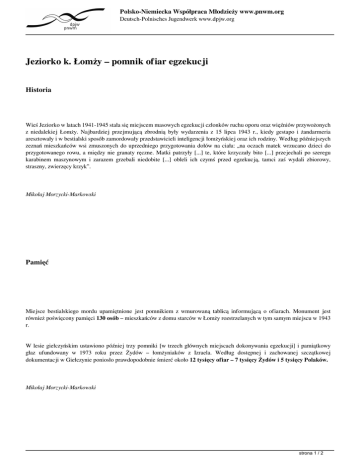 Polsko-Niemiecka Współpraca Młodzieży www.pnwm.org Deutsch-Polnisches Jugendwerk www.dpjw.org Jeziorko k. Łomży – pomnik ofiar egzekucji Historia Wieś Jeziorko w latach 1941-1945 stała się miejscem masowych egzekucji członków ruchu oporu oraz więźniów przywożonych z niedalekiej Łomży. Najbardziej przejmującą zbrodnią były wydarzenia z 15 lipca 1943 r., kiedy gestapo i żandarmeria aresztowały i w bestialski sposób zamordowały przedstawicieli inteligencji łomżyńskiej oraz ich rodziny. Według późniejszych zeznań mieszkańców wsi zmuszonych do uprzedniego przygotowania dołów na ciała: „na oczach matek wrzucano dzieci do przygotowanego rowu, a między nie granaty ręczne. Matki patrzyły [...] te, które krzyczały bito [...] przejechali po szeregu karabinem maszynowym i zarazem grzebali niedobite [...] obleli ich czymś przed egzekucją, tamci zaś wydali zbiorowy, straszny, zwierzęcy krzyk”. Mikołaj Morzycki-Markowski Pamięć Miejsce bestialskiego mordu upamiętnione jest pomnikiem z wmurowaną tablicą informującą o ofiarach. Monument jest również poświęcony pamięci 130 osób – mieszkańców z domu starców w Łomży rozstrzelanych w tym samym miejscu w 1943 r. W lesie giełczyńskim ustawiono później trzy pomniki [w trzech głównych miejscach dokonywania egzekucji] i pamiątkowy głaz ufundowany w 1973 roku przez Żydów – łomżyniaków z Izraela. Według dostępnej i zachowanej szczątkowej dokumentacji w Giełczynie poniosło prawdopodobnie śmierć około 12 tysięcy ofiar – 7 tysięcy Żydów i 5 tysięcy Polaków. Mikołaj Morzycki-Markowski strona 1 / 2 Polsko-Niemiecka Współpraca Młodzieży www.pnwm.org Deutsch-Polnisches Jugendwerk www.dpjw.org Informacje praktyczne Jeziorko k. Łomży – pomnik ofiar egzekucji Dojazd: Łomża leży na skrzyżowaniu dróg krajowych 61 i 64; dojazd koleją: rozkłady jazdy na www.pkp.pl; zdjęcie pomnika na stronie www.lomza.friko.pl/galeria/pomniki.htm. Jeziorko k. Łomży http://www.jeziorko.canonia.pl/ strona 2 / 2 Powered by TCPDF (www.tcpdf.org)