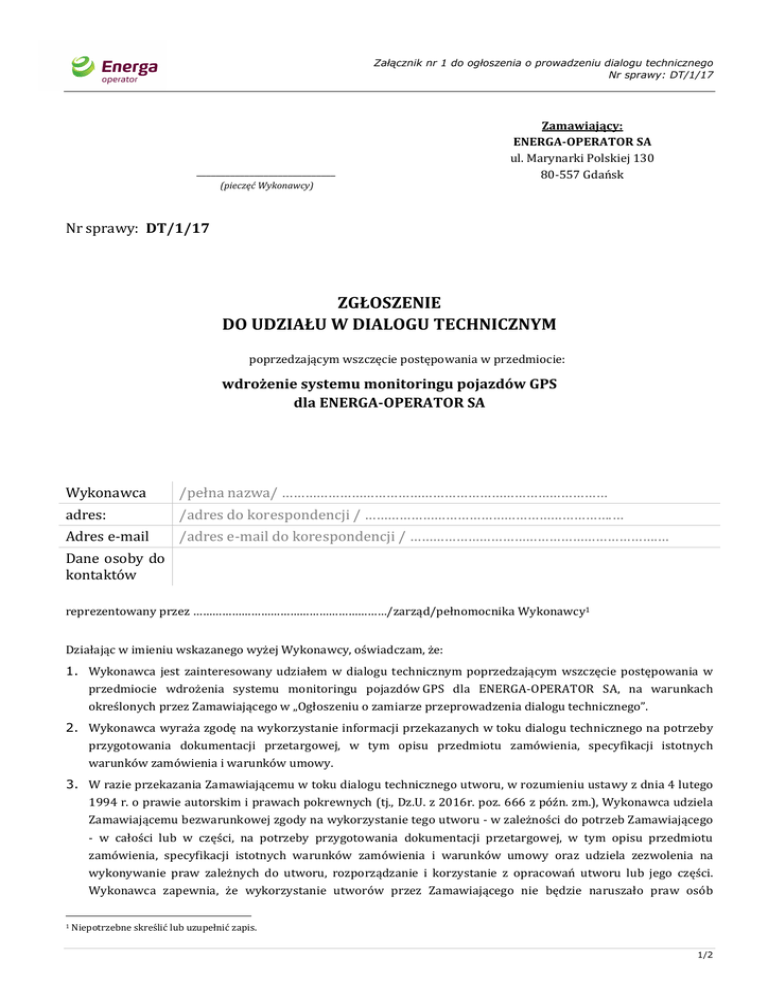 Załącznik nr 1 do ogłoszenia o prowadzeniu dialogu technicznego Nr sprawy: DT/1/17 _____________________________ Zamawiający: ENERGA-OPERATOR SA ul. Marynarki Polskiej 130 80-557 Gdańsk (pieczęć Wykonawcy) Nr sprawy: DT/1/17 ZGŁOSZENIE DO UDZIAŁU W DIALOGU TECHNICZNYM poprzedzającym wszczęcie postępowania w przedmiocie: wdrożenie systemu monitoringu pojazdów GPS dla ENERGA-OPERATOR SA Wykonawca /pełna nazwa/ ………………………………………………………………………… adres: /adres do korespondencji / ……………………………………………………….… Adres e-mail /adres e-mail do korespondencji / ……………………………………………………….… Dane osoby do kontaktów reprezentowany przez ……………………………………………………/zarząd/pełnomocnika Wykonawcy1 Działając w imieniu wskazanego wyżej Wykonawcy, oświadczam, że: 1. Wykonawca jest zainteresowany udziałem w dialogu technicznym poprzedzającym wszczęcie postępowania w przedmiocie wdrożenia systemu monitoringu pojazdów GPS dla ENERGA-OPERATOR SA, na warunkach określonych przez Zamawiającego w „Ogłoszeniu o zamiarze przeprowadzenia dialogu technicznego”. 2. Wykonawca wyraża zgodę na wykorzystanie informacji przekazanych w toku dialogu technicznego na potrzeby przygotowania dokumentacji przetargowej, w tym opisu przedmiotu zamówienia, specyfikacji istotnych warunków zamówienia i warunków umowy. 3. W razie przekazania Zamawiającemu w toku dialogu technicznego utworu, w rozumieniu ustawy z dnia 4 lutego 1994 r. o prawie autorskim i prawach pokrewnych (tj., Dz.U. z 2016r. poz. 666 z późn. zm.), Wykonawca udziela Zamawiającemu bezwarunkowej zgody na wykorzystanie tego utworu - w zależności do potrzeb Zamawiającego - w całości lub w części, na potrzeby przygotowania dokumentacji przetargowej, w tym opisu przedmiotu zamówienia, specyfikacji istotnych warunków zamówienia i warunków umowy oraz udziela zezwolenia na wykonywanie praw zależnych do utworu, rozporządzanie i korzystanie z opracowań utworu lub jego części. Wykonawca zapewnia, że wykorzystanie utworów przez Zamawiającego nie będzie naruszało praw osób 1 Niepotrzebne skreślić lub uzupełnić zapis. 1/2 Załącznik nr 1 do ogłoszenia o prowadzeniu dialogu technicznego Nr sprawy: DT/1/17 trzecich. 4. Jednocześnie w Załączniku nr 1 do niniejszego Zgłoszenia Wykonawca przekazuje dokładniejsze informacje o Wykonawcy, jego działalności oraz o doświadczeniach związanych z wdrażaniem systemu monitoringu pojazdów GPS2. 5. Załącznikami do niniejszego Zgłoszenia są:3 Załącznik nr 1. – Informacje o Wykonawcy i opis doświadczenia Wykonawcy Załącznik nr 2. – Odpis z KRS lub innego właściwego rejestru. Załącznik nr 3. – Pełnomocnictwo /o ile dotyczy/ _________________, dnia ____ ____ 2017 roku _____________________________________ (pieczęć imienna i podpis osoby upoważnionej do reprezentowania Wykonawcy) 2 3 Zamawiający oczekuje jak najdokładniejszego opisu i wskazania okoliczności uzasadniających udział Wykonawcy w dialogu technicznym. Niepotrzebne skreślić. 2/2