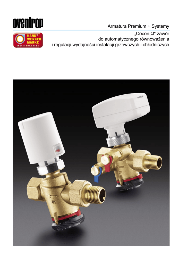 Armatura Premium + Systemy „Cocon Q“ zawór do automatycznego równoważenia i regulacji wydajności instalacji grzewczych i chłodniczych „Cocon Q” - zawór regulacyjny Budowa i działanie Legenda: 1 Element membranowy 2 Zawór regulacyjny 3 Elementy równoważące 4 Pokrętło ręczne 5 Membrana 6 Tuleja 2 p3 Odpowiednio doposażony zawór służy do automatycznego równoważenia instalacji i regulacji temperatury pomieszczeń ogrzewanych bądź chłodzonych z użyciem belek sufitowych, klimakonwektorów, instalacji podłogowych i innych. p3 1 p2 5 6 3 4 1 M p3 p2 p1 1 2 3 p1-p3 2 1 Za pomocą pokrętła ręcznego (4) nastawiamy wielkość przepływu maksymalnego przewidzianą dla danego zaworu. Nastawa jest zabezpieczona przed nieuprawnioną ingerencją poprzez odpowiednie zazębienie pokrętła z korpusem zaworu i zablokowanie pozycji za pomocą pierścienia blokującego. Po zamontowaniu napędu zawór reguluje przepływ w ograniczonym nastawą zakresie. Na przekroju zaworu pokazano trzy strefy różniące się wartością panującego w nich ciśnienia: „p1” – ciśnienie na wlocie, „p3” – ciśnienie na wylocie, „p2” – ciśnienie robocze w komorze membrany, oddziaływujące na membranę w sposób zapewniający stałość różnicy ciśnień (p2–p3). Różnica ciśnień „p2-p3” utrzymywana jest na stałym poziomie również w przypadku nagłych zmian wartości różnicy ciśnień „p1-p3”, wywołanych np. włączaniem lub wyłączaniem urządzeń podłączonych do instalacji. Dzięki temu możliwe jest utrzymanie prawie 100%-wego autorytetu zaworów. Przepływ [l/h] . V 2 - DN15 do DN32 - z króćcami pomiarowymi lub bez - wlot: półśrubunek, wylot: GW (gwint wewnętrzny) lub wlot i wylot: GW 2 W zaworze „Cocon Q” zintegrowano funkcje realizowane dotychczas przez trzy różne zawory. Element membranowy (1) działa jak regulator różnicy ciśnień, utrzymując stały spadek ciśnienia (p2–p3) odkładający się na dwóch zaworach: regulacyjnym wyposażonym w napęd (2) i ręcznie obsługiwanym zaworze równoważącym (3). p2-p3 - const 3 Zawory wykonane są z mosiądzu odpornego na odcynkowanie; uszczelki z EPDM wzgl. z PTFE. Trzpień zaworu ze stali nierdzewnej. Rodzaje wykonania: p1 0 W zaworach regulacyjnych „Cocon Q” firmy Oventrop zintegrowano funkcje automatycznego ograniczenia przepływu (do wartości zadanej ustawianej za pomocą pokrętła) i regulacji wydajności urządzeń zamontowanych w zamkniętych systemach instalacyjnych – po zamontowaniu odpowiedniego napędu. Poprzez napęd rozumie się siłowniki nastawcze elektrotermiczne lub elektromotoryczne, regulatory temperatury lub ręczne pokrętła regulacyjne (wymagany gwint napędu – M 30x1,5). 0,16 Różnica ciśnień p1-p3 [bar] 4 Zakres regulacji Nastawa wstępna 3 Za pomocą pokrętła ręcznego ustawiany jest przepływ maksymalny (V) dla danego zaworu. W zakresie ciśnienia od 0,16 do 4 barów utrzymywany jest on na nastawionym poziomie. W fazie częściowego odbioru mocy przepływ (i tym samym dopływ energii do pomieszczenia) dławiony jest przez grzybek zaworu regulacyjnego do wielkości zapotrzebowanej. „Cocon Q” - zawór regulacyjny Zalety Zalety: – stały, wysoki autorytet – małe rozmiary – 1 dostęp do pokrętła nastawy przepływu maksymalnego oraz możliwość kontroli ustawienia nawet przy zamontowanym napędzie 1 2 – 2 nastawioną wartość przepływu zadanego można odczytać przy zamontowanym napędzie, co jest szczególnie ważne dla sprawnej kontroli instalacji i sporządzenia protokołu regulacji. Nastawa jest zabezpieczona przed nieuprawnioną ingerencją poprzez odpowiednie zazębienie pokrętła z korpusem zaworu i zablokowanie pozycji za pomocą czerwonego pierścienia blokującego. – 3 dla zwiększenia czytelności skalę nastawy naniesiono na dwóch krawędziach pokrętła ręcznego, ukosowanych pod kątem 45°. Umożliwia to jej odczyt pod dowolnym kątem w różnych warunkach zabudowy. – 4 skala wyrażona jest w jednostkach naturalnych (l/h) i umożliwia powzięcie informacji o wielkości przepływu bez konieczności przeliczenia. Dobrze widoczny zakres nastawy jest nadrukowany na pokrętle. – 5 poprzez zaplombowanie pierścienia blokującego wybrana nastawa może być dodatkowo zabezpieczona przed nieuprawnioną ingerencją 3 4 – 6 za pomocą komputera pomiarowego „OV-DMC2” podłączonego do króćców pomiarowych zaworu „Cocon Q” można zoptymalizować wydajność pompy obiegowej. Jej wysokość podnoszenia można obniżyć do wartości, przy której zawory „Cocon Q” pracują w przewidzianych dla nich zakresach regulacji. – 7 zawory regulacyjne „Cocon Q” posiadają liniową charakterystykę przepływu. Dzięki temu współpracują optymalnie z napędami elektrotermicznymi i elektromotorycznymi sterowanymi napięciowo, w których przesuw popychacza jest linearnie zależny od wartości podanego napięcia. Mogą jednak współpracować też ze zwykłym regulatorem temperatury. 6 Względny skok grzybka [%] 5 100 0 Przepływ V [l/h] 7 3 max Napędy 1 „Cocon Q” zawór regulacyjny z elektrotermicznym napędem nastawczym Stellantriebe Nakrętka M 30 x 1,5, do regulacji temperatury pomieszczenia w zestawie z regulatorami 2-punktowymi, długość kabla 1 m. Dostępne wykonania: 1 1 2 3 – bezprądowo zamknięty 230 V, 1 „Cocon Q“ Regulierventil mit elektro–thermischem bezprądowo Stellantrieb zamknięty 24 V, M 30230 x 1,5, –Gewindeanschluss bezprądowo zamknięty V z dodatkozur Raumtemperaturregelung in Verbindung wym przełącznikiem mit 2-Punkt-Reglern, Anschlusskabel –1 0-10 V m lang. Ausführungen: 2 Elektromotoryczne napędy nastawcze stromlosMgeschlossen V temperaz– nakrętką 30 x 1,5, do 230 regulacji – stromlos geschlossen 24 V tury pomieszczeń w zestawach – stromlos geschlossen 230 Vz regulatorami proporcjonalnymi (0-10 V) lub 3-punktowymi. mit Zusatzschalter Zastosowanie w instala