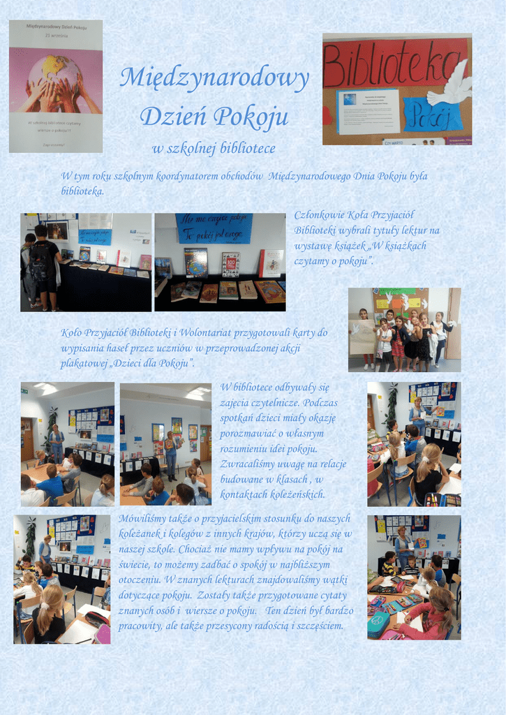 Międzynarodowy Dzień Pokoju w szkolnej bibliotece W tym roku szkolnym koordynatorem obchodów Międzynarodowego Dnia Pokoju była biblioteka. Członkowie Koła Przyjaciół Biblioteki wybrali tytuły lektur na wystawę książek „W książkach czytamy o pokoju”. Koło Przyjaciół Biblioteki i Wolontariat przygotowali karty do wypisania haseł przez uczniów w przeprowadzonej akcji plakatowej „Dzieci dla Pokoju”. W bibliotece odbywały się zajęcia czytelnicze. Podczas spotkań dzieci miały okazję porozmawiać o własnym rozumieniu idei pokoju. Zwracaliśmy uwagę na relacje budowane w klasach , w kontaktach koleżeńskich. Mówiliśmy także o przyjacielskim stosunku do naszych koleżanek i kolegów z innych krajów, którzy uczą się w naszej szkole. Chociaż nie mamy wpływu na pokój na świecie, to możemy zadbać o spokój w najbliższym otoczeniu. W znanych lekturach znajdowaliśmy wątki dotyczące pokoju. Zostały także przygotowane cytaty znanych osób i wiersze o pokoju. Ten dzień był bardzo pracowity, ale także przesycony radością i szczęściem. Po całodniowej akcji tworzenia prac w holu przy bibliotece powstała mała galeria plakatu . Galeria plakatów