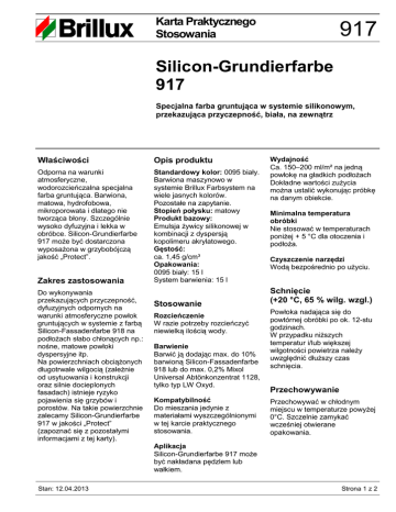 Karta Praktycznego Stosowania 917 Silicon-Grundierfarbe 917 Specjalna farba gruntująca w systemie silikonowym, przekazująca przyczepność, biała, na zewnątrz Właściwości Opis produktu Odporna na warunki atmosferyczne, wodorozcieńczalna specjalna farba gruntująca. Barwiona, matowa, hydrofobowa, mikroporowata i dlatego nie tworząca błony. Szczególnie wysoko dyfuzyjna i lekka w obróbce. Silicon-Grundierfarbe 917 może być dostarczona wyposażona w grzybobójczą jakość „Protect”. Standardowy kolor: 0095 biały. Barwiona maszynowo w systemie Brillux Farbsystem na wiele jasnych kolorów. Pozostałe na zapytanie. Stopień połysku: matowy Produkt bazowy: Emulsja żywicy silikonowej w kombinacji z dyspersją kopolimeru akrylatowego. Gęstość: ca. 1,45 g/cm³ Opakowania: 0095 biały: 15 l System barwienia: 15 l Zakres zastosowania Do wykonywania przekazujących przyczepność, dyfuzyjnych odpornych na warunki atmosferyczne powłok gruntujących w systemie z farbą Silicon-Fassadenfarbe 918 na podłożach słabo chłonących np.: nośne, matowe powłoki dyspersyjne itp. Na powierzchniach obciążonych długotrwale wilgocią (zależnie od usytuowania i konstrukcji oraz silnie docieplonych fasadach) istnieje ryzyko pojawienia się grzybów i porostów. Na takie powierzchnie zalecamy Silicon-Grundierfarbe 917 w jakości „Protect” (zapoznać się z pozostałymi informacjami z tej karty). Stosowanie Rozcieńczenie W razie potrzeby rozcieńczyć niewielką ilością wody. Barwienie Barwić ją dodając max. do 10% barwioną Silicon-Fassadenfarbe 918 lub do max. 0,2% Mixol Universal Abtönkonzentrat 1128, tylko typ LW Oxyd. Kompatybilność Do mieszania jedynie z materiałami wyszczególnionymi w tej karcie praktycznego stosowania. Wydajność Ca. 150–200 ml/m² na jedną powłokę na gładkich podłożach Dokładne wartości zużycia można ustalić wykonując próbkę na danym obiekcie. Minimalna temperatura obróbki Nie stosować w temperaturach poniżej + 5 °C dla otoczenia i podłoża. Czyszczenie narzędzi Wodą bezpośrednio po użyciu. Schnięcie (+20 °C, 65 % wilg. wzgl.) Powłoka nadająca się do powtórnej obróbki po ok. 12-stu godzinach. W przypadku niższych temperatur i/lub większej wilgotności powietrza należy uwzględnić dłuższy czas schnięcia. Przechowywanie Przechowywać w chłodnym miejscu w temperaturze powyżej 0°C. Szczelnie zamykać wcześniej otwierane opakowania. Aplikacja Silicon-Grundierfarbe 917 może być nakładana pędzlem lub wałkiem. Stan: 12.04.2013 Strona 1 z 2 Karta Praktycznego Stosowania 917 Deklaracja Przebieg prac Uwaga Produkt zawiera środki konserwujące. Wstępne przygotowanie podłoża Podłoże musi być zwarte, suche, czyste, nośne , wolne od wykwitów, substancji zmniejszających przyczepność, osadów, elementów korodujących, niezwiązanych powłok rozdzielnych oraz innych warstw osłabiających przyczepność. Istniejące powłoki zbadać pod kątem zgodności, nośności i przyczepności. Powłoki nienośne i niewłaściwe pod względem chemicznym całkowicie usunąć, zutylizować Klasa szkodliwości dla wody WGK 1, zgodnie z klasyfikacją VwVwS. Kod produktu M-GP01. Obowiązują dane zamieszczone w aktualnej karcie charakterystyki produktu. zgodnie z obowiązującymi przepisami Powierzchnie pokryte glonami lub grzybami dokładnie wyczyścić, a następnie zaaplikować na nie uniwersalny środek dezynfekcyjny (UniversalDesinfektionsmittel 542*). (* Bezpiecznie korzystać z biocydów. Przed użyciem przeczytać oznakowanie i informacje o produkcie.). Miejsca naprawiane tynkiem fachowo fluatować. W zależności od potrzeb podłoże zagruntować lub wykonać warstwę pośrednią. Uwzględnić VOB część C, DIN 18363, ustęp 3. Podłoże Warstwa gruntująca Warstwa pośrednia słabo chłonące podłoża na zewnątrz, zdrowe organiczne powłoki np.: farby dyspersyjne itp. Silicon-Grundierfarbe 917 Silicon-Fassadenfarbe 918 lub SiliconSilicon- Fassadenfarbe 918 Streichfüller 910 Wskazówki „Jakość Protect“ Produkty określane mianem „Protect“ są fabrycznie wyposażone w substancje tworzące powłokę chroniącą przed rozwojem grzybów, dlatego też powinny być stosowane jedynie na zewnątrz. Zastosowane środki konserwujące minimalizują lub opóźniają rozwój alg i grzybów. Farby elewacyjne z powłoką ochronną należy nakładać w odpowiedniej grubości. Zalecamy nakładanie przynajmniej dwóch powłok. Ze względów technicznych nie jest możliwe zagwarantowanie trwałej ochrony przed glonami i grzybami. Dalsze dane Uwzględnić dalsze dane z instrukcji technicznych produktów, które mają być zastosowane. Uwaga Niniejsza instrukcja techniczna basuje na intensywnych pracach na rozwojem produktów oraz na wieloletnim doświadczeniu w praktyce. Instrukcja ta została opracowana z uwzględnieniem niemieckich ustaw, norm, przepisów i wytycznych. Jest ona tłumaczeniem wersji niemieckiej. Jej zawartość nie świadczy o żadnym stosunku prawnym. Wykonawca/kupujący nie jest zwolniony ze Warstwa nawierzchniowa sprawdzenia przydatności i możliwości użycia naszych produktów na własną odpowiedzialność dla przewidzianego zastosowania. Poza tym obowiązują nasze Ogólne warunki handlowe. Z chwilą ukazania się nowego wydania niniejszej instrukcji technicznej dotychczasowe dane tracą ważność. Aktualna wersja jest dostępna w internecie. Brillux Polska Sp. z o.o. ul. Santocka 39 71-083 Szczecin Polska tel.: +48 91 88157-00 faks: +48 91 88157-15 www.brillux.pl [email protected] Strona 2 z 2