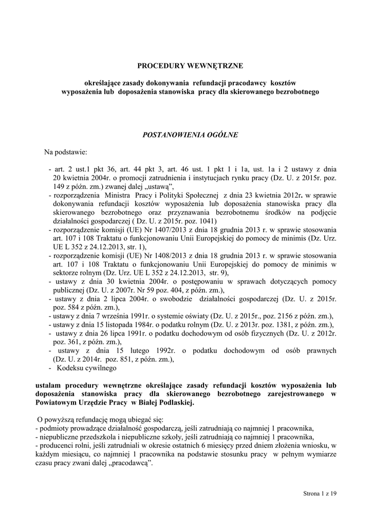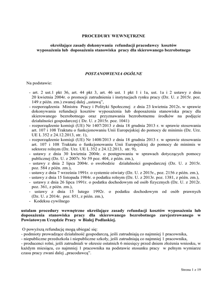 PROCEDURY WEWNĘTRZNE określające zasady dokonywania refundacji pracodawcy kosztów wyposaŜenia lub doposaŜenia stanowiska pracy dla skierowanego bezrobotnego POSTANOWIENIA OGÓLNE Na podstawie: - art. 2 ust.1 pkt 36, art. 44 pkt 3, art. 46 ust. 1 pkt 1 i 1a, ust. 1a i 2 ustawy z dnia 20 kwietnia 2004r. o promocji zatrudnienia i instytucjach rynku pracy (Dz. U. z 2015r. poz. 149 z późn. zm.) zwanej dalej „ustawą”, - rozporządzenia Ministra Pracy i Polityki Społecznej z dnia 23 kwietnia 2012r. w sprawie dokonywania refundacji kosztów wyposaŜenia lub doposaŜenia stanowiska pracy dla skierowanego bezrobotnego oraz przyznawania bezrobotnemu środków na podjęcie działalności gospodarczej ( Dz. U. z 2015r. poz. 1041) - rozporządzenie komisji (UE) Nr 1407/2013 z dnia 18 grudnia 2013 r. w sprawie stosowania art. 107 i 108 Traktatu o funkcjonowaniu Unii Europejskiej do pomocy de minimis (Dz. Urz. UE L 352 z 24.12.2013, str. 1), - rozporządzenie komisji (UE) Nr 1408/2013 z dnia 18 grudnia 2013 r. w sprawie stosowania art. 107 i 108 Traktatu o funkcjonowaniu Unii Europejskiej do pomocy de minimis w sektorze rolnym (Dz. Urz. UE L 352 z 24.12.2013, str. 9), - ustawy z dnia 30 kwietnia 2004r. o postępowaniu w sprawach dotyczących pomocy publicznej (Dz. U. z 2007r. Nr 59 poz. 404, z późn. zm.), - ustawy z dnia 2 lipca 2004r. o swobodzie działalności gospodarczej (Dz. U. z 2015r. poz. 584 z późn. zm.), - ustawy z dnia 7 września 1991r. o systemie oświaty (Dz. U. z 2015r., poz. 2156 z późn. zm.), - ustawy z dnia 15 listopada 1984r. o podatku rolnym (Dz. U. z 2013r. poz. 1381, z późn. zm.), - ustawy z dnia 26 lipca 1991r. o podatku dochodowym od osób fizycznych (Dz. U. z 2012r. poz. 361, z późn. zm.), - ustawy z dnia 15 lutego 1992r. o podatku dochodowym od osób prawnych (Dz. U. z 2014r. poz. 851, z późn. zm.), - Kodeksu cywilnego ustalam procedury wewnętrzne określające zasady refundacji kosztów wyposaŜenia lub doposaŜenia stanowiska pracy dla skierowanego bezrobotnego zarejestrowanego w Powiatowym Urzędzie Pracy w Białej Podlaskiej. O powyŜszą refundację mogą ubiegać się: - podmioty prowadzące działalność gospodarczą, jeśli zatrudniają co najmniej 1 pracownika, - niepubliczne przedszkola i niepubliczne szkoły, jeśli zatrudniają co najmniej 1 pracownika, - producenci rolni, jeśli zatrudniali w okresie ostatnich 6 miesięcy przed dniem złoŜenia wniosku, w kaŜdym miesiącu, co najmniej 1 pracownika na podstawie stosunku pracy w pełnym wymiarze czasu pracy zwani dalej „pracodawcą”. Strona 1 z 19 §1 1. Starosta (z upowaŜnienia którego działa Dyrektor Powiatowego Urzędu Pracy w Białej Podlaskiej) moŜe refundować pracodawcy koszty wyposaŜenia lub doposaŜenia stanowiska pracy dla skierowanego bezrobotnego na podstawie umowy o refundację zawartej z zainteresowanym pracodawcą, w ramach przeznaczonych na ten cel, posiadanych środków finansowych, o ile wyposaŜone lub doposaŜone stanowisko pracy będzie zlokalizowane na terenie Powiatu Bialskiego lub miasta Biała Podlaska. Preferowane będą wnioski o przyznanie pracodawcy refundacji kosztów wyposaŜenia lub doposaŜenia w szczególności w przypadku, gdy pracodawca dobrowolnie deklaruje zamiar utrzymania stanowiska pracy co najmniej 28 miesięcy. 2. Kwota przyznanych środków nie moŜe przekraczać 6–krotnej wysokości przeciętnego wynagrodzenia ogłoszonego przez Prezesa GUS w Dzienniku Urzędowym RP „Monitor Polski” na podstawie art. 20 pkt 2 ustawy z dnia 17 grudnia 1998r. o emeryturach i rentach z Funduszu Ubezpieczeń Społecznych / Dz. U. z 2015r. poz. 748 z późn. zm./, obowiązującego na dzień zawarcia umowy. 3. Na nowo utworzone stanowisko pracy w ramach refundacji kosztów wyposaŜenia lub doposaŜenia stanowiska pracy moŜe zostać skierowany bezrobotny objęty II profilem pomocy. 4. W 2016 roku kwota na refundację kosztów wyposaŜenia lub doposaŜenia stanowiska pracy będzie wynosić do 23.000,00 zł brutto. 5. UŜywane w niniejszych procedurach wewnętrznych w róŜnej formie pojęcie „wyposaŜenie”, „doposaŜenie”, „podmiot”, „przedszkole lub szkoła”, „producent rolny” oznacza: 1) WyposaŜenie - to utworzenie nowego stanowiska pracy u pracodawcy poprzez zakup niezbędnych do wykonywania pracy na danym stanowisku urządzeń, maszyn i narzędzi. 2) DoposaŜenie - to zmiany na stanowisku istniejącym u pracodawcy w szczególności gdy zmienia się zakres zadań, sposób wykonywania pracy /zmiany technologiczne/ poprzez zakup niezbędnych urządzeń, maszyn i narzędzi, które uzupełnią brakujące wyposaŜenie na tym stanowisku. 3) Podmiot - to podmiot prowadzący działalność gospodarczą w rozumieniu ustawy z dnia 2 lipca 2004r. o swobodzie działalności gospodarczej. 4) Przedszkole lub szkoła – to niepubliczne przedszkole lub niepubliczna szkoła, o których mowa w ustawie z dnia 7 września 1991r. o systemie oświaty. 5) Producent rolny - to osoba fizyczna, osoba prawna lub jednostka organizacyjna nieposiadająca osobowości prawnej, zamieszkująca lub mająca siedzibę na terytorium Rzeczypospolitej Polskiej, będąca posiadaczem gospodarstwa rolnego w rozumieniu ustawy z dnia 15 listopada 1984r. o podatku rolnym lub prowadząca dział specjalny produkcji rolnej, o którym mowa w ustawie z dnia 26 lipca 1991r. o podatku dochodowym od osób fizycznych lub w ustawie z dnia 15 lutego 1992r. o podatku dochodowym od osób prawnych zatrudniająca w okresie ostatnich 6 miesięcy przed dniem złoŜenia wniosku, w kaŜdym miesiącu, co najmniej 1 pracownika na podstawie stosunku pracy w pełnym wymiarze czasu pracy. Strona 2 z 19 - Gospodarstwo rolne to obszar gruntów sklasyfikowanych w ewidencji gruntów i budynków jako uŜytki rolne lub jako grunty zadrzewione i zakrzewione na uŜytkach rolnych, z wyjątkiem gruntów zajętych na prowadzenie działalności gospodarczej innej niŜ działalność rolnicza, o łącznej powi
