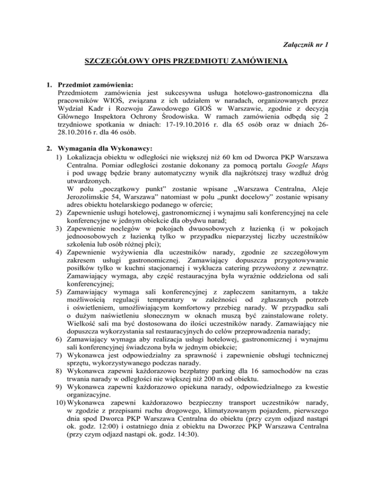 Załącznik nr 1 SZCZEGÓŁOWY OPIS PRZEDMIOTU ZAMÓWIENIA 1. Przedmiot zamówienia: Przedmiotem zamówienia jest sukcesywna usługa hotelowo-gastronomiczna dla pracowników WIOŚ, związana z ich udziałem w naradach, organizowanych przez Wydział Kadr i Rozwoju Zawodowego GIOŚ w Warszawie, zgodnie z decyzją Głównego Inspektora Ochrony Środowiska. W ramach zamówienia odbędą się 2 trzydniowe spotkania w dniach: 17-19.10.2016 r. dla 65 osób oraz w dniach 2628.10.2016 r. dla 46 osób. 2. Wymagania dla Wykonawcy: 1) Lokalizacja obiektu w odległości nie większej niż 60 km od Dworca PKP Warszawa Centralna. Pomiar odległości zostanie dokonany za pomocą portalu Google Maps i pod uwagę będzie brany automatyczny wynik dla najkrótszej trasy wzdłuż dróg utwardzonych. W polu „początkowy punkt” zostanie wpisane „Warszawa Centralna, Aleje Jerozolimskie 54, Warszawa” natomiast w polu „punkt docelowy” zostanie wpisany adres obiektu hotelarskiego podanego w ofercie; 2) Zapewnienie usługi hotelowej, gastronomicznej i wynajmu sali konferencyjnej na cele konferencyjne w jednym obiekcie dla obydwu narad; 3) Zapewnienie noclegów w pokojach dwuosobowych z łazienką (i w pokojach jednoosobowych z łazienką tylko w przypadku nieparzystej liczby uczestników szkolenia lub osób różnej płci); 4) Zapewnienie wyżywienia dla uczestników narady, zgodnie ze szczegółowym zakresem usługi gastronomicznej. Zamawiający dopuszcza przygotowywanie posiłków tylko w kuchni stacjonarnej i wyklucza catering przywożony z zewnątrz. Zamawiający wymaga, aby część restauracyjna była wyraźnie oddzielona od sali konferencyjnej; 5) Zamawiający wymaga sali konferencyjnej z zapleczem sanitarnym, a także możliwością regulacji temperatury w zależności od zgłaszanych potrzeb i oświetleniem, umożliwiającym komfortowy przebieg narady. W przypadku sali o dużym naświetleniu słonecznym w oknach muszą być zainstalowane rolety. Wielkość sali ma być dostosowana do ilości uczestników narady. Zamawiający nie dopuszcza wykorzystania sal restauracyjnych do celów przeprowadzenia narady; 6) Zamawiający wymaga aby realizacja usługi hotelowej, gastronomicznej i wynajmu sali konferencyjnej świadczona była w jednym obiekcie; 7) Wykonawca jest odpowiedzialny za sprawność i zapewnienie obsługi technicznej sprzętu, wykorzystywanego podczas narady. 8) Wykonawca zapewni każdorazowo bezpłatny parking dla 16 samochodów na czas trwania narady w odległości nie większej niż 200 m od obiektu. 9) Wykonawca zapewni każdorazowo opiekuna narady, odpowiedzialnego za kwestie organizacyjne. 10) Wykonawca zapewni każdorazowo bezpieczny transport uczestników narady, w zgodzie z przepisami ruchu drogowego, klimatyzowanym pojazdem, pierwszego dnia spod Dworca PKP Warszawa Centralna do obiektu (przy czym odjazd nastąpi ok. godz. 12:00) i ostatniego dnia z obiektu na Dworzec PKP Warszawa Centralna (przy czym odjazd nastąpi ok. godz. 14:30). 11) Rodzaj czynności niezbędnych do realizacji zamówienia, których dotyczą wymagania zatrudnienia na podstawie umowy o pracę przez wykonawcę lub podwykonawcę osób wykonujących czynności w trakcie realizacji zamówienia - zapewnienie wyżywienia podczas narad. 3. Zamawiający wymaga aby sala konferencyjna wyposażona była w: 1) Krzesła i stoliki dla wszystkich uczestników. Zamawiający dopuszcza ustawienie sali typu szkolnego pojedynczego i podwójnego oraz w podkowę, ustawienie krzeseł po stronie zewnętrznej podkowy; 2) Rzutnik multimedialny z wejściami HDMI, VGA i kompatybilny ekran projekcyjny; 3) System nagłośnienia sali w postaci dwóch mikrofonów bezprzewodowych, podłączonych do wzmacniacza, mającego wyjścia na odpowiednie do parametrów sali głośniki; 4) Flipchart z papierem i pisakami; 5) Możliwość podłączenia laptopa osoby prowadzącej naradę do gniazda 230V/50Hz przewodem o długości 2 m i korzystania z podłączonego laptopa przy stoliku; 6) Stały bezpłatny dostęp do Internetu; 7) Woda mineralna gazowana i niegazowana w ilości odpowiadającej wymaganiom uczestników, dostępna na sali przez cały czas trwania narad. 4. Szczegółowy zakres usługi hotelowej i najmu sali konferencyjnej obejmuje: Narada 1, w dniach 17-19.10.2016 r. 2 noclegi dla 65 osób Sala konferencyjna dla 65 osób – I dzień w godz. 14:00-19:00, II dzień w godz. 09:0019:00, III dzień w godz. 09:00-13:00 Narada 2, w dniach 26-28.10.2016 r. 2 noclegi dla 46 osób Sala konferencyjna dla 46 osób – I dzień w godz. 14:00-19:00, II dzień w godz. 09:0019:00, III dzień w godz. 09:00-13:00 5. Szczegółowy zakres usługi gastronomicznej obejmuje: I dzień Od godz. 12:00 – Rejestracja i zakwaterowanie uczestników 13:00-14:00 – Obiad (zupa, główne danie, kompot/sok/woda, deser) Zamawiający przewiduje opcję dania wegetariańskiego 14:00-19:00 – Narada 16:00-16:15 – Przerwa kawowa (gorąca kawa i herbata, sok, ciasteczka, cukier, mleko do kawy, cytryna) 19:00 – Kolacja (zimna płyta oraz jedno danie na ciepło i napoje bezalkoholowe) II dzień 07:30-09:00 – Śniadanie 09:00-13:00 – Narada 10:45-11:00 – Przerwa kawowa (gorąca kawa i herbata, sok, ciasteczka, cukier, mleko do kawy, cytryna) 13:00-14:00 – Obiad (zupa, główne danie, kompot/sok/woda, deser) Zamawiający przewiduje opcję dania wegetariańskiego 14:00-19:00 Narada 2 16:00-16:15 – Przerwa kawowa (gorąca kawa i herbata, sok, ciasteczka, cukier, mleko do kawy, cytryna) 19:00 – Kolacja (zimna płyta oraz jedno danie na ciepło i napoje bezalkoholowe) III dzień 07:30-09:00 – Śniadanie 09:00-13:00 – Narada 10:45-11:00 – Przerwa kawowa (gorąca kawa i herbata, sok, ciasteczka, cukier, mleko do kawy, cytryna) 13:00-14:00 – Obiad (zupa, główne danie, kompot/sok/woda, deser) Zamawiający przewiduje opcję dania wegetariańskiego 3