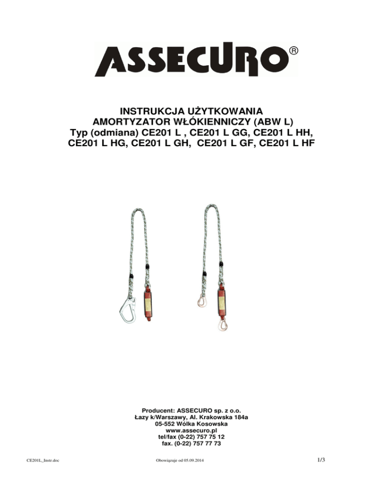 INSTRUKCJA UŻYTKOWANIA AMORTYZATOR WŁÓKIENNICZY (ABW L) Typ (odmiana) CE201 L , CE201 L GG, CE201 L HH, CE201 L HG, CE201 L GH, CE201 L GF, CE201 L HF Producent: ASSECURO sp. z o.o. Łazy k/Warszawy, Al. Krakowska 184a 05-552 Wólka Kosowska www.assecuro.pl tel/fax (0-22) 757 75 12 fax. (0-22) 757 77 73 CE201L_Instr.doc Obowiązuje od 05.09.2014 1/3 ZASTOSOWANIE Amortyzator włókienniczy jest elementem systemu powstrzymywania spadania zgodnym z PN-EN 355:2005, należącym do systemów ochrony osobistej. Stanowi element pochłaniający energię i gwarantuje bezpieczne powstrzymywanie spadania z wysokości w zakresie opisanym poniżej. Amortyzator włókienniczy przeznaczony jest do stosowania z indywidualnym sprzętem chroniącym przed upadkiem z wysokości. Jest niezbędnym składnikiem systemu zabezpieczającego przed upadkiem z wysokości składającego się z: szelek bezpieczeństwa, amortyzatora, elementów łączących i kotwiących. Amortyzator włókienniczy w pełni zabezpiecza przed nadmiernymi przeciążeniami organizmu człowieka przy spadaniu i redukuje obciążenie do wartości <6,0 kN. KONSTRUKCJA Amortyzator wykonany jest ze specjalnie tkanej dwuwarstwowej taśmy i taśmy zewnętrznej zakończonej obustronnie osłoniętymi pętlami mocującymi. Połączone w procesie tkackim obie warstwy taśmy amortyzującej stanowią element amortyzujący - pochłaniający energię upadku przez rozrywanie wątku łączącego obie taśmy. Amortyzator złożony jest w pakiet osłonięty folią termokurczliwą, pod którą umieszczone jest oznakowanie amortyzatora (oznaczenie producenta, nazwa i typ amortyzatora , numer normy, piktogram nakazujący zapoznanie się z niniejszą instrukcją, numer seryjny, rok produkcji i znak kontroli jakości, znak zgodności). Do jednej pętli w sposób trwały przyłączona jest linka bezpieczeństwa, zgodną z EN 354: 2002. Amortyzatory włókiennicze produkowane są w niżej wymienionych wersjach: CE201 L , CE201 L GG, CE201 L HH, CE201 L HG, CE201 L GH, CE201 L GF, CE201 L HF, gdzie: G – zatrzśnik AJ 510, H – zatrzaśnik AJ 560, F – zatrzaśnik AJ 590, AJ591, AJ592 UWAGA: Nie wolno dokonywać samodzielnie żadnych zmian lub poprawek w amortyzatorze. Wszelkie uwagi dotyczące konstrukcji należy zgłaszać do producenta. SPOSÓB UŻYTKOWANIA Przed pierwszym wydaniem amortyzatora należy: * Sprawdzić zgodności danych znajdujących się na Karcie Użytkowania(w kartach użytkowania ostatnie siedem cyfr oznacza nr seryjny) i metce * Przeprowadzić dokładne oględziny taśmy, szwów, liny i elementy metalowe. Amortyzator, w którym stwierdzono niezgodność danych lub uszkodzenie nie może być dopuszczony do użytkowania i powinien być przekazany do oceny dostawcy. Wszystkie naprawy mogą być przeprowadzane jedynie przez ASSECURO. Potwierdzeniem przeprowadzenia kontroli jest wpis w Karcie Użytkowania. Uwaga: Kartę Użytkowania należy przechowywać przez cały okres użytkowania amortyzatora w kartotece SOO. Dopuszcza się użytkowanie sprzętu jedynie przez osoby przeszkolone lub pod bezpośrednim nadzorem takich osób. Przed przystąpieniem do pracy użytkownik powinien ocenić, czy istnieje możliwość przeprowadzenia, w razie wypadku, skutecznej akcji ratunkowej. Użytkownik powinien zapoznać się również z zasadami prowadzenia akcji ratunkowej (ewakuacyjnej). Sprzęt zabezpieczający przed upadkiem z wysokości może być stosowany jedynie przez osoby nie posiadające przeciwwskazań co do pracy na wysokości. Amortyzatory z linką jest składnikiem systemu powstrzymywania spadania. Wraz z szelkami bezpieczeństwa stanowi kompletny, lekki i prosty w użyciu system ochrony osobistej. Amortyzator należy przypiąć bezpośrednio do przedniej (lub tylnej) klamry zaczepowej szelek. Należy pamiętać, że skręcanie liny w odwrotnym kierunku do skrętu żył liny, może spowodować powstanie trwałego rozkręcenia na odcinku liny (powstanie tzw. koszyczka). Sprzyja temu : wieszanie się na linie połączone z jej odkręcaniem, przeciąganie liny przez zatrzaśnik, podciąganie na linie ładunku itp. Należy unikać takich czynności. Amortyzatorów włókienniczych nie należy używać w przypadku: • Wytrzymałości punktów mocowania mniejszej niż 10 kN, 0 • Narażenia na działanie ognia lub rozgrzanych powyżej 80 C przedmiotów, • W środowisku zagrożonym wybuchem. ZALECENIA, NAKAZY I ZAKAZY DOTYCZĄCE UŻYTKOWANIA Włókiennicze amortyzatory bezpieczeństwa są użytkowane jako podzespoły składowe zespołów łącząco amortyzujących w systemach powstrzymywania spadania. Amortyzator CE201L łączony może być, z innym sprzętem np. szelkami bezpieczeństwa (PN-EN 361) i punktem kotwiczącym (PN-EN795), zatrzaśnikami (PN-EN 362) dopuszczonymi do stosowania w systemach powstrzymywania spadania. Przed użyciem należy się zapoznać z instrukcją użytkowania. Amortyzator nie może być używane inaczej niż zgodnie z przeznaczeniem. Maksymalna długość amortyzatora z linką bezpieczeństwa i zakończeniami nie powinna przekroczyć 2 m. Punkt zamocowania podzespołu łącząco amortyzującego należy zlokalizować możliwie bezpośrednio nad miejscem pracy użytkownika. Łączenie poszczególnych składników systemu powstrzymywania spadania powinno być zgodne z zaleceniami w odpowiednich instrukcjach użytkowania. Minimalna wytrzymałość punktu kotwiczenia powinna być zgodna z wartością CE201L_Instr.doc Obowiązuje od 05.09.2014 2/3 podaną w odpowiedniej instrukcji użytkowania podsystemu lub składnika. Każdorazowo, przed przystąpieniem do pracy, użytkownik powinien upewnić się, czy jest zachowana odpowiednia wielkość wolnej przestrzeni poniżej użytkownika, zgodna z wartością podaną w odpowiedniej instrukcji użytkowania podsystemu lub składnika. Przy dodatkowym zastosowaniu elementu łączącego (całkowita długość nie może przekroczyć 2 m wraz z zakończeniami) odległość ta zwiększa s