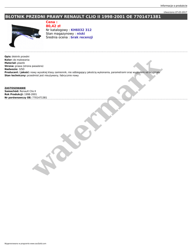 Informacje o produkcie Utworzono 07-03-2017 BŁOTNIK PRZEDNI PRAWY RENAULT CLIO II 1998-2001 OE 7701471381 Cena : 80,42 zł Nr katalogowy : KH6032 312 Stan magazynowy : niski Średnia ocena : brak recenzji w at ZASTOSOWANIE Samochód: Renault Clio II Rok Produkcji: 1998-2001 Nr porównawczy OE: 7701471381 er m ar k Opis: błotnik przedni Kolor: do malowania Materiał: plastik Strona: prawa (strona pasażera) Nadwozie: 3/5D Producent / jakość: nowy wysokiej klasy zamiennik, nie odbiegający jakością wykonania, parametrami oraz wyglądem od oryginału Stan techniczny: przedmiot jest nieużywany, fabrycznie nowy Wygenerowano w programie www.oscGold.com
