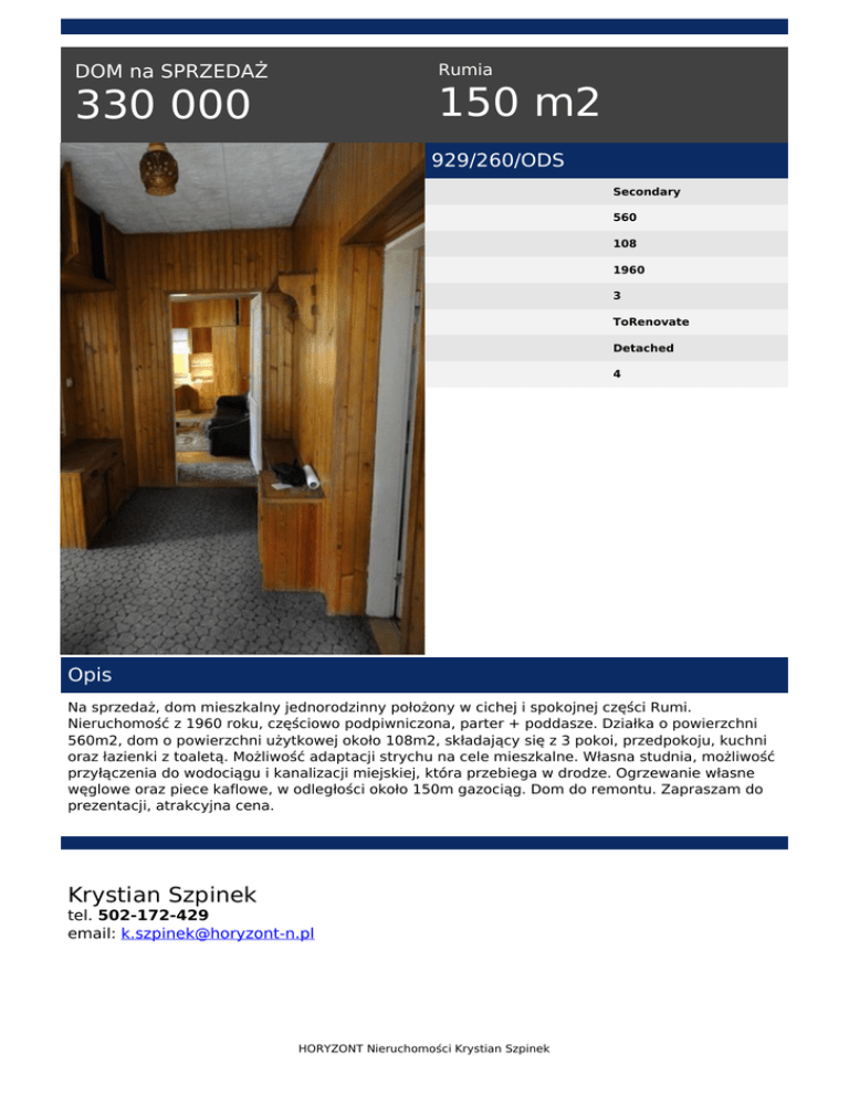 Rumia DOM na SPRZEDAŻ 150 m2 330 000 929/260/ODS Secondary 560 108 1960 3 ToRenovate Detached 4 Opis Na sprzedaż, dom mieszkalny jednorodzinny położony w cichej i spokojnej części Rumi. Nieruchomość z 1960 roku, częściowo podpiwniczona, parter + poddasze. Działka o powierzchni 560m2, dom o powierzchni użytkowej około 108m2, składający się z 3 pokoi, przedpokoju, kuchni oraz łazienki z toaletą. Możliwość adaptacji strychu na cele mieszkalne. Własna studnia, możliwość przyłączenia do wodociągu i kanalizacji miejskiej, która przebiega w drodze. Ogrzewanie własne węglowe oraz piece kaflowe, w odległości około 150m gazociąg. Dom do remontu. Zapraszam do prezentacji, atrakcyjna cena. Krystian Szpinek tel. 502-172-429 email: [email protected] HORYZONT Nieruchomości Krystian Szpinek Powered by TCPDF (www.tcpdf.org)