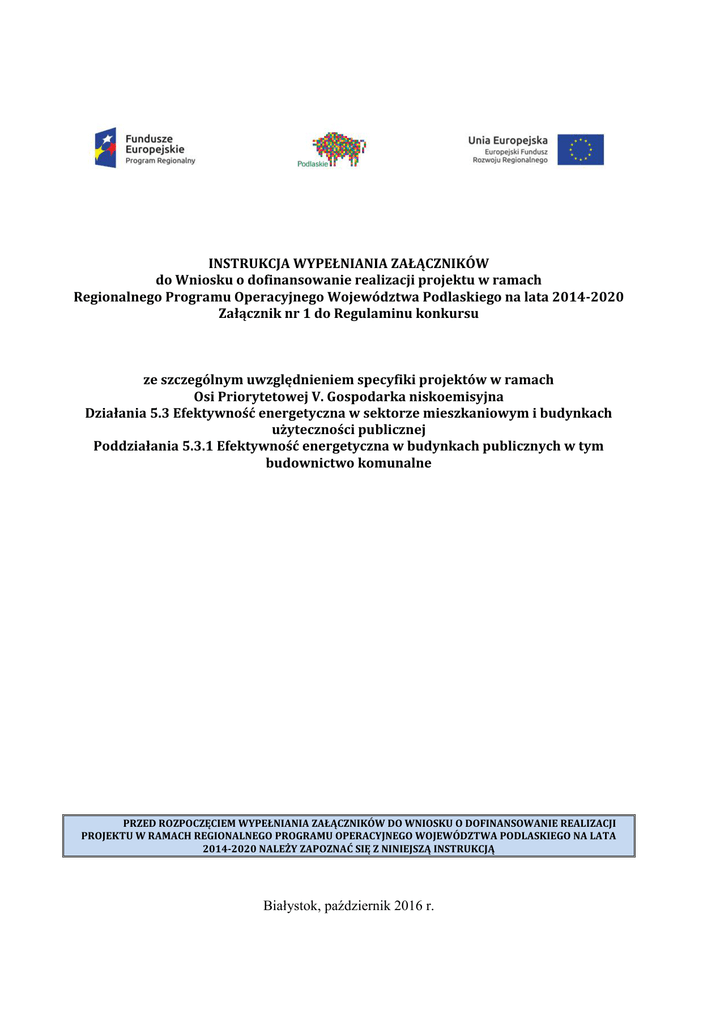 INSTRUKCJA WYPEŁNIANIA ZAŁĄCZNIKÓW do Wniosku o dofinansowanie realizacji projektu w ramach Regionalnego Programu Operacyjnego Województwa Podlaskiego na lata 2014-2020 Załącznik nr 1 do Regulaminu konkursu ze szczególnym uwzględnieniem specyfiki projektów w ramach Osi Priorytetowej V. Gospodarka niskoemisyjna Działania 5.3 Efektywność energetyczna w sektorze mieszkaniowym i budynkach użyteczności publicznej Poddziałania 5.3.1 Efektywność energetyczna w budynkach publicznych w tym budownictwo komunalne PRZED ROZPOCZĘCIEM WYPEŁNIANIA ZAŁĄCZNIKÓW DO WNIOSKU O DOFINANSOWANIE REALIZACJI PROJEKTU W RAMACH REGIONALNEGO PROGRAMU OPERACYJNEGO WOJEWÓDZTWA PODLASKIEGO NA LATA 2014-2020 NALEŻY ZAPOZNAĆ SIĘ Z NINIEJSZĄ INSTRUKCJĄ Białystok, październik 2016 r. Spis załączników: 1. Studium Wykonalności ...........................................................................................................................3 2. Dokumenty związane z przeprowadzeniem postępowania oceny oddziaływania na środowisko ..................................................................................................................................................3 3. Kopia pozwolenia na budowę lub zgłoszenie budowy/dokumenty dotyczące zagospodarowania przestrzennego ...................................................................................................6 4. Wyciąg z dokumentacji technicznej ...................................................................................................7 5. Potwierdzenie prawa do dysponowania gruntem lub obiektami - oświadczenie o prawie dysponowania nieruchomością na cele realizacji projektu, umowa najmu, dzierżawy itp..............................................................................................................................................7 6. Oświadczenie Beneficjenta o braku możliwości odzyskania podatku VAT ..........................8 7. Pozostałe załączniki. ...............................................................................................................................9 2 Postanowienia ogólne Załączniki do wniosku o dofinansowanie realizacji projektu ze środków Europejskiego Funduszu Rozwoju Regionalnego (EFRR) w ramach Regionalnego Programu Operacyjnego na lata 2014-2020 (RPOWP 2014-2020) służą do uzupełnienia oraz uwiarygodnienia danych opisanych we wniosku o dofinansowanie projektu. Załączniki stanowią integralną część wniosku o dofinansowanie projektu ze środków EFRR w ramach RPOWP 2014-2020. Sposób złożenia oraz wymagany zakres określa Regulamin oceny i wyboru projektów w ramach Regionalnego Programu Operacyjnego Województwa Podlaskiego na lata 2014-2020. Lista załączników obowiązkowych może zostać rozszerzona w zależności od specyfiki działania, występującej pomocy publicznej, dodatkowych uregulowań prawnych i wytycznych. IZ RPOWP zastrzega sobie prawo do wezwania Wnioskodawcy do dostarczenia innych dokumentów niewymienionych w niniejszej Instrukcji pod warunkiem, że ich uzupełnienie nie będzie prowadziło do istotnej modyfikacji wniosku (art. 43 ust. 2 Ustawy z dnia 11 lipca 2014 r. o zasadach realizacji programów w zakresie polityki spójności finansowanych w perspektywie finansowej 2014-2020) oraz będą niezbędne do oceny spełnienia kryteriów wyboru projektów (art. 37 ust. 5 Ustawy z dnia 11 lipca 2014 r. o zasadach realizacji programów w zakresie polityki spójności finansowych w perspektywie finansowej 2014-2020). Dołączone decyzje administracyjne powinny być ważne na dzień składania wniosku o dofinansowanie oraz faktycznego rozpoczęcia realizacji projektu (w szczególności dotyczy to projektów obejmujących roboty budowlane), a także powinny być opatrzone adnotacją organu wydającego o ich ostateczności/prawomocności. Poniżej przedstawiono wykaz załączników obligatoryjnych oraz fakultatywnych zgodnie z numeracją w Pkt VIII.1 Lista załączników wniosku o dofinansowanie. 1. Studium Wykonalności W ramach niniejszego konkursu, Studium Wykonalności nie jest dokumentem obligatoryjnym, bowiem kluczową rolę pełni audyt ex ante, który powinien w sposób kompleksowy przedstawiać koncepcję realizacji Projektu, w tym wariantowość inwestycji, zaproponowane rozwiązania, zakres rzeczowy przedsięwzięcia oraz budżet. W związku z powyższym, opracowanie Studium Wykonalności nie stanowi kosztu kwalifikowalnego. Dołączenie do dokumentacji aplikacyjnej Studium Wykonalności jest możliwe, gdy Wnioskodawca posiada już taki dokument i zawiera on minimalny zakres informacji, o którym mowa przy Załączniku pn. Dokument potwierdzający zasadność realizacji projektu. Jednocześnie należy pamiętać, że w przypadku dysponowania Studium Wykonalności w momencie ogłaszania niniejszego konkursu, a sporządzonego wcześniej (np. na potrzeby aplikowania w ramach poprzedniego naboru), Wnioskodawca zobowiązany jest do zweryfikowania aktualności zapisów, w tym w zakresie rzeczowym, jak i finansowym. Aktualizacja dokumentu nie stanowi kosztu kwalifikowalnego. 2. Dokumenty związane z przeprowadzeniem postępowania oceny oddziaływania na środowisko 3 Podstawą przygotowania dokumentów związanych z oceną oddziaływania na środowisko oraz na obszar Natura 2000, gospodarką wodną, zmianami klimatu są: Rozporządzenie delegowane Komisji (UE) nr 480/2014 z dnia 3 marca 2014 r. uzupełniające rozporządzenie Parlamentu Europejskiego i Rady (UE) nr 1303/2013 ustanawiające wspólne przepisy dotyczące Europejskiego Funduszu Rozwoju Regionalnego, Europejskiego Funduszu Społecznego, Funduszu Spójności, Europejskiego Funduszu Rolnego na rzecz Rozwoju Obszarów Wiejskich oraz Europejskiego Funduszu Morskiego i Rybackiego oraz ustanawiające przepisy ogólne dotyczące Europejskiego Funduszu Rozwoju Regionalnego, Europejskiego Funduszu Społecznego, Funduszu Spójności i Europejskiego Funduszu Morsk