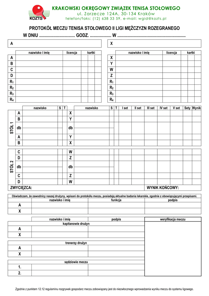 KRAKOWSKI OKRĘGOWY ZWIĄZEK TENISA STOŁOWEGO ul. Zarzecze 124A, 30-134 Kraków t el ef on /f a k s : (1 2 ) 63 8 3 3 59 , e- m a i l : w gi d @k ozt s .p l PROTOKÓŁ MECZU TENISA STOŁOWEGO II LIGI MĘŻCZYZN ROZEGRANEGO W DNIU ................................ GODZ. ................... W ............................................................. A X nazwisko i imię licencja kartki A B C D R1 R2 R3 R4 STÓŁ 1 licencja kartki X Y W Z R1 R2 R3 R4 nazwisko STÓŁ 2 nazwisko i imię S T nazwisko A B X Y db db A B Y X C D W Z db db C D ZWYCIĘZCA: S T I set II set III set IV set V set Sety Wynik Z W WYNIK KOŃCOWY: Oświadczam, że zawodnicy naszej drużyny, wpisani do protokółu meczu, posiadają aktualne badania lekarskie, zgodnie z obowiązującymi przepisami. nazwisko i imię funkcja podpis nazwisko i imię kapitanowie drużyn podpis weryfikacja meczu A X A X trenerzy drużyn A X sędziowie meczu 1. 2. Zgodnie z punktem 12.12 regulaminu rozgrywek gospodarz meczu zobowiązany jest do niezwłocznego wprowadzenia wyniku meczu do systemu ligowego. KRAKOWSKI OKRĘGOWY ZWIĄZEK TENISA STOŁOWEGO ul. Zarzecze 124A, 30-134 Kraków t el ef on /f a k s : (1 2 ) 63 8 3 3 59 , e- m a i l : w gi d @k ozt s .p l osoby odpowiedzialne za bezpieczeństwo nazwisko i imię podpis 1. 2. publiczność media organizacja meczu warunki techniczne pole gry prawidłowe nieprawidłowe podłoga prawidłowe nieprawidłowe oświetlenie prawidłowe nieprawidłowe wrażenie estetyczne prawidłowe nieprawidłowe nagłośnienie tak nie spiker tak nie wydzielone miejsca tak nie prasa tak nie radio tak nie telewizja tak nie bilety tak nie miejsca siedzące tak nie uwagi liczba widzów Inne uwagi (wypełnia: I – kapitan gości, II – kapitan gospodarzy, III – sędzia główny) I II III Zgodnie z punktem 12.12 regulaminu rozgrywek gospodarz meczu zobowiązany jest do niezwłocznego wprowadzenia wyniku meczu do systemu ligowego.