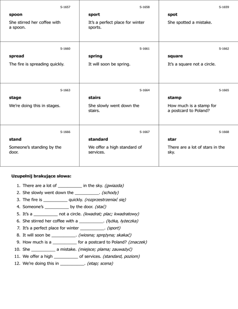 S-1657 S-1658 S-1659 spoon sport spot She stirred her coffee with a spoon. It’s a perfect place for winter sports. She spotted a mistake. S-1660 S-1661 S-1662 spread spring square The fire is spreading quickly. It will soon be spring. It’s a square not a circle. S-1663 S-1664 S-1665 stage stairs stamp We’re doing this in stages. She slowly went down the stairs. How much is a stamp for a postcard to Poland? S-1666 S-1667 S-1668 stand standard star Someone’s standing by the door. We offer a high standard of services. There are a lot of stars in the sky. Uzupełnij brakujące słowa: 1. There are a lot of __________ in the sky. (gwiazda) 2. She slowly went down the __________. (schody) 3. The fire is __________ quickly. (rozprzestrzeniać się) 4. Someone’s __________ by the door. (stać) 5. It’s a __________ not a circle. (kwadrat; plac; kwadratowy) 6. She stirred her coffee with a __________. (łyżka, łyżeczka) 7. It’s a perfect place for winter __________. (sport) 8. It will soon be __________. (wiosna; sprężyna; skakać) 9. How much is a __________ for a postcard to Poland? (znaczek) 10. She __________ a mistake. (miejsce; plama; zauważyć) 11. We offer a high __________ of services. (standard, poziom) 12. We’re doing this in __________. (etap; scena) S-1659 S-1658 S-1657 miejsce; plama; zauważyć sport łyżka, łyżeczka Zauważyła błąd. To doskonałe miejsce do uprawiania sportów zimowych. Zamieszała kawę łyżeczką. www.isel.edu.pl www.isel.edu.pl www.isel.edu.pl S-1662 S-1661 S-1660 kwadrat; plac; kwadratowy wiosna; sprężyna; skakać rozprzestrzeniać się To jest kwadrat, nie okrąg/koło. Wkrótce będzie wiosna. Ogień rozprzestrzenia się szybko. www.isel.edu.pl www.isel.edu.pl www.isel.edu.pl S-1665 S-1664 S-1663 znaczek schody etap; scena Ile kosztuje znaczek na kartkę/widokówkę do Polski? Powoli zeszła po schodach. Robimy to etapami. www.isel.edu.pl www.isel.edu.pl www.isel.edu.pl S-1668 S-1667 S-1666 gwiazda standard, poziom stać Na niebie jest wiele gwiazd. Oferujemy wysoki poziom usług. Ktoś stoi przy drzwiach. www.isel.edu.pl Odpowiedzi: 1. stars 2. stairs 3. spreading 4. standing 5. square 6. spoon 7. sports 8. spring 9. stamp 10. spotted 11. standard 12. stages www.isel.edu.pl www.isel.edu.pl