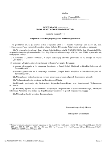 Projekt z dnia 17 marca 2014 r. Zatwierdzony przez ......................... UCHWAŁA NR .................... RADY MIASTA GOLUBIA-DOBRZYNIA z dnia 12 marca 2014 r. w sprawie aktualizacji opisu granic obwodów głosowania. Na podstawie art. 12 § 2 ustawy z dnia 5 stycznia 2011 r. – Kodeks wyborczy (Dz. U. Nr 21, poz. 112 z późn. zm.1)), na wniosek Burmistrza Miasta Golubia-Dobrzynia, Rada Miasta uchwala, co następuje: § 1. W załączniku do uchwały Rady Miasta Golubia-Dobrzynia Nr XXX/154/2012 z dnia 13 grudnia 2012r. w sprawie obwodów głosowania (Dz. Urz. Woj. Kujawsko-Pomorskiego z 2012r., poz. 3711), wprowadza się następujące zmiany: 1) w kolumnie 2 „Granice obwodu”, w części dotyczącej obwodu głosowania nr 6, dodaje się wyraz „Źródlana”; 2) kolumna 3 „ Siedziba obwodowej komisji wyborczej”, w części dotyczącej: a) obwodu głosowania nr 5, otrzymuje brzmienie: „ Zespół Szkół Miejskich w Golubiu-Dobrzyniu ul. Żeromskiego 11”, b) obwodu głosowania nr 6, otrzymuje brzmienie „Zespół Szkół Miejskich w Golubiu-Dobrzyniu ul. Żeromskiego 11”, § 2. Uaktualniony podział gminy na obwody głosowania zawiera załącznik do niniejszej uchwały. § 3. Wykonanie uchwały powierza się Burmistrzowi Miasta. § 4. Uchwałę przekazuje się Wojewodzie Kujawsko-Pomorskiemu oraz Komisarzowi Wyborczemu w Toruniu. § 3. Uchwałę ogłasza się w Dzienniku Urzędowym Województwa Kujawsko-Pomorskiego, Biuletynie Informacji Publicznej oraz podaje się do publicznej wiadomości w sposób zwyczajowo przyjęty . § 6. Uchwała wchodzi w życie z dniem podjęcia. Przewodniczący Rady Miasta Mieczysław Gutmański 1) Zmiany wymienionej ustawy zostały ogłoszone w Dz. U. z 2011r. Nr 26, poz. 134, Nr 94, poz. 550, nr 102, poz. 588, Nr 134, poz. 777, Nr 147, poz. 881, Nr 149, poz. 889, Nr 171, poz. 1016 i Nr 217, poz. 1281, z 2012r. poz. 849,951 i 1529 oraz z 2014r. poz. 179 i poz. 180. Id: 72E00507-CD79-4845-94FA-F0DCD55418F1. Projekt Strona 1 Załącznik do Uchwały Nr .................... Rady Miasta Golubia-Dobrzynia z dnia 12 marca 2014 r. w sprawie aktualizacji opisu granic obwodów głosowania Numer obwodu głosowania Granice obwodu głosowania 1 Golub-Dobrzyń, ulice: Brodnicka, Browarowa, Chopina, Dworcowa, Generała Hallera, Kościelna, Licealna, Podmurna, PTTK, Rynek, Słuchajska, 17 Stycznia, Toruńska, Wodna, Zamkowa, Zamurna. 2 3 Golub-Dobrzyń, ulice: Bolesława Prusa, Dąbrowskiej, Drwęcka, Działyńskich, Katarzyńska, Kilińskiego, Księdza Charszewskiego, Malinowskiego, Marszałka Piłsudskiego, Miła, Młyńska, Mostowa,PCK, Piaskowa, Plac Tysiąclecia, Stary Rynek, Sportowa, Stodólna, Strażaków,Wojska Polskiego. Golub-Dobrzyń, ulice: Kościuszki, Nowa, Szkolna. 4 Golub-Dobrzyń, ulice: Brzozowa, Cisowa, Grabowa, Jagodowa, Jałowcowa, Jodłowa, Kalinowa, Klonowa, Konopnickiej, Leśna, Lipnowska, Malinowa, Mickiewicza, Modrzewiowa, Pod Arkadami, Różana, Sienkiewicza, Sosnowa, Świerkowa, Wrzosowa. 5 Golub-Dobrzyń, ulica: Żeromskiego od nr 2 do nr 32. 6 Siedziba obwodowej komisji wyborczej Szkoła Podstawowa Nr1 w Golubiu-Dobrzyniu ul. Zamkowa 19 Urząd Miasta w GolubiuDobrzyniu ul. Plac Tysiąclecia 25 Gimnazjum w GolubiuDobrzyniu ul. Szkolna 37 Ośrodek Sportu i Rekreacji w GolubiuDobrzyniu ul. Sportowa 8 Zespół Szkół Miejskich w Golubiu-Dobrzyniu ul. Żeromskiego 11 Golub-Dobrzyń, ulice:Bohaterów Kosmosu, Bohaterów Westerplatte, Zespół Szkół Miejskich Bohaterów Września, Bolesława Chrobrego, Ceglana, Doktora w Golubiu-Dobrzyniu J.G.Koppa, Dziewanowskiego, Gagarina, Hubala, Jasna, Kamienna, ul. Żeromskiego 11 Kazimierza Wielkiego, Księdza Jana Twardowskiego, Księżycowa, Majora Sucharskiego, Mazowiecka, Mieszka I, Obrońców Warszawy, Piękna, Polna, Równinna, Słoneczna, Sokołowska, Spacerowa, Strumykowa, Szosa Rypińska, Wapienna, Widokowa, Władysława Łokietka, Zakole, Źródlana, Żeromskiego od nr 34 do nr 38. Id: 72E00507-CD79-4845-94FA-F0DCD55418F1. Projekt Strona 1 UZASADNIENIE Dokonując przeglądu istniejącego podziału gminy na stałe obwody głosowania, przyjęte Uchwałą Nr XXX/154/2012 z dnia 13 grudnia 2012r., zaktualizowano opisy granic obwodów głosowania poprzez dopisanie ulicy Żródlanej w bwodzie głosowania nr 6. Siedziby obwodowych komisji wyborczych nr 5 i nr 6 zmieniły swoją nazwę ze „Szkoły Podstawowej Nr 2”, na nazwę „Zespół Szkół Miejskich”, zgodnie z alktualną nazwą palcówki. Id: 72E00507-CD79-4845-94FA-F0DCD55418F1. Projekt Strona 1