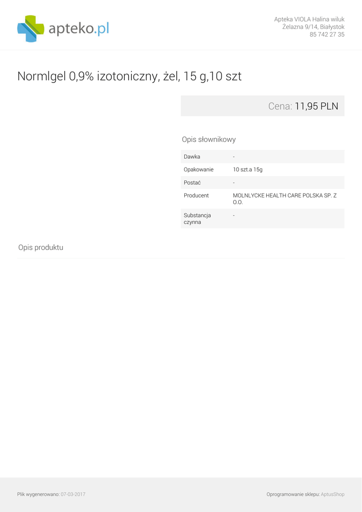 Apteka VIOLA Halina wiluk Żelazna 9/14, Białystok 85 742 27 35 Normlgel 0,9% izotoniczny, żel, 15 g,10 szt Cena: 11,95 PLN Opis słownikowy Dawka - Opakowanie 10 szt.a 15g Postać - Producent MOLNLYCKE HEALTH CARE POLSKA SP. Z O.O. Substancja czynna - Opis produktu Plik wygenerowano: 07-03-2017 Powered by TCPDF (www.tcpdf.org) Oprogramowanie sklepu: AptusShop