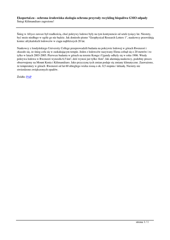 Ekoportal.eu - ochrona środowiska ekologia ochrona przyrody recykling biopaliwa GMO odpady Śniegi Kilimandżaro zagrożone! Śnieg w Afryce zawsze był rzadkością, choć pokrywy lodowe były na tym kontynencie od setek tysięcy lat. Niestety, być może niedługo w ogóle go nie będzie. Jak doniosło pismo "Geophysical Research Letters 1", naukowcy przewidują koniec afrykańskich lodowców w ciągu najbliższych 20 lat. Naukowcy z londyńskiego University College przeprowadzili badania na pokrywie lodowej w górach Rwenzori i okazało się, że śnieg cofa się w zaskakującym tempie. Jeden z lodowców nazywany Elena cofnął się o 20 metrów i to tylko w latach 2003-2005. Pierwsze badania w górach na terenie Konga i Ugandy odbyły się w roku 1906. Wtedy pokrywa lodowa w Rwenzori wynosiła 6,5 km2, dziś wynosi już tylko 1km2. Jak alarmują naukowcy, podobny proces obserwujemy na Mount Kenia i Kilimandżaro. Jako przyczynę tych zmian podaje się zmiany klimatyczne. Zauważono, że temperatury w górach Rwenzori od lat 60 ubiegłego wieku rosną o ok. 0,5 stopnia / dekadę. Niestety nie stwierdzono zwiększonych opadów. Źródło: PAP strona 1 / 1