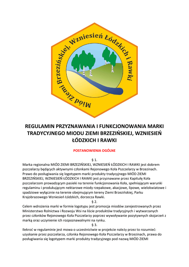 REGULAMIN PRZYZNAWANIA I FUNKCJONOWANIA MARKI TRADYCYJNEGO MIODU ZIEMI BRZEZIŃSKIEJ, WZNIESIEŃ ŁÓDZKICH I RAWKI POSTANOWIENIA OGÓLNE § 1. Marka regionalna MIÓD ZIEMI BRZEZIŃSKIEJ, WZNIESIEŃ ŁÓDZKICH I RAWKI jest dobrem pszczelarzy będących aktywnymi członkami Rejonowego Koła Pszczelarzy w Brzezinach. Prawo do posługiwania się logotypem marki produkty tradycyjnego MIÓD ZIEMI BRZEZIŃSKIEJ, WZNIESIEŃ ŁÓDZKICH I RAWKI jest przyznawane przez Kapitułę Koła pszczelarzom prowadzącym pasieki na terenie funkcjonowania Koła, spełniającym warunki regulaminu i produkującym nektarowe miody rzepakowe, akacjowe, lipowe, wielokwiatowe i spadziowe wyłącznie na terenie obejmującym tereny Ziemi Brzezińskiej, Parku Krajobrazowego Wzniesień Łódzkich, dorzecza Rawki. § 2. Celem wdrożenia marki w formie logotypu jest promocja miodów zarejestrowanych przez Ministerstwo Rolnictwa i Rozwoju Wsi na liście produktów tradycyjnych i wytwarzanych przez członków Rejonowego Koła Pszczelarzy poprzez wywoływanie pozytywnych skojarzeń z marką oraz uczynienie ich rozpoznawalnymi na rynku. § 3. Ilekroć w regulaminie jest mowa o uczestnictwie w projekcie należy przez to rozumieć: uzyskanie przez pszczelarza, członka Rejonowego Koła Pszczelarzy w Brzezinach, prawa do posługiwania się logotypem marki produkty tradycyjnego pod nazwą MIÓD ZIEMI BRZEZIŃSKIEJ, WZNIESIEŃ ŁÓDZKICH I RAWKI, umieszczania logo marki na produktach, materiałach reklamowych, siedzibie pasieki i innych materiałach służących komunikacji wyróżnionej pasieki z otoczeniem. § 4. 1. Organizatorem marki i logotypu i wyłącznym właścicielem praw majątkowych do logotypu marki jest Rejonowe Koło Pszczelarzy w Brzezinach. 2. Logotyp marki produktu tradycyjnego MIÓD ZIEMI BRZEZIŃSKIEJ, WZNIESIEŃ ŁÓDZKICH I RAWKI jest znakiem prawnie chronionym. § 5. 1. Projekt jest adresowany do pszczelarzy działających na terenie Ziemi Brzezińskiej, Wzniesień Łódzkich i dorzecza Rawki przez co najmniej dwa lata. 2. Uczestnikiem projektu jest pszczelarz prowadzący pasiekę i wprowadzający miody do sprzedaży, któremu Kapituła przyznała prawo do udziału w projekcie oraz który podpisał umowę licencyjną. 4. Uczestnictwo w projekcie jest nieodpłatne. § 6. 1. Prawo do posługiwania się logotypem marki produkty tradycyjnego MIÓD ZIEMI BRZEZIŃSKIEJ, WZNIESIEŃ ŁÓDZKICH I RAWKI przysługuje przez okres dwóch lat od momentu otrzymania certyfikatu lub potwierdzenia prawa do logotypu przez Kapitułę. 2. Po upływie tego okresu Kapituła rozważa możliwość przedłużenia prawa do posługiwania się logotypem marki produktu tradycyjnego MIÓD ZIEMI BRZEZIŃSKIEJ, WZNIESIEŃ ŁÓDZKICH I RAWKI na czas nieokreślony. § 7. Ogłoszenie prawa do posługiwania się logotypem marki produkty tradycyjnego MIÓD ZIEMI BRZEZIŃSKIEJ, WZNIESIEŃ ŁÓDZKICH I RAWKI odbywa się raz w roku. Zakończenie każdej edycji przyznania prawa do marki i logotypu następuje podczas zebrania, w trakcie którego ogłaszani są laureaci danej edycji. § 8. Podmioty uczestniczące w projekcie muszą wyrazić pisemną zgodę na przetwarzanie danych osobowych dla potrzeb postępowania weryfikacyjnego, zgodnie z ustawą z dnia 29 sierpnia 1997 r. o ochronie danych osobowych, (Dz. U. z 2002 r. nr 101, poz. 926 ze zm.). WARUNKI UDZIAŁU W PROJEKCIE MARKI PRODUKTU TRADYCYJNEGO MIÓD ZIEMI BRZEZIŃSKIEJ, WZNIESIEŃ ŁÓDZKICH I RAWKI § 9. 1. Warunkiem ubiegania się o przyznanie wyróżnienia marką produktu tradycyjnego MIÓD ZIEMI BRZEZIŃSKIEJ, WZNIESIEŃ ŁÓDZKICH I RAWKI jest prowadzenie działalności pasiecznej z siedzibą na terenie Ziemi Brzezińskiej, Wzniesień Łódzkich i dorzecza Rawki od co najmniej 24 miesięcy. 2. W projekcie nie mogą wziąć udziału pasieki lub gospodarstwa pszczelarskie, które znajdują się w stanie likwidacji lub upadłości, a także nie spełniające podstawowych wymagań prawnych i organizacyjnych dla prowadzenia pasieki. § 10. Pszczelarz prowadzący pasiekę może zgłosić swój udział w projekcie poprzez dostarczenie (przekazanie osobiście/pocztą oraz wysłanie mailem) wypełnionego formularza zgłoszenia rejestracyjnego, znajdującego się na stronie internetowej www.pszczelarze-brzeziny.pl wraz z załączonym zaświadczeniem o wpisie pasieki do ewidencji Powiatowego Lekarza Weterynarii i/lub innymi posiadanymi dokumentami potwierdzającymi standard pozyskiwanych miodów, ich jakość oraz stan sanitarny pracowni pasiecznej. Dopuszcza się zgłoszenia uzupełnione o materiał fotograficzny. § 11. 1.Warunkiem uczestnictwa w projekcie jest pozytywne przejście procesu weryfikacyjnego oraz akceptacja niniejszego regulaminu. 2. Weryfikacja zgłoszenia odbywa się na podstawie przesłanego zgłoszenia rejestracyjnego. Wniosek należy złożyć w języku polskim (wersja papierowa oraz elektroniczna). 3. Kapituła marki i logotypu dokonuje oceny zgłoszeń rejestracyjnych na podstawie informacji tam zawartych. W razie potrzeby może zwrócić się o złożenie stosownych wyjaśnień lub przedstawienie stosownych dokumentów potwierdzających dane. § 12. Kapituła marki i logotypu dokonuje oceny zgłoszeń rejestracyjnych. Kryteriami oceny są: 1) Kryterium formalne: a) siedziba pszczelarza prowadzącego pasiekę i wprowadzającego miody do sprzedaży musi być zlokalizowana na terenie Ziemi Brzezińskiej, Wzniesień Łódzkich i dorzecza Rawki, a ponadto pszczelarz prowadzący pasiekę musi prowadzić swoją działalność nie krócej niż 24 miesiące (dwa pełne sezony pasieczne). 2) Kryterium merytoryczne: a) oferowanie wysokiej jakości produktów przy zachowaniu szacunku dla ludzi i przyrody; b) osiąganie pozytywnych wyników jakościowych i ekonomicznych prowadzonej pasieki; c) działanie pasieki w oparciu o wysoki poziom kultury ekologicznej, wysoki poziom wiedzy pszczelarskiej, innowacyjność oraz poszanowanie tradycji regionu. § 13. Warunkiem uzyskania prawa do uży