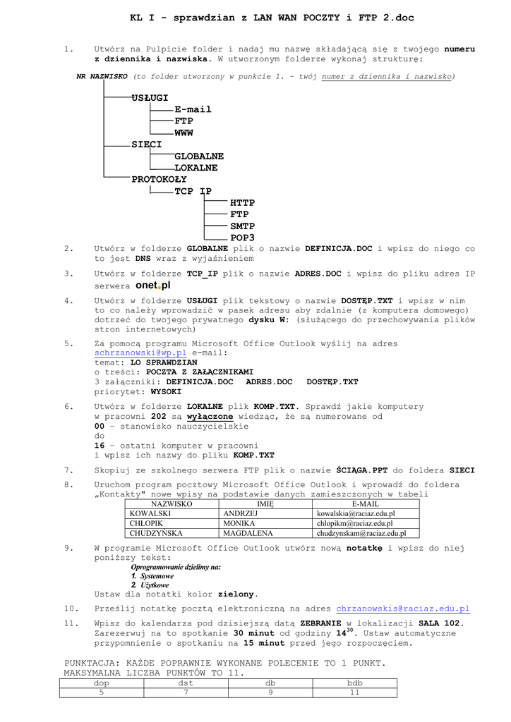 KL I - sprawdzian z LAN WAN POCZTY i FTP 2