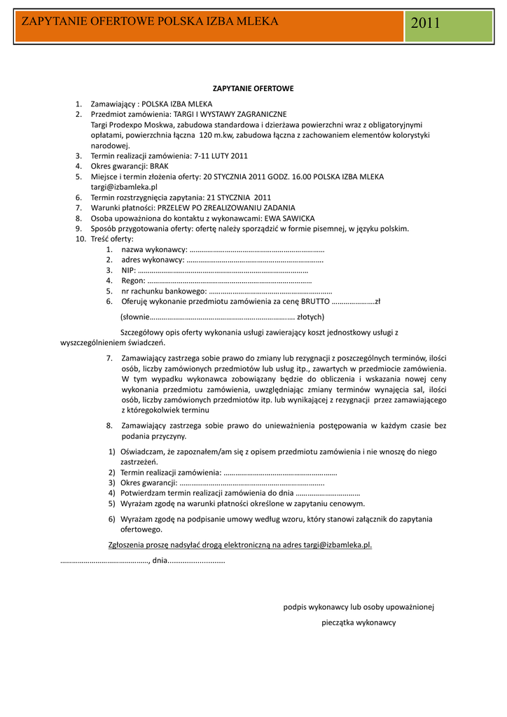 ZAPYTANIE OFERTOWE POLSKA IZBA MLEKA 2011 ZAPYTANIE OFERTOWE 1. 2. Zamawiający : POLSKA IZBA MLEKA Przedmiot zamówienia: TARGI I WYSTAWY ZAGRANICZNE Targi Prodexpo Moskwa, zabudowa standardowa i dzierżawa powierzchni wraz z obligatoryjnymi opłatami, powierzchnia łączna 120 m.kw, zabudowa łączna z zachowaniem elementów kolorystyki narodowej. 3. Termin realizacji zamówienia: 7-11 LUTY 2011 4. Okres gwarancji: BRAK 5. Miejsce i termin złożenia oferty: 20 STYCZNIA 2011 GODZ. 16.00 POLSKA IZBA MLEKA [email protected] 6. Termin rozstrzygnięcia zapytania: 21 STYCZNIA 2011 7. Warunki płatności: PRZELEW PO ZREALIZOWANIU ZADANIA 8. Osoba upoważniona do kontaktu z wykonawcami: EWA SAWICKA 9. Sposób przygotowania oferty: ofertę należy sporządzić w formie pisemnej, w języku polskim. 10. Treść oferty: 1. nazwa wykonawcy: …………………………………………………………… 2. adres wykonawcy: ……………………………………………………………. 3. NIP: …………………………………………………………………………… 4. Regon: ………………………………………………………………………… 5. nr rachunku bankowego: ……………………………………………………… 6. Oferuję wykonanie przedmiotu zamówienia za cenę BRUTTO ………………….zł (słownie…………………………………………………………….…. złotych) Szczegółowy opis oferty wykonania usługi zawierający koszt jednostkowy usługi z wyszczególnieniem świadczeń. 7. Zamawiający zastrzega sobie prawo do zmiany lub rezygnacji z poszczególnych terminów, ilości osób, liczby zamówionych przedmiotów lub usług itp., zawartych w przedmiocie zamówienia. W tym wypadku wykonawca zobowiązany będzie do obliczenia i wskazania nowej ceny wykonania przedmiotu zamówienia, uwzględniając zmiany terminów wynajęcia sal, ilości osób, liczby zamówionych przedmiotów itp. lub wynikającej z rezygnacji przez zamawiającego z któregokolwiek terminu 8. Zamawiający zastrzega sobie prawo do unieważnienia postępowania w każdym czasie bez podania przyczyny. 1) Oświadczam, że zapoznałem/am się z opisem przedmiotu zamówienia i nie wnoszę do niego zastrzeżeń. 2) Termin realizacji zamówienia: …………………………………………………. 3) Okres gwarancji: ……………………………………………………………….. 4) Potwierdzam termin realizacji zamówienia do dnia …………………………… 5) Wyrażam zgodę na warunki płatności określone w zapytaniu cenowym. 6) Wyrażam zgodę na podpisanie umowy według wzoru, który stanowi załącznik do zapytania ofertowego. Zgłoszenia proszę nadsyłać drogą elektroniczną na adres [email protected]. ………………………………………, dnia........................... podpis wykonawcy lub osoby upoważnionej pieczątka wykonawcy