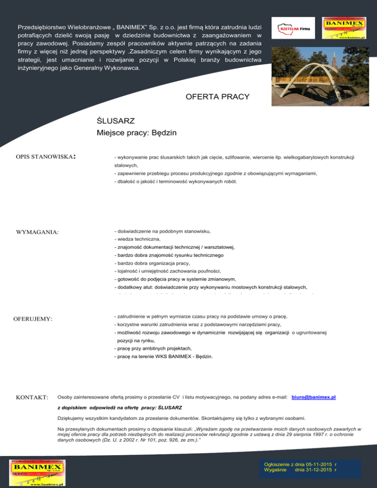 OFERUJEMY: , Przedsiębiorstwo Wielobranżowe „ BANIMEX” Sp. z o.o. jest firmą która zatrudnia ludzi potrafiących dzielić swoją pasję w dziedzinie budownictwa z zaangażowaniem w pracy zawodowej. Posiadamy zespół pracowników aktywnie patrzących na zadania firmy z więcej niż jednej perspektywy .Zasadniczym celem firmy wynikającym z jego strategii, jest umacnianie i rozwijanie pozycji w Polskiej branży budownictwa inżynieryjnego jako Generalny Wykonawca. OFERTA PRACY ŚLUSARZ Miejsce pracy: Będzin OPIS STANOWISKA: - wykonywanie prac ślusarskich takich jak cięcie, szlifowanie, wiercenie itp. wielkogabarytowych konstrukcji stalowych, - zapewnienie przebiegu procesu produkcyjnego zgodnie z obowiązującymi wymaganiami, - dbałość o jakość i terminowość wykonywanych robót. WYMAGANIA: - doświadczenie na podobnym stanowisku, - wiedza techniczna, - znajomość dokumentacji technicznej / warsztatowej, - bardzo dobra znajomość rysunku technicznego - bardzo dobra organizacja pracy, - lojalność i umiejętność zachowania poufności, - gotowość do podjęcia pracy w systemie zmianowym, technologia - dodatkowy atut: doświadczenie przy wykonywaniu mostowych konstrukcji stalowych, - dodatkowy atut: doświadczenie przy montażu wielkogabarytowych konstrukcji stalowych. OFERUJEMY: - zatrudnienie w pełnym wymiarze czasu pracy na podstawie umowy o pracę, - korzystne warunki zatrudnienia wraz z podstawowymi narzędziami pracy, - możliwość rozwoju zawodowego w dynamicznie rozwijającej się organizacji o ugruntowanej pozycji na rynku, - pracę przy ambitnych projektach, - pracę na terenie WKS BANIMEX - Będzin. KONTAKT: Osoby zainteresowane ofertą prosimy o przesłanie CV i listu motywacyjnego, na podany adres e-mail: [email protected] z dopiskiem odpowiedź na ofertę pracy: ŚLUSARZ Dziękujemy wszystkim kandydatom za przesłanie dokumentów. Skontaktujemy się tylko z wybranymi osobami. Na przesyłanych dokumentach prosimy o dopisanie klauzuli: „Wyrażam zgodę na przetwarzanie moich danych osobowych zawartych w mojej ofercie pracy dla potrzeb niezbędnych do realizacji procesów rekrutacji zgodnie z ustawą z dnia 29 sierpnia 1997 r. o ochronie danych osobowych (Dz. U. z 2002 r. Nr 101, poz. 926, ze zm.).” Ogłoszenie z dnia 05-11-2015 r Wygaśnie dnia 31-12-2015 r