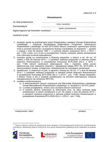 Załącznik nr 6 Oświadczenie Ja niżej podpisany/a ........................................................................................ (imię i nazwisko) Zamieszkały/a ........................................................................................ (adres zamieszkania) legitymujący/a się dowodem osobistym .................................................................... wydanym przez .................................................................................................. 1. wyrażam zgodę na przetwarzanie przez Województwo Lubelskie (Zarząd Województwa Lubelskiego – Instytucja Zarządzająca Regionalnym Programem Operacyjnym Województwa Lubelskiego na lata 2014-2020) danych osobowych ujawnionych przeze mnie w procesie tworzenia i prowadzenia Wykazu kandydatów na ekspertów, zgodnie z ustawą z dnia 29 sierpnia 1997 r. o ochronie danych osobowych (Dz.U. z 2014 r. poz. 1182, z późn. zm.) w tym w szczególności: imienia, nazwiska, adresu zamieszkania oraz informacji na temat wykształcenia. 2. wyrażam zgodę na umieszczenie w Wykazie ekspertów, o którym w art. 49 ust. 10 ustawy z dnia 29 sierpnia 2014 r. o zasadach realizacji programów w zakresie polityki spójności finansowanych w perspektywie finansowej 2014-2020 (Dz.U. z 2014 r., poz. 1146) danych osobowych obejmujących: imię i nazwisko, adres poczty elektronicznej oraz wskazanie dziedziny i specjalizacji objętej RPO WL 2014-2020, w której posiadam wiedzę, umiejętności, doświadczenie lub wymagane uprawnienia. 3. oświadczam, iż wiadomym mi jest, iż zgodnie z treścią art. 49 ust. 11 z dnia 29 sierpnia 2014 r. o zasadach realizacji programów w zakresie polityki spójności finansowanych w perspektywie finansowej 2014-2020 (Dz.U. z 2014 r., poz. 1146). Wykaz ekspertów, o którym mowa w pkt 2 zostanie opublikowany na stronach internetowych instytucji zaangażowanych we wdrażanie RPO WL. 4. zostałem poinformowany/a: a) iż administratorem danych osobowych jest Marszałek Województwa Lubelskiego (Urząd Marszałkowski Województwa Lubelskiego, ul. Spokojna 4, 20-074 Lublin) b) o prawie przeglądania, zmiany oraz usunięcia danych osobowych c) iż podanie danych osobowych je dobrowolne oraz, że dane osobowe będą przetwarzane w celach określonych w art. 49 ustawy z dnia 29 sierpnia 2014 r. o zasadach realizacji programów w zakresie polityki spójności finansowanych w perspektywie finansowej 2014-2020 (Dz.U. z 2014 r., poz. 1146). ....................................... (miejscowość, data)  ...................................... (podpis) Dotyczy danych osobowych ujawnionych przez eksperta w kwestionariuszach osobowych, oświadczeniach, wnioskach o aktualizację danych osobowych oraz innych dokumentach składanych przez kandydata na eksperta etc.