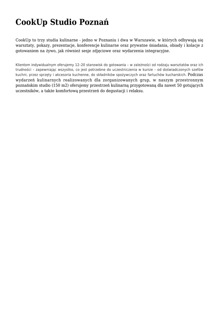 CookUp Studio Poznań CookUp to trzy studia kulinarne - jedno w Poznaniu i dwa w Warszawie, w których odbywają się warsztaty, pokazy, prezentacje, konferencje kulinarne oraz prywatne śniadania, obiady i kolacje z gotowaniem na żywo, jak również sesje zdjęciowe oraz wydarzenia integracyjne. Klientom indywidualnym oferujemy 12–20 stanowisk do gotowania – w zależności od rodzaju warsztatów oraz ich trudności – zapewniając wszystko, co jest potrzebne do uczestniczenia w kursie – od doświadczonych szefów kuchni, przez sprzęty i akcesoria kuchenne, do składników spożywczych oraz fartuchów kucharskich. Podczas wydarzeń kulinarnych realizowanych dla zorganizowanych grup, w naszym przestronnym poznańskim studio (150 m2) oferujemy przestrzeń kulinarną przygotowaną dla nawet 50 gotujących uczestników, a także komfortową przestrzeń do degustacji i relaksu.