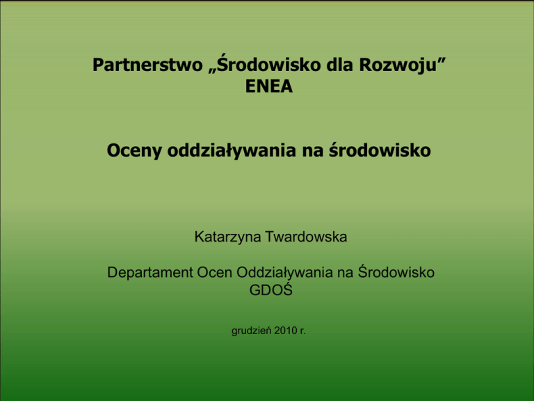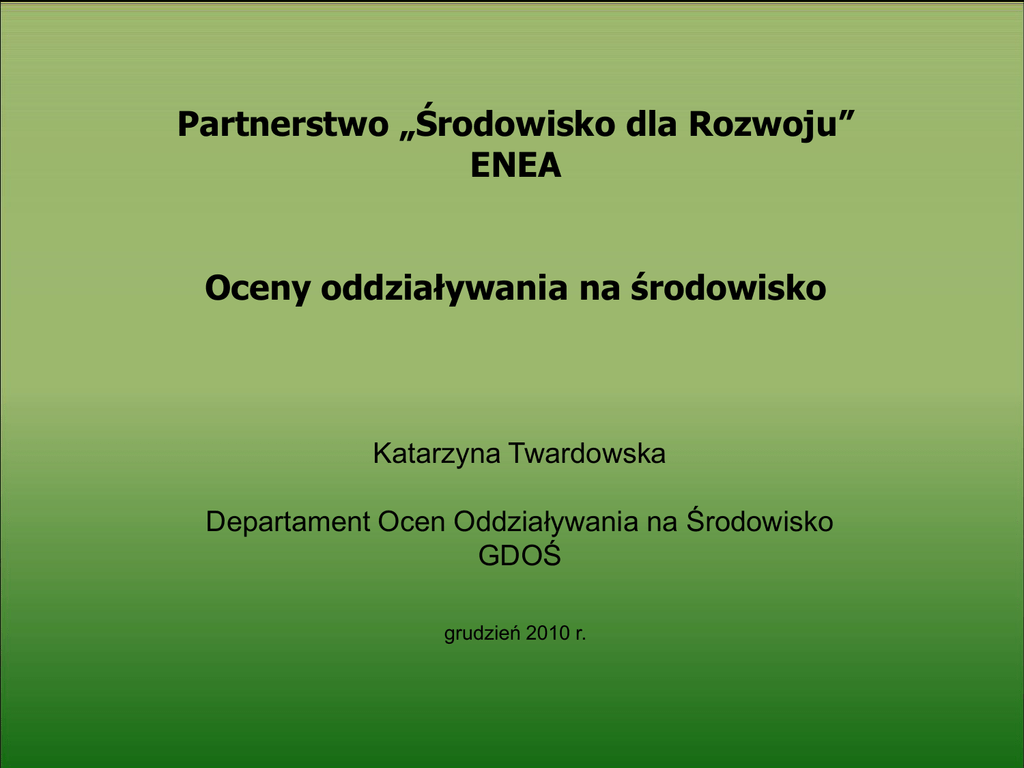 Partnerstwo „Środowisko dla Rozwoju” ENEA Oceny oddziaływania na środowisko Katarzyna Twardowska Departament Ocen Oddziaływania na Środowisko GDOŚ grudzień 2010 r. Projekty finansowane ze środków unijnych – wymagania „środowiskowe” • Rozporządzenie Rady (WE) nr 1083/2006 z dnia 11 lipca 2006 r. ustanawiające przepisy ogólne dotyczące Europejskiego Funduszu Rozwoju Regionalnego, Europejskiego Funduszu Społecznego oraz Funduszu Spójności i uchylające rozporządzenie (WE) nr 1260/1999: • „działalność funduszy oraz operacje, które pomagają one sfinansować powinny być spójne z innymi politykami Wspólnoty oraz przestrzegać prawodawstwa Wspólnoty”; „cele funduszy osiągane są w ramach zrównoważonego rozwoju oraz propagowania na poziomie Wspólnoty celu, jaki jest ochrona i poprawa jakości środowiska naturalnego określonego w art. 6 Traktatu”; w art. 52 wspomnianego rozporządzenia z 2006 r. określa się m.in., że: „Wkład funduszy może być kształtowany w świetle (…) ochrony i poprawy jakości środowiska naturalnego, przede wszystkim poprzez stosowanie zasady ostrożności, zasady działania zapobiegawczego oraz zasady „zanieczyszczający płaci”. • • Realizacja priorytetu ochrony środowiska przejawia się w nałożonym na każdego beneficjenta obowiązku przedkładania, wraz ze zgłaszanym projektem inwestycyjnym, dowodów na przeprowadzenie oceny oddziaływania na środowisko (OOŚ), zgodnie z odpowiednimi regulacjami prawnymi dyrektyw unijnych oraz przepisami prawa krajowego. 2 Wymagania dyrektyw unijnych i konwencji międzynarodowych • • • • • • • • Dyrektywa 2001/42/EC w sprawie oceny oddziaływania pewnych planów i programów na środowisko, Dyrektywa Rady 85/337/EWG w sprawie oceny skutków niektórych publicznych i prywatnych przedsięwzięć dla środowiska, znowelizowana Dyrektywą Rady 97/11/WE i Dyrektywą Rady 2003/35/WE, Dyrektywa 2003/4/WE w sprawie publicznego dostępu do informacji dotyczących środowiska i uchylająca dyrektywę Rady 90/313/EWG, Dyrektywa Rady 2003/35/WE ustanawiająca udział społeczeństwa w przygotowaniu niektórych planów i programów dotyczących środowiska oraz zmieniająca Dyrektywy Rady: 85/337/EWG i 96/61/WE w odniesieniu do udziału społeczeństwa i dostępu do sprawiedliwości Konwencja EKG ONZ o dostępie do informacji, udziale społeczeństwa w podejmowaniu decyzji oraz dostępie do sprawiedliwości w sprawach dotyczących środowiska, podpisana w Aarhus w 1998r. i ratyfikowana przez Polskę w 2001r. Konwencja EKG ONZ o ocenach oddziaływania na środowisko w kontekście transgranicznym, podpisana w 1991r. w Espoo i ratyfikowana przez Polskę w 1997r., Dyrektywa Rady 92/43/EWG o ochronie siedlisk przyrodniczych oraz dziko żyjącej fauny i flory z 1992 r. (zmieniona Dyrektywą 97/62/EWG) Dyrektywa Rady 79/409/EWG o ochronie dziko żyjących ptaków z 1979 r. (zmieniana późniejszymi dyrektywami) Realizacja projektów infrastrukturalnych – musi być zgodna z wymaganiami ochrony środowiska stawianymi przez Unię Europejską 3 Kluczowe akty prawa krajowego Ustawa z dnia 3 października 2008 r. o udostępnianiu informacji o środowisku i jego ochronie, udziale społeczeństwa w ochronie środowiska oraz o ocenach oddziaływania na środowisko (Dz. U. 199 poz. 1227 ze zm.) Ustawa o ochronie przyrody Ustawa - Prawo wodne Ustawa - Prawo geologiczne i górnicze Ustawa o lasach Ustawa o ochronie gruntów rolnych i leśnych Ustawa o odpadach Ustawa o planowaniu i zagospodarowaniu przestrzennym Ustawa - Prawo budowlane Ustawa o szczególnych zasadach przygotowywania i realizacji inwestycji w zakresie dróg publicznych Ustawa o szczególnych zasadach przygotowania i realizacji inwestycji w zakresie lotnisk użytku publicznego Ustawa o inwestycjach w zakresie terminalu regazyfikacyjnego skroplonego gazu ziemnego w Świnoujściu Ustawa o szczególnych zasadach przygotowania do realizacji inwestycji w zakresie budowli przeciwpowodziowych inne 4 System ocen oddziaływania na środowisko: • strategiczne oceny oddziaływania na środowisko (SOOŚ) • oceny oddziaływania przedsięwzięć na środowisko (OOŚ) • oceny oddziaływania przedsięwzięć na obszary Natura 2000 5 Dokumenty niezbędne do załączenia do wniosku o dofinansowanie, świadczące o przeprowadzonej OOŚ postanowienia scopingowe wraz z opiniami postanowienia screeningowe wraz z opiniami postanowienia uzgadniające RDOS i opinie właściwego organu PIS decyzje o środowiskowych uwarunkowaniach Inne decyzje, inne postanowienia wydane w toku oceny dokumentacja świadcząca o postępowaniu dotyczącym transgranicznego oddziaływania planowanego przedsięwzięcia na środowisko – jeżeli zostało przeprowadzone streszczenia raportu/ew. raport o oddziaływaniu na środowisko 6 JAKOŚĆ DOKUMENTACJI OOŚ JAKOŚĆ PROCEDUR OOŚ JAKOŚĆ DECYZJI ADMINISTRACYJNYCH CHARAKTER PROCEDUR ODWOŁAWCZYCH I SĄDOWOADMINISTRACYJNYCH EFEKTYWNOŚĆ PROCESU INWESTYCYJNEGO, CZAS JEGO TRWANIA, KOSZTY PROJEKTU SKUTECZNOŚĆ ABSORPCJI ŚRODKÓW UNIJNYCH 7 KTÓRY Z TYCH ELEMENTÓW TRZEBA POPRAWIĆ? • DZIAŁANIA GDOŚ • MOŻLIWE POLE DZIAŁANIA DLA GRUPY ROBOCZEJ OOŚ W RAMACH SIECI ENEA? 8 Departament Ocen Oddziaływania na Środowisko realizuje program priorytetowy pt. Wspieranie systemu ocen oddziaływania na środowisko i obszarów Natura 2000 Program finansowany jest ze środków Narodowego Funduszu Ochrony Środowiska i Gospodarki Wodnej Realizowany w latach 2010-2012 Obowiązuje od 1 lutego 2010 r. Cel Programu: Systemowe rozwiązanie poprawy standardów jakości prowadzonych postępowań i sporządzanej w ich toku dokumentacji Założenia Programu: • Wsparcie w zakresie kompleksowego ujęcia działań organów wykonujących zadania w zakresie procedury ooś • Realizacja Programu w skali całego kraju - systemowe podejście • Wypracowanie jednolitych zasad i dobrych praktyk prowadzenia ooś • Popraw