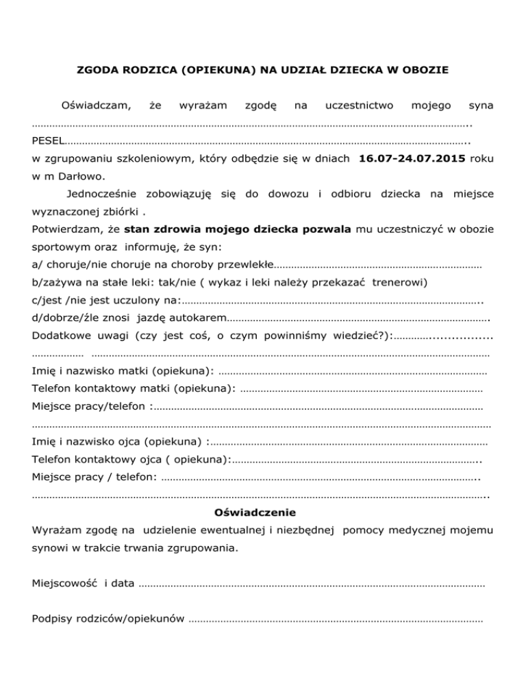 ZGODA RODZICA (OPIEKUNA) NA UDZIAŁ DZIECKA W OBOZIE Oświadczam, że wyrażam zgodę na uczestnictwo mojego syna …………………………………………………………………………………………………………………………………….. PESEL………………………………………………………………………………………………………………………….. w zgrupowaniu szkoleniowym, który odbędzie się w dniach 16.07-24.07.2015 roku w m Darłowo. Jednocześnie zobowiązuję się do dowozu i odbioru dziecka na miejsce wyznaczonej zbiórki . Potwierdzam, że stan zdrowia mojego dziecka pozwala mu uczestniczyć w obozie sportowym oraz informuję, że syn: a/ choruje/nie choruje na choroby przewlekłe……………………………………………………………… b/zażywa na stałe leki: tak/nie ( wykaz i leki należy przekazać trenerowi) c/jest /nie jest uczulony na:………………………………………………………………………………………….. d/dobrze/źle znosi jazdę autokarem………………………………………………………………………………. Dodatkowe uwagi (czy jest coś, o czym powinniśmy wiedzieć?):…………................. ……………… ………………………………………………………………………………………………………………………… Imię i nazwisko matki (opiekuna): ………………………………………………………………………………… Telefon kontaktowy matki (opiekuna): ………………………………………………………………………… Miejsce pracy/telefon :…………………………………………………………………………………………………… …………………………………………………………………………………………………………………………………………… Imię i nazwisko ojca (opiekuna) :…………………………………………………………………………………… Telefon kontaktowy ojca ( opiekuna):………………………………………………………………………….. Miejsce pracy / telefon: ……………………………………………………………………………………………….. ………………………………………………………………………………………………………………………………………….. Oświadczenie Wyrażam zgodę na udzielenie ewentualnej i niezbędnej pomocy medycznej mojemu synowi w trakcie trwania zgrupowania. Miejscowość i data ………………………………………………………………………………………………………… Podpisy rodziców/opiekunów …………………………………………………………………………………………