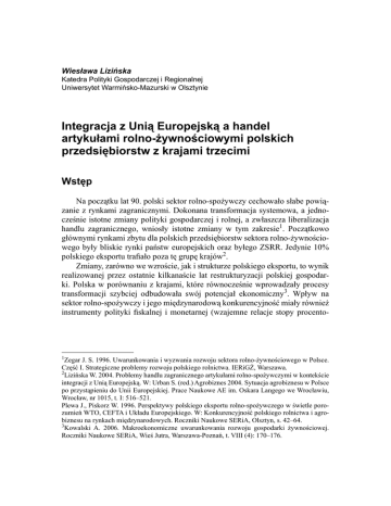 Wiesława Lizińska Katedra Polityki Gospodarczej i Regionalnej Uniwersytet Warmińsko-Mazurski w Olsztynie Integracja z Unią Europejską a handel artykułami rolno-żywnościowymi polskich przedsiębiorstw z krajami trzecimi Wstęp Na początku lat 90. polski sektor rolno-spożywczy cechowało słabe powiązanie z rynkami zagranicznymi. Dokonana transformacja systemowa, a jednocześnie istotne zmiany polityki gospodarczej i rolnej, a zwłaszcza liberalizacja handlu zagranicznego, wniosły istotne zmiany w tym zakresie1. Początkowo głównymi rynkami zbytu dla polskich przedsiębiorstw sektora rolno-żywnościowego były bliskie rynki państw europejskich oraz byłego ZSRR. Jedynie 10% polskiego eksportu trafiało poza tę grupę krajów2. Zmiany, zarówno we wzroście, jak i strukturze polskiego eksportu, to wynik realizowanej przez ostatnie kilkanaście lat restrukturyzacji polskiej gospodarki. Polska w porównaniu z krajami, które równocześnie wprowadzały procesy transformacji szybciej odbudowała swój potencjał ekonomiczny3. Wpływ na sektor rolno-spożywczy i jego międzynarodową konkurencyjność miały również instrumenty polityki fiskalnej i monetarnej (wzajemne relacje stopy procento- 1 Zegar J. S. 1996. Uwarunkowania i wyzwania rozwoju sektora rolno-żywnościowego w Polsce. Część I. Strategiczne problemy rozwoju polskiego rolnictwa. IERiGŻ, Warszawa. 2 Lizińska W. 2004. Problemy handlu zagranicznego artykułami rolno-spożywczymi w kontekście integracji z Unią Europejską. W: Urban S. (red.) Agrobiznes 2004. Sytuacja agrobiznesu w Polsce po przystąpieniu do Unii Europejskiej. Prace Naukowe AE im. Oskara Langego we Wrocławiu, Wrocław, nr 1015, t. I: 516–521. Plewa J., Piskorz W. 1996. Perspektywy polskiego eksportu rolno-spożywczego w świetle porozumień WTO, CEFTA i Układu Europejskiego. W: Konkurencyjność polskiego rolnictwa i agrobiznesu na rynkach międzynarodowych. Roczniki Naukowe SERiA, Olsztyn, s. 42–64. 3 Kowalski A. 2006. Makroekonomiczne uwarunkowania rozwoju gospodarki żywnościowej. Roczniki Naukowe SERiA, Wieś Jutra, Warszawa-Poznań, t. VIII (4): 170–176. 92 wej, kursu walutowego, nożyc cen w rolnictwie, poziom i struktura transferów budżetowych w różnych wariantach polityki gospodarczej)4. Po akcesji Polski do Unii Europejskiej rozwój polskich przedsiębiorstw przemysłu rolno-spożywczego stymulują nowe uwarunkowania. Niezaprzeczalnymi korzyściami były: swobodny przepływ towarów i siły roboczej, brak opłat celnych i kontroli granicznych przy eksporcie produktów do krajów unijnych. Jednak wzmożona konkurencja powoduje, że przedsiębiorstwa te muszą podnosić jakość oferowanych produktów oraz wdrażać nowoczesne technologie5. Przystąpienie Polski do UE oznaczało swobodny przepływ produktów w obrębie obszaru Wspólnoty, pod warunkiem jednak, że będą one odpowiadać wymogom bezpieczeństwa zdrowotnego6. W pierwszych latach członkostwa nastąpiła istotna poprawa efektywności przetwórstwa rolno-spożywczego, znacznemu przyspieszeniu uległa modernizacja przedsiębiorstw z sektora rolno-spożywczego, o czym może świadczyć rosnąca liczba zakładów uprawnionych do handlu na Jednolitym Rynku Europejskim7. Wspólna polityka handlowa oznaczała przekazanie przez Polskę organom Unii Europejskiej kompetencji w zakresie tworzenia systemu celnego, zawierania układów celnych i handlowych. Wszystkie te zmiany wpłynęły na poziom i zakres obrotów artykułami rolno-spożywczymi8. Istniejący w UE system subsydiowania eksportu rolnego, ograniczający nadwyżki na rynku unijnym poprzez ekspansję na rynki poza obszarem Wspólnoty, miał przyczynić się do odzyskania tradycyjnych rynków, utraconych w latach 90., głównie rynku rosyjskiego9. Kraje byłego ZSRR to trudne rynki zbytu, jednak mogące wchłonąć olbrzymią ilość towarów. Jednak według Kraciuka10 polscy eksporterzy mają większe szanse niż zachodni przedsiębiorcy ze względu na znajomość mentalności, kul4 Czyżewski A., Grzelak A. 2004. Makroekonomiczne wyznaczniki dostosowań rynkowych w sektorze rolnym w Polsce po 1990 r. W: Aktualne tendencje w międzynarodowych stosunkach gospodarczych w rolnictwie i w gospodarce żywnościowej. Problemy rolnictwa światowego. SGGW, Warszawa, t. XI: 52-63. 5 Zuzek D. K. 2006. Znaczenie jakości w konkurencyjności małych i średnich przedsiębiorstw przemysłu spożywczego. Roczniki Naukowe SERiA, Tom VIII, Zeszyt 2, Warszawa, s. 262. 6 Seremak-Bulge J. 2003. Wpływ Wspólnej Polityki Rolnej na polski sektor żywnościowy. Przemysł Spożywczy, nr 9, s. 2–8. 7 Polskie rolnictwo – dwa lata po akcesji do UE. 2006. SAEPR, Warszawa. 8 Kacperska E.M. 2005. Zmiany w handlu artykułami rolno-spożywczymi po przystąpieniu Polski do Unii Europejskiej. W: Urban S. (red.) Agrobiznes 2005. Zmiany w agrobiznesie po przystąpieniu Polski do Unii Europejskiej. Prace naukowe AE im. Oskara Langego we Wrocławiu, Wrocław, nr 1070, t. I: 377–383. 9 Grabowski T. 2002. Unia Europejska. Ekonomiczne mechanizmy integracji. NOVUM, Płock. 10 Kraciuk J. 2003. Wybrane aspekty obrotów towarowych z rynkami wschodnimi ze szczególnym uwzględnieniem artykułów rolno-spożywczych. Roczniki Naukowe SERiA, Wieś Jutra, Warszawa-Poznań-Koszalin, t. V (3): 68–74. 93 tury, czy języka konsumentów z tej grupy krajów. W latach 90. do Unii Europejskiej kierowano prawie połowę polskiego eksportu produktów rolno-spożywczych. Mimo to znaczący był również eksport tych produktów do Wspólnoty Niepodległych Państw, który w pierwszej połowie lat 90. zwiększył się blisko dwukrotnie. Kryzys ekonomiczny w Rosji w 1998 r. wpłynął na spadek znaczenia krajów WNE w polskim eksporcie tych artykułów, głównie z powodu zatorów płatniczych i barier popytu. Zaczęto wówczas szukać nowych rynków zbytu w krajach UE, CEFTA oraz krajach rozwijających się11. Po wprowadzeniu przez Rosję w 2004 r. zakazu importu