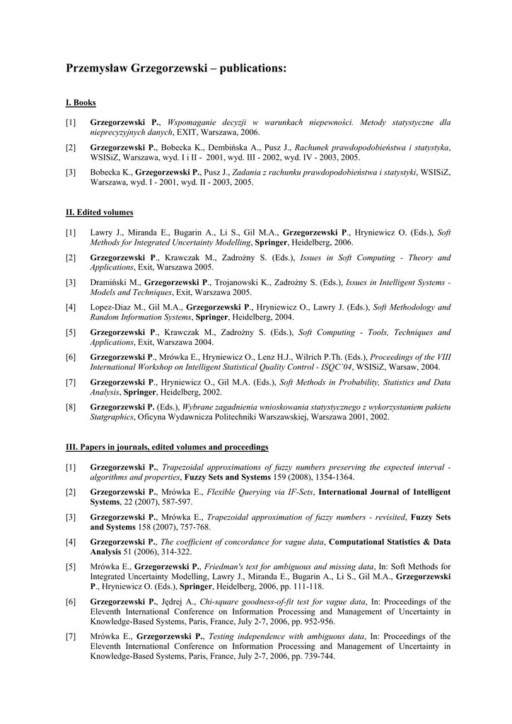Przemysław Grzegorzewski – publications: I. Books [1] Grzegorzewski P., Wspomaganie decyzji w warunkach niepewności. Metody statystyczne dla nieprecyzyjnych danych, EXIT, Warszawa, 2006. [2] Grzegorzewski P., Bobecka K., Dembińska A., Pusz J., Rachunek prawdopodobieństwa i statystyka, WSISiZ, Warszawa, wyd. I i II - 2001, wyd. III - 2002, wyd. IV - 2003, 2005. [3] Bobecka K., Grzegorzewski P., Pusz J., Zadania z rachunku prawdopodobieństwa i statystyki, WSISiZ, Warszawa, wyd. I - 2001, wyd. II - 2003, 2005. II. Edited volumes [1] Lawry J., Miranda E., Bugarin A., Li S., Gil M.A., Grzegorzewski P., Hryniewicz O. (Eds.), Soft Methods for Integrated Uncertainty Modelling, Springer, Heidelberg, 2006. [2] Grzegorzewski P., Krawczak M., Zadrożny S. (Eds.), Issues in Soft Computing - Theory and Applications, Exit, Warszawa 2005. [3] Dramiński M., Grzegorzewski P., Trojanowski K., Zadrożny S. (Eds.), Issues in Intelligent Systems Models and Techniques, Exit, Warszawa 2005. [4] Lopez-Diaz M., Gil M.A., Grzegorzewski P., Hryniewicz O., Lawry J. (Eds.), Soft Methodology and Random Information Systems, Springer, Heidelberg, 2004. [5] Grzegorzewski P., Krawczak M., Zadrożny S. (Eds.), Soft Computing - Tools, Techniques and Applications, Exit, Warszawa 2004. [6] Grzegorzewski P., Mrówka E., Hryniewicz O., Lenz H.J., Wilrich P.Th. (Eds.), Proceedings of the VIII International Workshop on Intelligent Statistical Quality Control - ISQC’04, WSISiZ, Warsaw, 2004. [7] Grzegorzewski P., Hryniewicz O., Gil M.A. (Eds.), Soft Methods in Probability, Statistics and Data Analysis, Springer, Heidelberg, 2002. [8] Grzegorzewski P. (Eds.), Wybrane zagadnienia wnioskowania statystycznego z wykorzystaniem pakietu Statgraphics, Oficyna Wydawnicza Politechniki Warszawskiej, Warszawa 2001, 2002. III. Papers in journals, edited volumes and proceedings [1] Grzegorzewski P., Trapezoidal approximations of fuzzy numbers preserving the expected interval algorithms and properties, Fuzzy Sets and Systems 159 (2008), 1354-1364. [2] Grzegorzewski P., Mrówka E., Flexible Querying via IF-Sets, International Journal of Intelligent Systems, 22 (2007), 587-597. [3] Grzegorzewski P., Mrówka E., Trapezoidal approximation of fuzzy numbers - revisited, Fuzzy Sets and Systems 158 (2007), 757-768. [4] Grzegorzewski P., The coefficient of concordance for vague data, Computational Statistics & Data Analysis 51 (2006), 314-322. [5] Mrówka E., Grzegorzewski P., Friedman's test for ambiguous and missing data, In: Soft Methods for Integrated Uncertainty Modelling, Lawry J., Miranda E., Bugarin A., Li S., Gil M.A., Grzegorzewski P., Hryniewicz O. (Eds.), Springer, Heidelberg, 2006, pp. 111-118. [6] Grzegorzewski P., Jędrej A., Chi-square goodness-of-fit test for vague data, In: Proceedings of the Eleventh International Conference on Information Processing and Management of Uncertainty in Knowledge-Based Systems, Paris, France, July 2-7, 2006, pp. 952-956. [7] Mrówka E., Grzegorzewski P., Testing independence with ambiguous data, In: Proceedings of the Eleventh International Conference on Information Processing and Management of Uncertainty in Knowledge-Based Systems, Paris, France, July 2-7, 2006, pp. 739-744. [8] Grzegorzewski P., Mrówka E., Optimal process calibration under nonsymmetric loss function, In: Frontiers in Statistical Quality Control, Lenz H. J., Wilrich P. Th. (Eds.), Springer, Physica-Verlag, 2006, pp. 309-321. [9] Mrówka E., Grzegorzewski P., The Fréchet control charts, In: Frontiers in Statistical Quality Control, Lenz H. J., Wilrich P. Th. (Eds.), Springer, Physica-Verlag, 2006, pp. 123-135. [10] Grzegorzewski P., Mrówka E., Some notes on Atanassov’s intuitionistic fuzzy sets, Fuzzy Sets and Systems 156 (2005), 492-495. [11] Grzegorzewski P., Mrówka E., Trapezoidal approximations of fuzzy numbers, Fuzzy Sets and Systems 153 (2005), 115-135. [12] Mrówka E., Grzegorzewski P., Fuzzy numbers and their approximations, In: Issues in Soft Computing - Decisions and Operations Research, Hryniewicz O., Kacprzyk J., Kuchta D. (Eds.), EXIT, Warszawa 2005, pp. 53-69. [13] Grzegorzewski P., Two-sample median test for vague data, In: Proceedings of the 4th Conference of the European Society for Fuzzy Logic and Technology - Eusflat 2005, Barcelona, September 7-9, 2005, pp. 621-626. [14] Mrówka E., Grzegorzewski P., Friedman's test with missing observations, In: Proceedings of the 4th Conference of the European Society for Fuzzy Logic and Technology - Eusflat 2005, Barcelona, September 7-9, 2005, pp. 627-632. [15] Grzegorzewski P., On measuring distances between intuitionistic fuzzy sets, In: Issues in Intuitionistic Fuzzy Sets and Generalized Nets, Atanassov A., Kacprzyk J., Krawczak M. (Eds.), Vol. 2, Wyd. WSISiZ, Warszawa 2004, pp. 107-115. [16] Grzegorzewski P., Distances Between Intuitionistic Fuzzy Sets and/or Interval-Valued Fuzzy Sets Based on the Hausdorff Metric, Fuzzy Sets and Systems 148 (2004), 319-328. [17] Grzegorzewski P., Distribution-Free Tests for Vague Data, In: Soft Methodology and Random Information Systems, Lopez-Diaz M., Gil M.A., Grzegorzewski P., Hryniewicz O., Lawry J. (Eds.), Springer, Heidelberg, 2004, pp. 495-502. [18] Grzegorzewski P., The Generalized Coefficient of Concordance, In: Current Issues in Data and Knowledge Engineering, De Baets B., De Caluwe R., De Tre G., Fodor J., Kacprzyk J., Zadrożny S. (Eds.), Exit, Warszawa, 2004, pp. 241-251. [19] Grzegorzewski P., Mrówka E., Intuitionistic Fuzzy Events and their Probabilities, In: Issues in Intuitionistic Fuzzy Sets and Generalized Nets, Atanassov A., Kacprzyk J., Krawczak M. (Eds.), Wyd. WSISiZ, Warszawa 2004, pp. 117-123. [20] Grzegorzewski P., Intuitionistic Fuzzy Numbers - Principles, Metrics and Ranking, In: Soft Computing - Foundations and Theoretical Aspects, Atanassov K.T., Hryniewicz O., Kacprzyk J. (Eds.), Exit, Warszawa 2004, pp. 235-249. [21] Grzegorzewski P., Mrówka E., Regression Analysis with Fuzzy Data, In: Soft Com