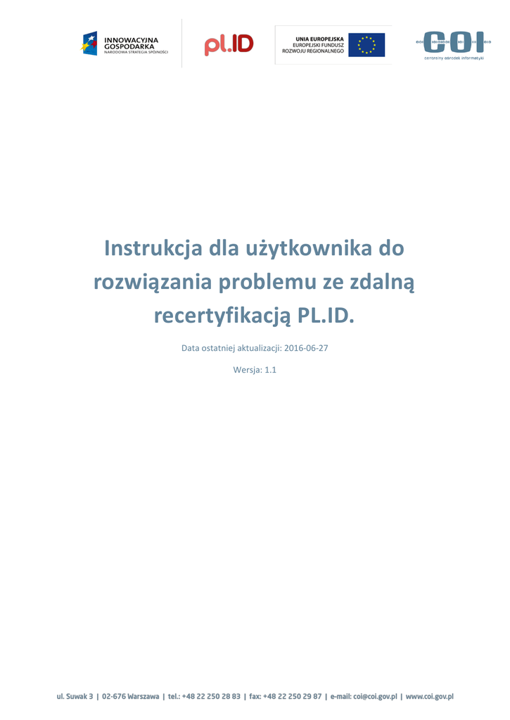 Instrukcja dla użytkownika do rozwiązania problemu ze zdalną recertyfikacją PL.ID. Data ostatniej aktualizacji: 2016-06-27 Wersja: 1.1 Wstęp Dokument ten przygotowany jest dla użytkowników w celu rozwiązania problemu ze zdalną recertyfikacją kart PL.ID. W celu wykonani poniższych procedur należy posiadać uprawnienia Administratora na koncie. Instrukcja postępowania w celu rozwiązania problemu ze zdalną recertyfikacją kart PL.ID. W celu przeprowadzenia zdalnej recertyfikacji należy wykonać następujące kroki: 1. 2. 3. 4. 5. 6. 7. 8. 9. Rozpakowujemy plik ca_U_SRP z certyfikatem. Uruchamiamy certyfikat ca_U_SRP Uruchomi się okno certyfikatu wybieramy przycisk „Zainstaluj certyfikat” W oknie Kreatora importu certyfikatu należy kliknąć przycisk „Dalej” Zaznaczamy pole wyboru Umieść wszystkie certyfikaty w następującym magazynie a następnie przycisk „Przeglądaj”. Zaznaczamy „Zaufane główne urzędy certyfikacji” a następnie przycisk „OK” i przycisk „Dalej”. W kolejnym oknie kreatora kończącym instalację klikamy przycisk „Zakończ”. Pojawi się strona informująca o instalacji certyfikatu, potwierdzamy przyciskiem „Tak”. Pojawia się informacja o pomyślnym imporcie certyfikatu. Potwierdzamy przyciskiem „OK”. Certyfikat jest zainstalowany. Odświeżamy przeglądarkę i możemy dokonać recertyfikacji, odblokowania karty. W przypadku problemów z powyższą instrukcją lub jeśli po jej wykonaniu pojawią się jakieś problemy, prosimy o kontakt z Service Desk programu PL.ID pod numerem telefonu 42 253 54 99. Strona 2 z 2