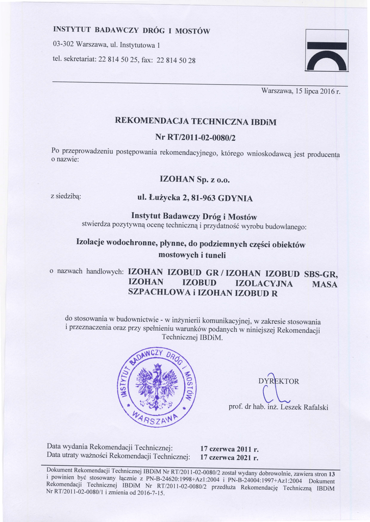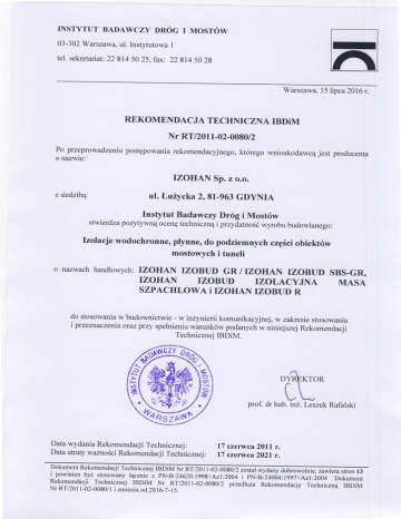 INsTYTUT BADAwCZY DRÓG I MoSTow 03-302 Warszawa, ul. Instytutowa I tel. sekretariat:22814 50 25, fax: 22 gl4 50 2g Warszawa,15lipca 2016r. REKOMEIIDACJA TECHNICZNA IBDiM Nr RT/2011-02-0080t2 Po przeprowadzeniu postępowania rekomendacyjnego, którego wnioskodawcą jest producenta o nazwie: IZOHAN Sp. z o.o. z siedzibą ul. ŁuĘcka 2,81.963 GDYNIA InsĘtut Badawczy Dróg i Mostów stwierdza pozytywną ocenę techniczną i przydatnośćwyrobu budowlanego: Izolacje wodochronne, pĘnne, do podziemnych częściobiektów mostowych i tuneli o nazwachhandlowych: IZOIJ.AN IZOBUD GR TIZO'"AN IZOBUD IZOHAN IZOBUD IZOLACYJNA SZPACHLOWA |IZOH.AN IZOBUD R SBS-GR, MASA do stosowania w budownictwie - w inżynierii komunikacyjnej' w zakresie stosowania i przeznaczenia oraz przy spełnieniuwarunków podanycń w niniejszej Rekomendacji TechnicznejIBDiM. Ą DYREKTOR u \^, (\ prof. dr hab. inŻ. Leszek Rafalski Data wydania Rekomendacji Technicznej: Data utraty ważnościRekomendacji Techni cznej: 17 czerwca20ll r. |7 czerwca 2021 r. R:-komendacj i rechnicznejrB DiM Nr Rr/ P:::T-.1 I powlnlenbyć stosowany łączniez PN-B-24620:l998+Azl:2O04 i pN-s-złoół:1997+Az|:2OO4 Dokument Rekomendacji Technicznej IBDiM Nr RT/20l |-O2-O08O/2przedłuŻaRekomendację Technicmą IBDiM Nr RT/2011-02-0080/l i zrnieniaod}Ot6-7_15. INSTYTUT BADAWCZY DRÓG I MOSTÓW 03-302 Warszawa, ul. Instytutowa 1 tel. sekretariat: 22 814 50 25, fax: 22 814 50 28 _______________________________________________________________________________________ Warszawa, 15 lipca 2016 r. REKOMENDACJA TECHNICZNA IBDiM Nr RT/2011-02-0080/2 Po przeprowadzeniu postępowania rekomendacyjnego, którego wnioskodawcą jest producenta o nazwie: IZOHAN Sp. z o.o. z siedzibą: ul. Łużycka 2, 81-963 GDYNIA Instytut Badawczy Dróg i Mostów stwierdza pozytywną ocenę techniczną i przydatność wyrobu budowlanego: Izolacje wodochronne, płynne, do podziemnych części obiektów mostowych i tuneli o nazwach handlowych: IZOHAN IZOBUD GR / IZOHAN IZOBUD SBS-GR, IZOHAN IZOBUD IZOLACYJNA SZPACHLOWA i IZOHAN IZOBUD R MASA do stosowania w budownictwie - w inżynierii komunikacyjnej, w zakresie stosowania i przeznaczenia oraz przy spełnieniu warunków podanych w niniejszej Rekomendacji Technicznej IBDiM. DYREKTOR prof. dr hab. inż. Leszek Rafalski Data wydania Rekomendacji Technicznej: Data utraty ważności Rekomendacji Technicznej: 17 czerwca 2011 r. 17 czerwca 2021 r. Dokument Rekomendacji Technicznej IBDiM Nr RT/2011-02-0080/2 został wydany dobrowolnie, zawiera stron 13 i powinien być stosowany łącznie z PN-B-24620:1998+Az1:2004 i PN-B-24004:1997+Az1:2004 Dokument Rekomendacji Technicznej IBDiM Nr RT/2011-02-0080/2 przedłuża Rekomendację Techniczną IBDiM Nr RT/2011-02-0080/1 i zmienia od 2016-7-15. Rekomendacja Techniczna IBDiM Nr RT/2011-02-0080/2 Strona 2/13 1 CHARAKTER REKOMENDACJI TECHNICZNEJ Rekomendacja techniczna Nr RT/2011-02-0080/2 jest dokumentem wydanym dobrowolnie, rekomendującym wyrób budowlany: Izolacje wodochronne, płynne, do podziemnych części obiektów mostowych i tuneli: - - IZOHAN IZOBUD GR / IZOHAN IZOBUD SBS-GR, IZOHAN IZOBUD IZOLACYJNA MASA SZPACHLOWA produkowane na podstawie PN-B-24620:1998+Az1:2004 Lepiki, masy i roztwory asfaltowe stosowane na zimno; IZOHAN IZOBUD R produkowany na podstawie PN-B-24004:1997+Az1:2004 Masa asfaltowo-aluminiowa. 2 NAZWA TECHNICZNA I NAZWA HANDLOWA ORAZ IDENTYFIKACJA TECHNICZNA WYROBU BUDOWLANEGO 2.1 Nazwa techniczna i nazwa handlowa Na podstawie § 5 ust. 1 rozporządzenia Instytut Badawczy Dróg i Mostów określił następującą nazwę techniczną: Izolacje wodochronne, płynne, do podziemnych części obiektów mostowych i tuneli i nazwy handlowe: IZOHAN IZOBUD GR / IZOHAN IZOBUD SBS-GR, IZOHAN IZOBUD IZOLACYJNA MASA SZPACHLOWA, IZOHAN IZOBUD R wyrobów budowlanych, zwanych dalej: wyrobami IZOHAN 2.2 Określenie i adres wnioskodawcy Wnioskodawcą jest producent o nazwie i z siedzibą, które zostały określone na stronie 1/13 niniejszej Rekomendacji Technicznej. 2.3 Miejsce produkcji wyrobu budowlanego Wyroby są produkowane w: Zakładzie Produkcyjnym w Pomieczynie z siedzibą: ul. Spacerowa 26, 83-305 Pomieczyno. 2.4 Identyfikacja techniczna wyrobu budowlanego Przedmiotem Rekomendacji Technicznej są następujące wyroby IZOHAN: - IZOHAN IZOBUD GR / IZOHAN IZOBUD SBS-GR – jednoskładnikowa asfaltowa masa powłokowa, stanowiąca kompozycję asfaltów, żywic syntetycznych, polimerów i rozpuszczalnika organicznego oraz dodatków mineralnych, stosowana na zimno, występująca pod dwoma nazwami handlowymi: IZOHAN IZOBUD GR albo IZOHAN IZOBUD SBS-GR, zwana dalej masą IZOHAN IZOBUD GR, spełniająca wymagania normy PN-B-24620:1998+Az1:2004; - IZOHAN IZOBUD IZOLACYJNA MASA SZPACHLOWA – jednoskładnikowa asfaltowa masa, stanowiąca kompozycję asfaltu, polimerów i rozpuszczalnika organicznego zawierająca włókna z tworzyw sztucznych, stosowana na zimno, zwana dalej masą IZOHAN IZOBUD, spełniająca wymagania normy PN-B-24620:1998+Az1:2004; Rekomendacja Techniczna IBDiM Nr RT/2011-02-0080/2 - Strona 3/13 IZOHAN IZOBUD R – jednoskładnikowa, masa asfaltowo-aluminiowa w postaci refleksyjnego lakieru, stanowiąca kompozycję asfaltów, polimerów i pigmentu aluminiowego w postaci płatków, stosowana na zimno, zwana dalej masą IZOHAN IZOBUD R, spełniająca wymagania normy PN-B-24004:1997+Az1:2004. 3 PRZEZNACZENIE, BUDOWLANEGO ZAKRES I WARUNKI STOSOWANIA WYROBU 3.1 Przeznaczenie Masa IZOHAN IZOBUD GR jest przeznaczona w inżynierii komunikacyjnej do wykonywania bezspoinowych, powłok przeciwwilgociowych i przeciwwodnych typu lekkiego na powierzchniach elementów betonowych, pionowych i poziomych, poniżej poziomu gruntu, zagruntowanych roztworem IZOHAN IZOBUD Br lub IZOHAN IZOBUD PENETRATOR G7. Masa IZOHAN IZOBUD jest przeznaczona do wykonywania grubowarstwowych, bezspoinowych powłok przeciwwodnych wszystkich typów, na powierzchniach elementów betonowych, pionowych i poziomych, poniż