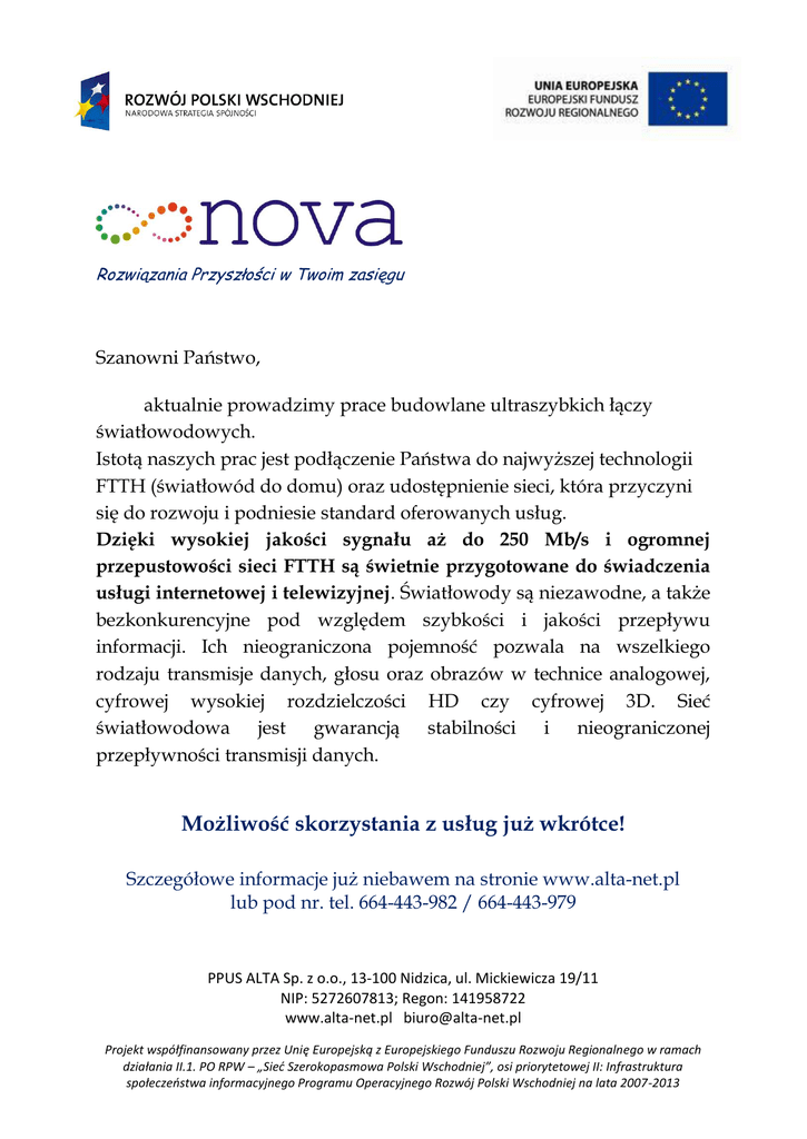 Rozwiązania Przyszłości w Twoim zasięgu Szanowni Państwo, aktualnie prowadzimy prace budowlane ultraszybkich łączy światłowodowych. Istotą naszych prac jest podłączenie Państwa do najwyższej technologii FTTH (światłowód do domu) oraz udostępnienie sieci, która przyczyni się do rozwoju i podniesie standard oferowanych usług. Dzięki wysokiej jakości sygnału aż do 250 Mb/s i ogromnej przepustowości sieci FTTH są świetnie przygotowane do świadczenia usługi internetowej i telewizyjnej. Światłowody są niezawodne, a także bezkonkurencyjne pod względem szybkości i jakości przepływu informacji. Ich nieograniczona pojemność pozwala na wszelkiego rodzaju transmisje danych, głosu oraz obrazów w technice analogowej, cyfrowej wysokiej rozdzielczości HD czy cyfrowej 3D. Sieć światłowodowa jest gwarancją stabilności i nieograniczonej przepływności transmisji danych. Możliwość skorzystania z usług już wkrótce! Szczegółowe informacje już niebawem na stronie www.alta-net.pl lub pod nr. tel. 664-443-982 / 664-443-979 PPUS ALTA Sp. z o.o., 13-100 Nidzica, ul. Mickiewicza 19/11 NIP: 5272607813; Regon: 141958722 www.alta-net.pl [email protected] Projekt współfinansowany przez Unię Europejską z Europejskiego Funduszu Rozwoju Regionalnego w ramach działania II.1. PO RPW – „Sieć Szerokopasmowa Polski Wschodniej”, osi priorytetowej II: Infrastruktura społeczeństwa informacyjnego Programu Operacyjnego Rozwój Polski Wschodniej na lata 2007-2013