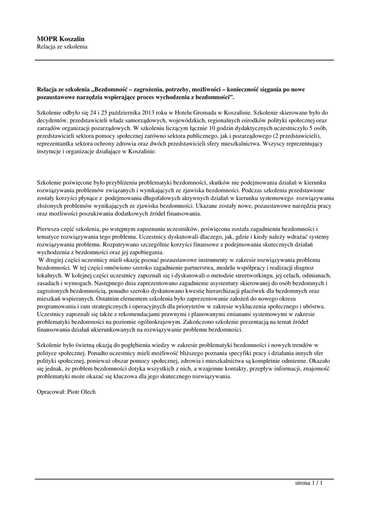 MOPR Koszalin Relacja ze szkolenia Relacja ze szkolenia „Bezdomność – zagrożenia, potrzeby, możliwości – konieczność sięgania po nowe pozaustawowe narzędzia wspierające proces wychodzenia z bezdomności”. Szkolenie odbyło się 24 i 25 października 2013 roku w Hotelu Gromada w Koszalinie. Szkolenie skierowane było do decydentów, przedstawicieli władz samorządowych, wojewódzkich, regionalnych ośrodków polityki społecznej oraz zarządów organizacji pozarządowych. W szkoleniu liczącym łącznie 10 godzin dydaktycznych uczestniczyło 5 osób, przedstawicieli sektora pomocy społecznej zarówno sektora publicznego, jak i pozarządowego (2 przedstawicieli), reprezentantka sektora ochrony zdrowia oraz dwóch przedstawicieli sfery mieszkalnictwa. Wszyscy reprezentujący instytucje i organizacje działające w Koszalinie. Szkolenie poświęcone było przybliżeniu problematyki bezdomności, skutków nie podejmowania działań w kierunku rozwiązywania problemów związanych i wynikających ze zjawiska bezdomności. Podczas szkolenia przedstawione zostały korzyści płynące z podejmowania długofalowych aktywnych działań w kierunku systemowego rozwiązywania złożonych problemów wynikających ze zjawiska bezdomności. Ukazane zostały nowe, pozaustawowe narzędzia pracy oraz możliwości poszukiwania dodatkowych źródeł finansowania. Pierwsza część szkolenia, po wstępnym zapoznaniu uczestników, poświęcona została zagadnieniu bezdomności i tematyce rozwiązywania tego problemu. Uczestnicy dyskutowali dlaczego, jak, gdzie i kiedy należy wdrażać systemy rozwiązywania problemu. Rozpatrywano szczególnie korzyści finansowe z podejmowania skutecznych działań wychodzenia z bezdomności oraz jej zapobiegania. W drugiej części uczestnicy mieli okazję poznać pozaustawowe instrumenty w zakresie rozwiązywania problemu bezdomności. W tej części omówiono szeroko zagadnienie partnerstwa, modelu współpracy i realizacji diagnoz lokalnych. W kolejnej części uczestnicy zapoznali się i dyskutowali o metodzie streetworkingu, jej celach, odmianach, zasadach i wymogach. Następnego dnia zaprezentowano zagadnienie asystentury skierowanej do osób bezdomnych i zagrożonych bezdomnością, ponadto szeroko dyskutowano kwestię hierarchizacji placówek dla bezdomnych oraz mieszkań wspieranych. Ostatnim elementem szkolenia było zaprezentowanie założeń do nowego okresu programowania i ram strategicznych i operacyjnych dla priorytetów w zakresie wykluczenia społecznego i ubóstwa. Uczestnicy zapoznali się także z rekomendacjami prawnymi i planowanymi zmianami systemowymi w zakresie problematyki bezdomności na poziomie ogólnokrajowym. Zakończono szkolenie prezentacją na temat źródeł finansowania działań ukierunkowanych na rozwiązywanie problemu bezdomności. Szkolenie było świetną okazją do pogłębienia wiedzy w zakresie problematyki bezdomności i nowych trendów w polityce społecznej. Ponadto uczestnicy mieli możliwość bliższego poznania specyfiki pracy i działania innych sfer polityki społecznej, ponieważ obszar pomocy społecznej, zdrowia i mieszkalnictwa są kompletnie odmienne. Okazało się jednak, że problem bezdomności dotyka wszystkich z nich, a wzajemne kontakty, przepływ informacji, znajomość problematyki może okazać się kluczowa dla jego skutecznego rozwiązywania. Opracował: Piotr Olech strona 1 / 1